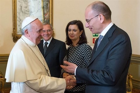 S.S. Francesco saluta il Presidente del Consiglio Enrico Letta, al centro i Presidente di Senato e Camera Piero Grasso e Laura Boldrini