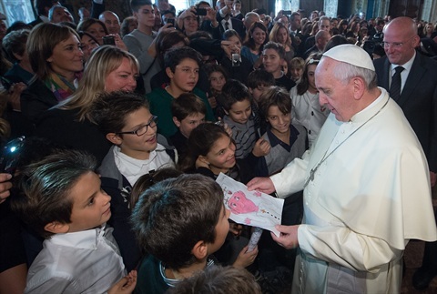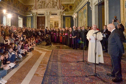 Il Presidente Giorgio Napolitano e Sua Santità Papa Francesco nel corso dell'incontro con una rappresentanza del Personale del Segretariato Generale della Presidenza della Repubblica con i familiari in occasione della Visita Ufficiale