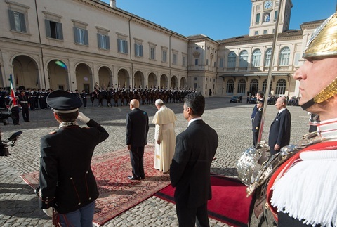 Il Presidente Giorgio Napolitano e Sua Santità Papa Francesco durante gli Inni Nazionali in occasione della Visita Ufficiale