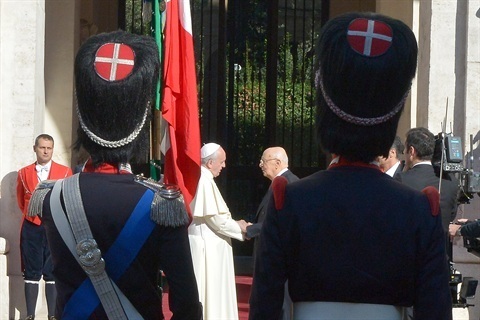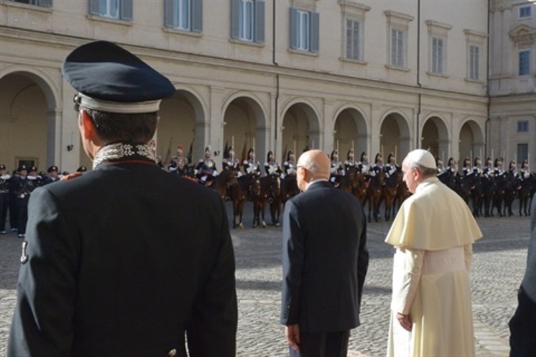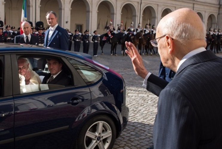 Il Presidente Giorgio Napolitano accoglie Sua Santità Francesco al suo arrivo al Palazzo del Quirinale