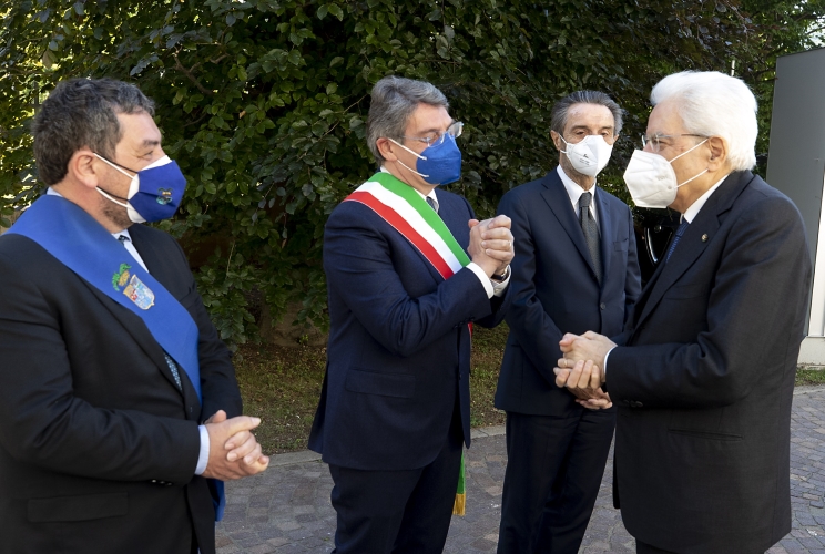 Il Presidente della Repubblica Sergio Mattarella accolto dal Presidente della Regione Lombardia, Attilio Fontana, dal Sindaco di Brescia, Emilio Del Bono e dal Presidente della Provincia Samuele Alghisi, in occasione della cerimonia di inaugurazione dell'anno accademico 2020/2021 dell'Università degli Studi di Brescia