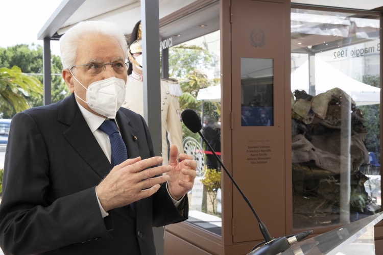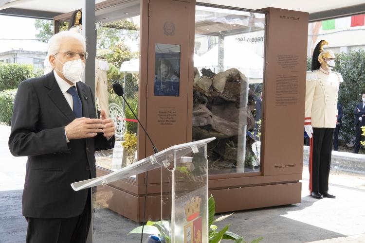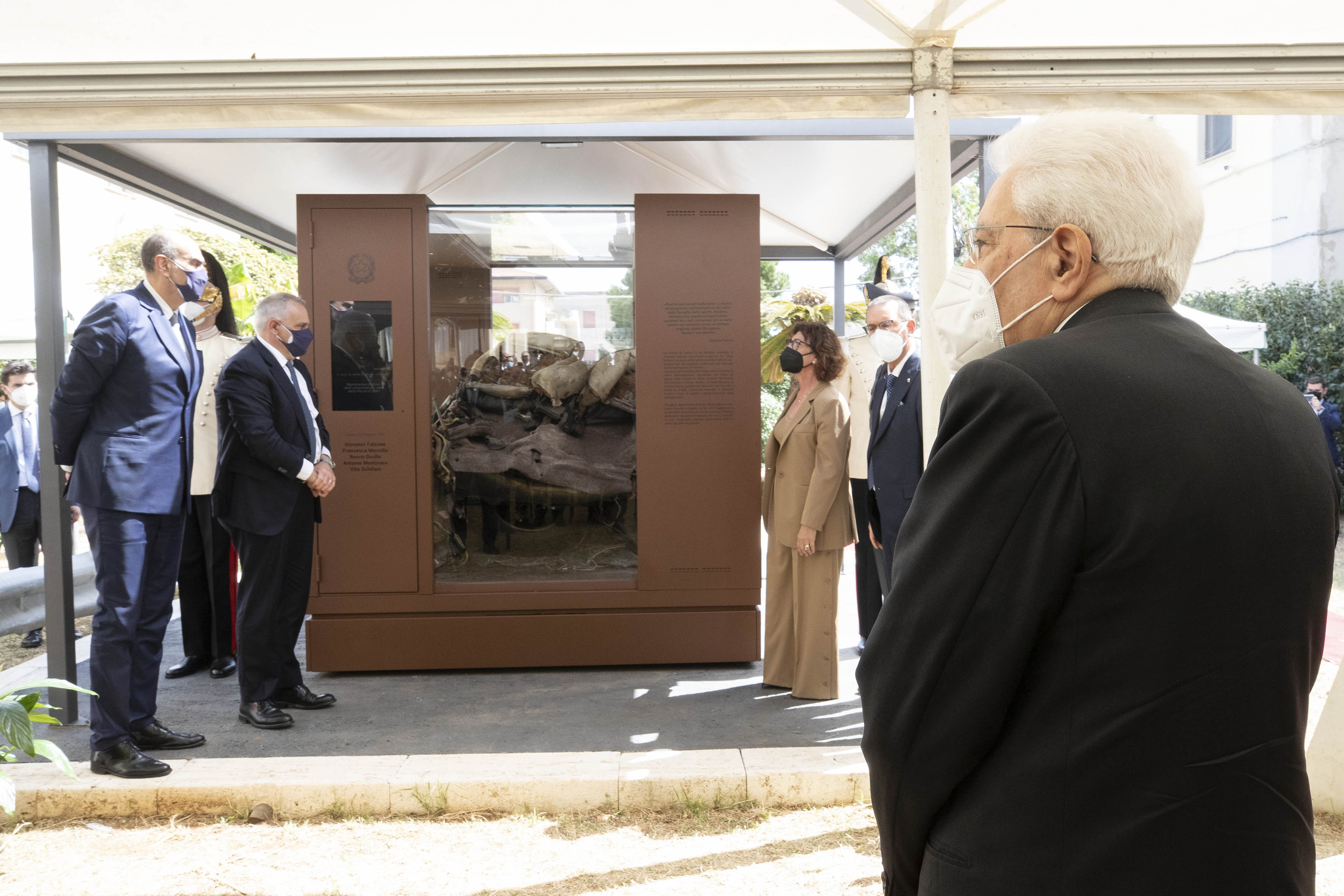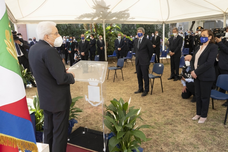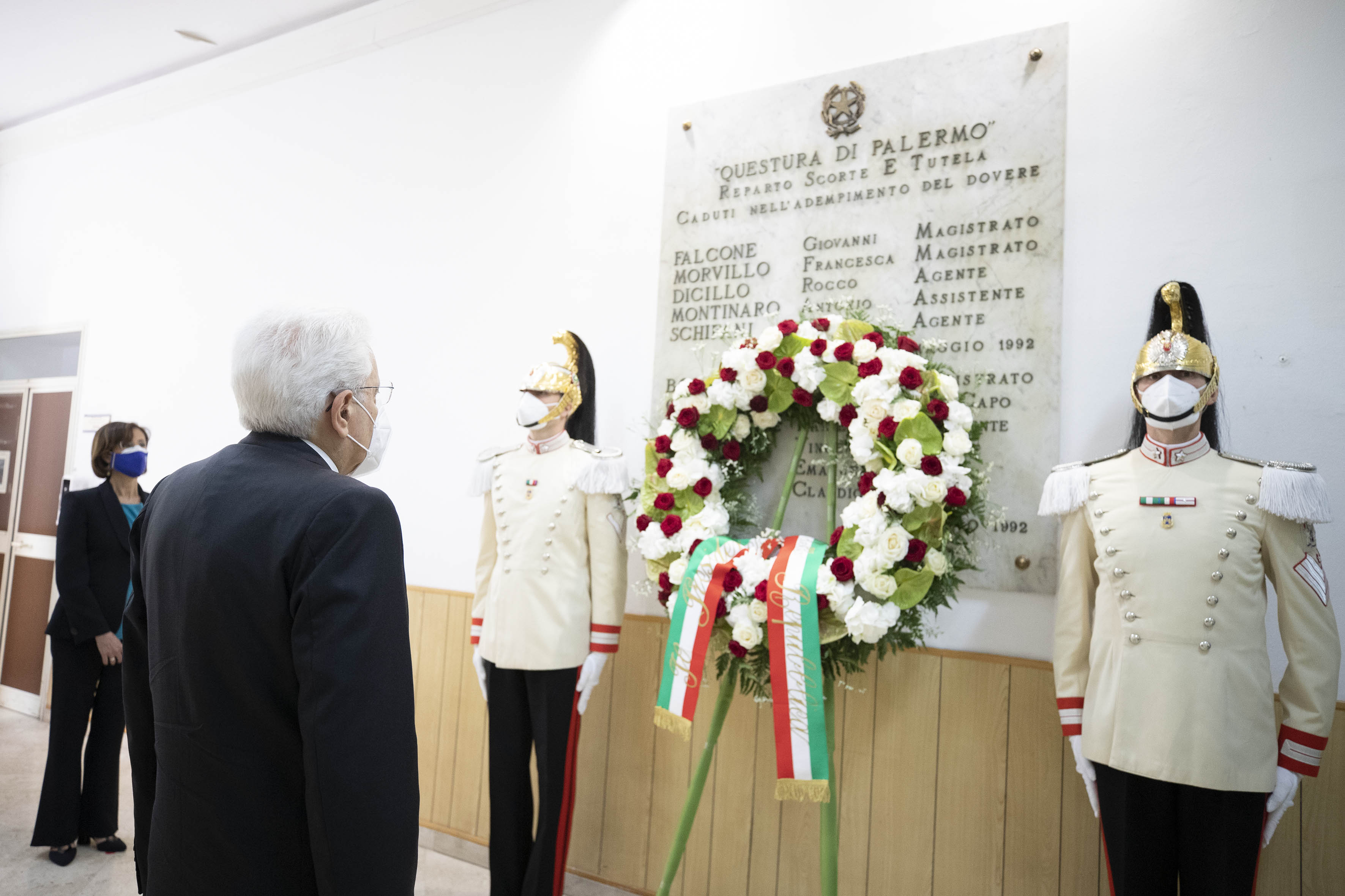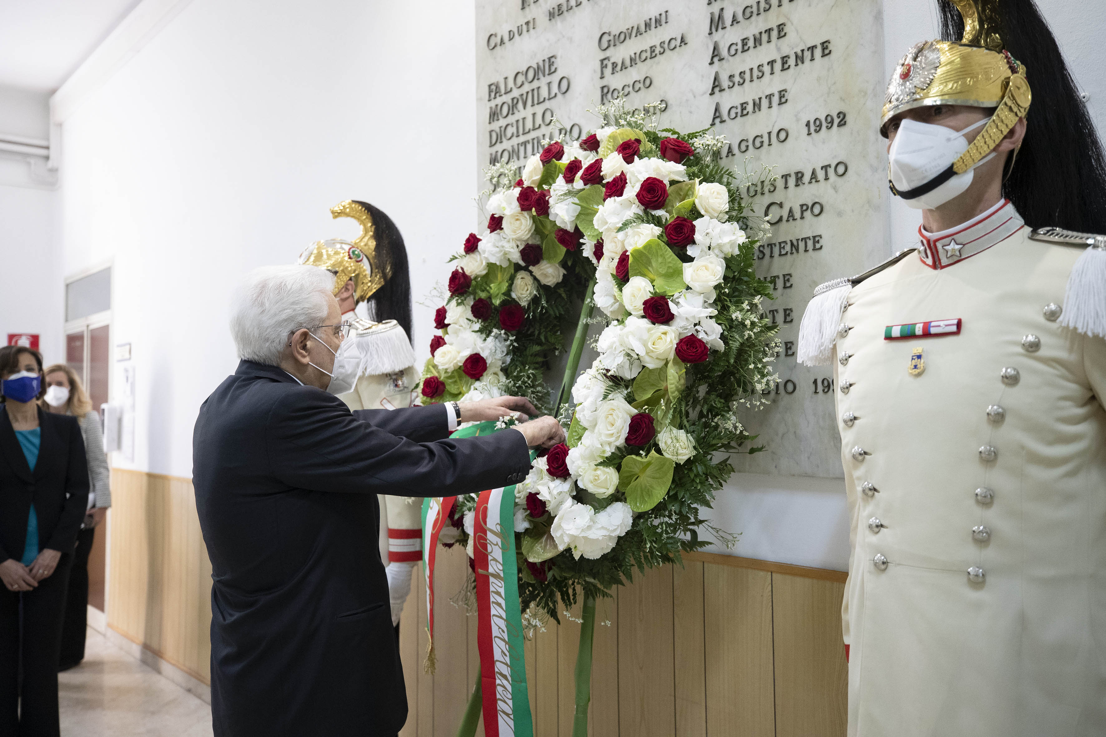 Il Presidente Sergio Mattarella alla caserma "Pietro Lungaro", depone una corona di fiori sulla lapide commemorativa delle vittime delle stragi di Capaci e di Via d’Amelio.