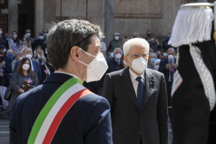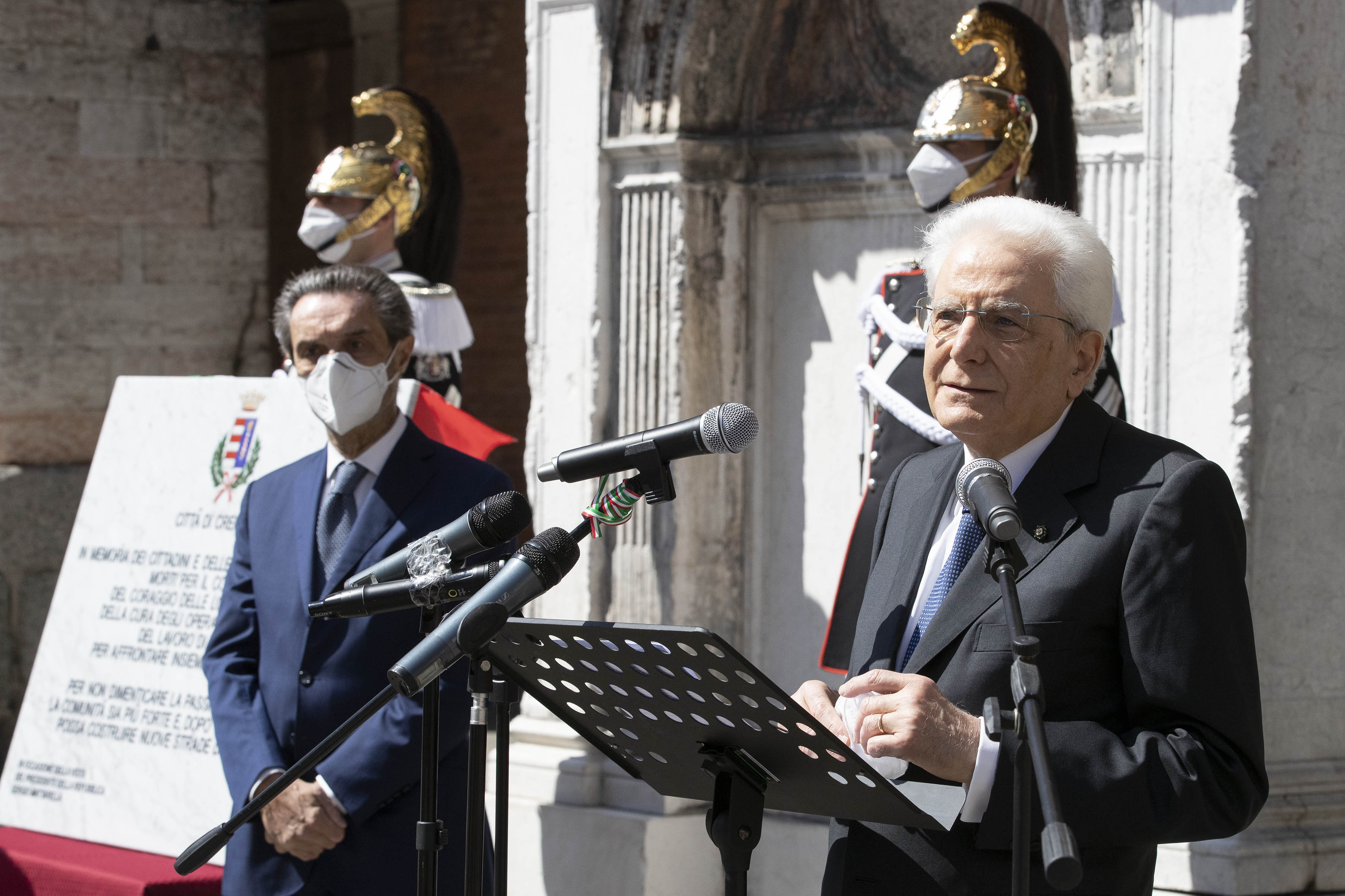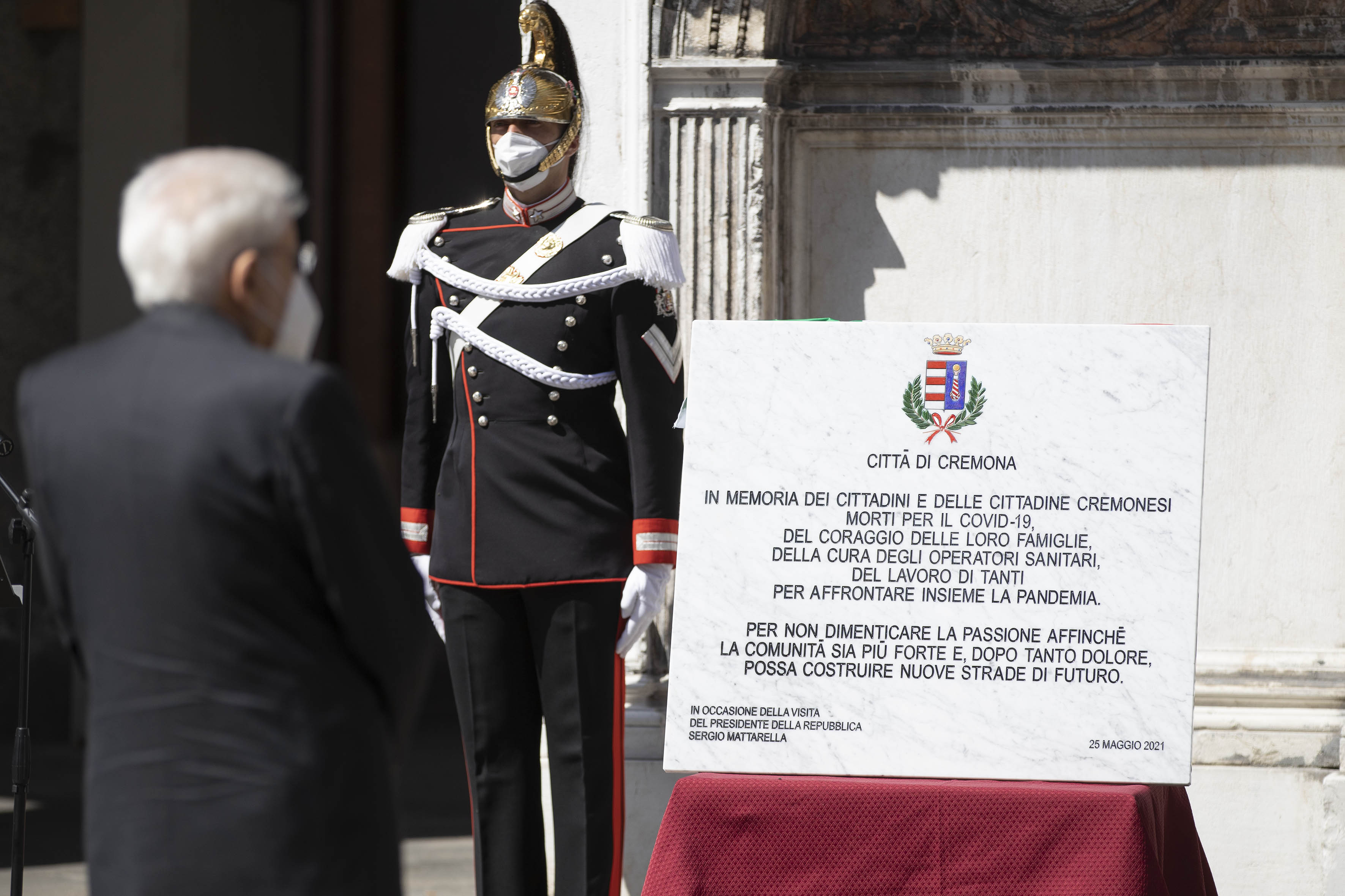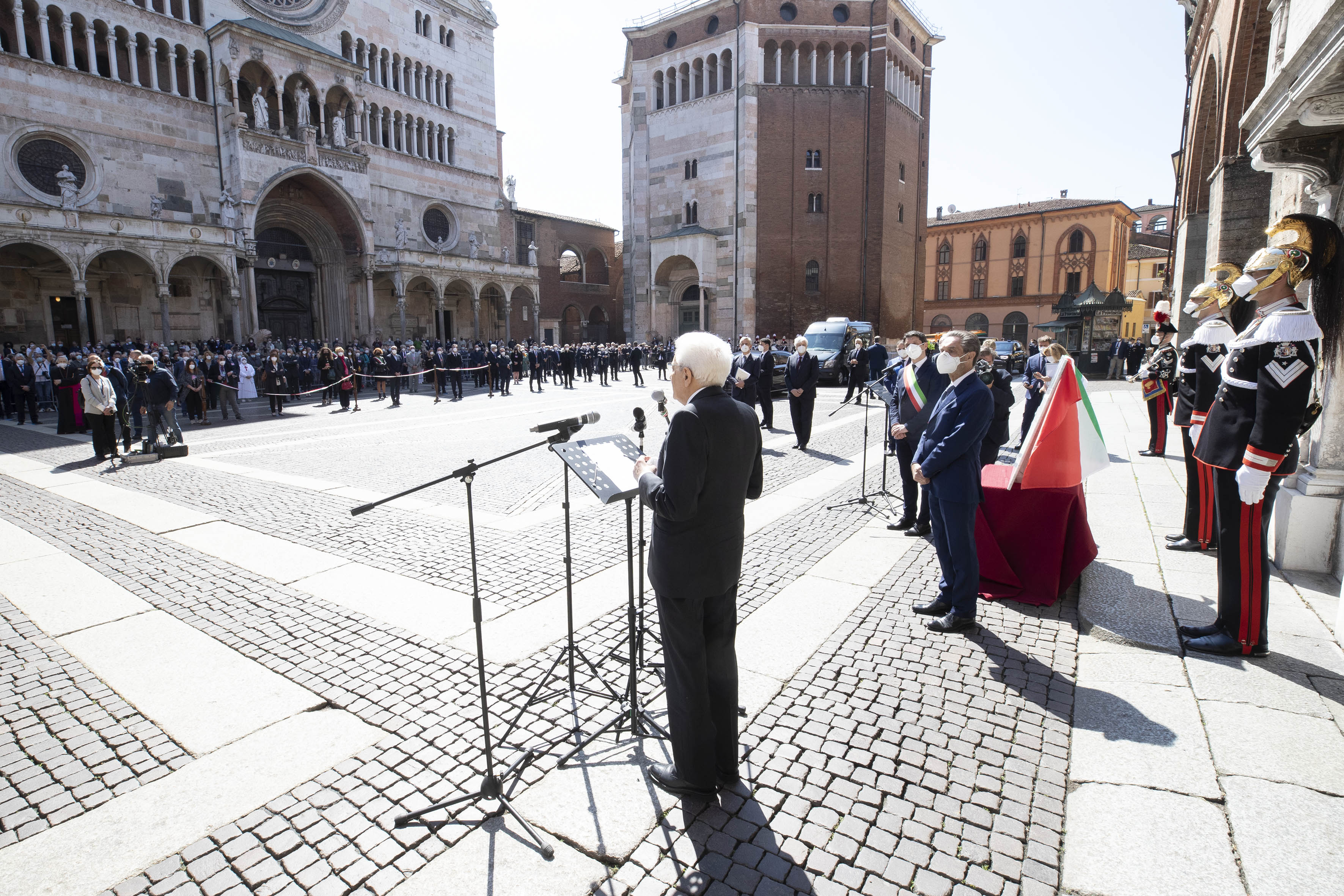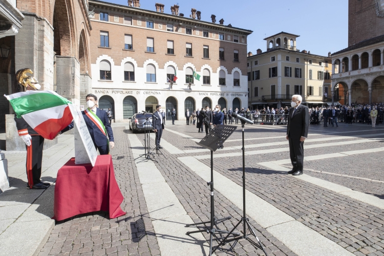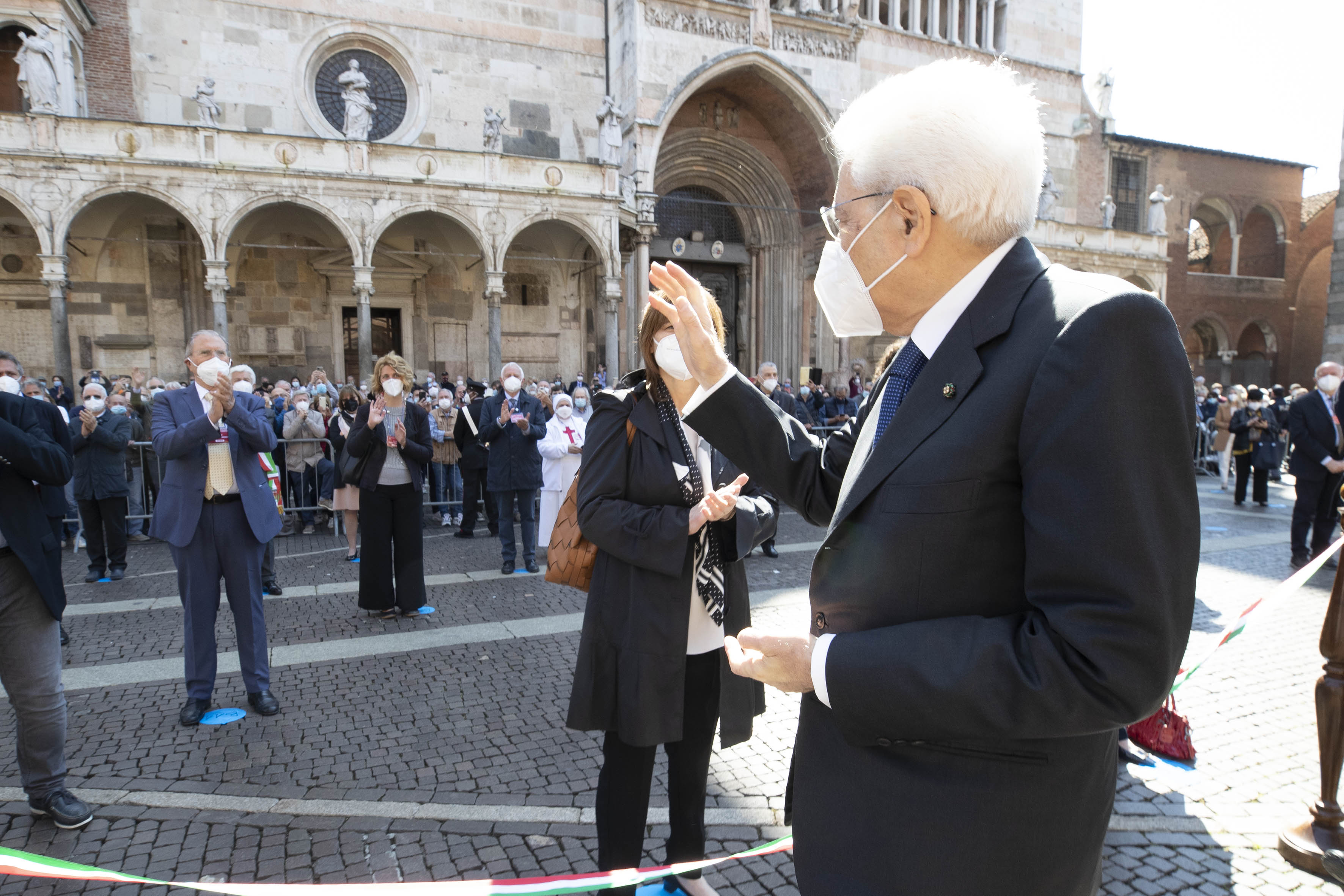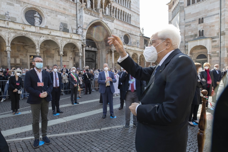 Il Presidente della Repubblica Sergio Mattarella in Piazza del Duomo a Cremona in occasione dello scoprimento di una targa a ricordo delle vittime del Covid-19.
