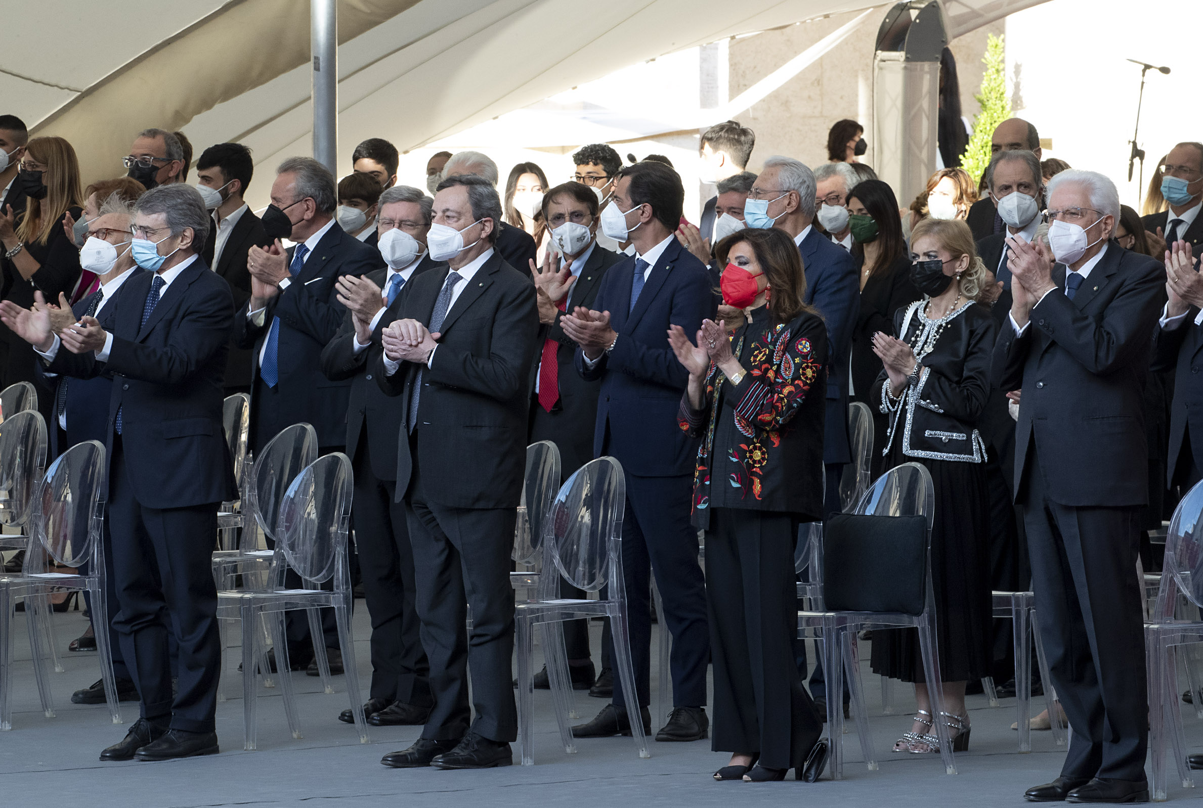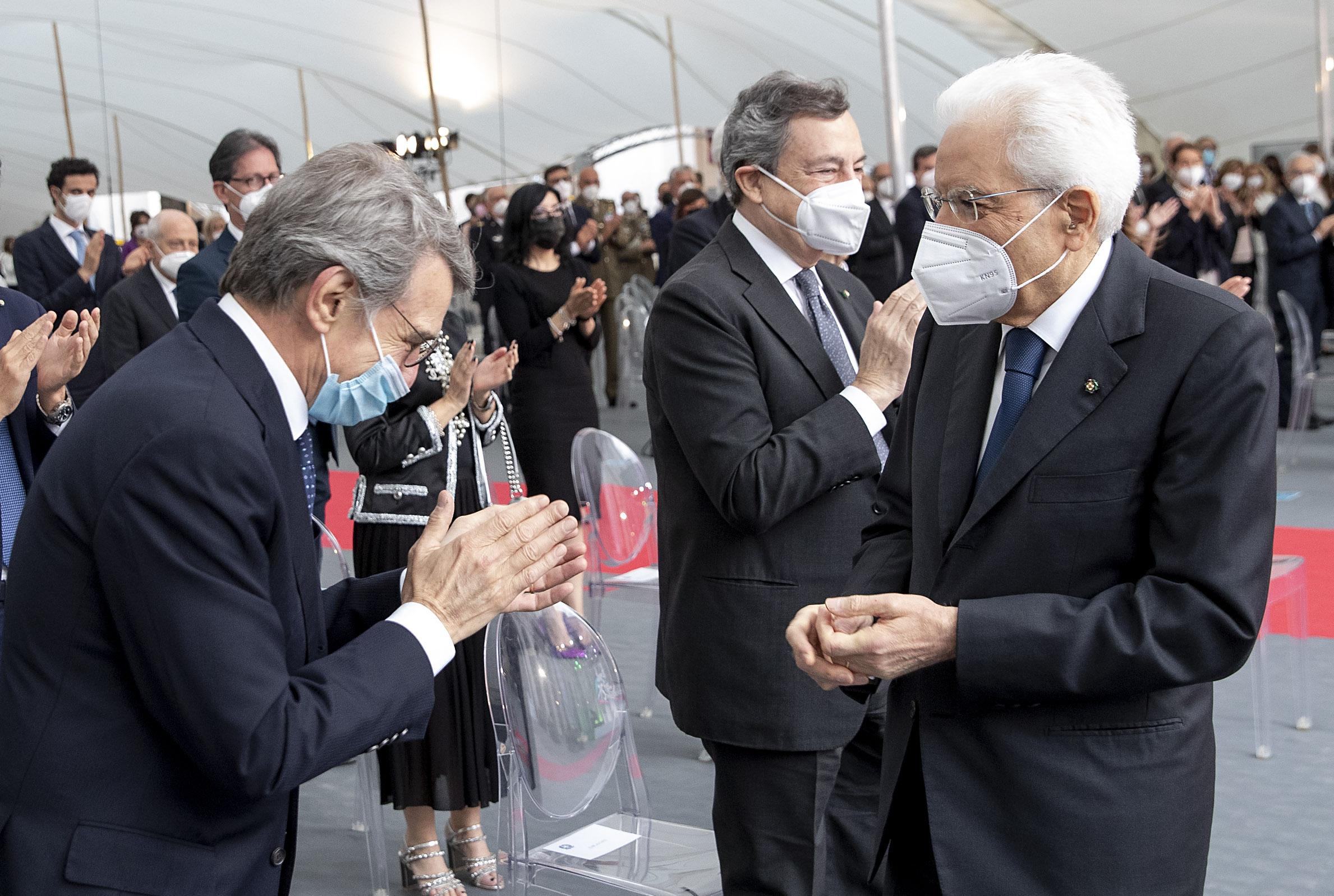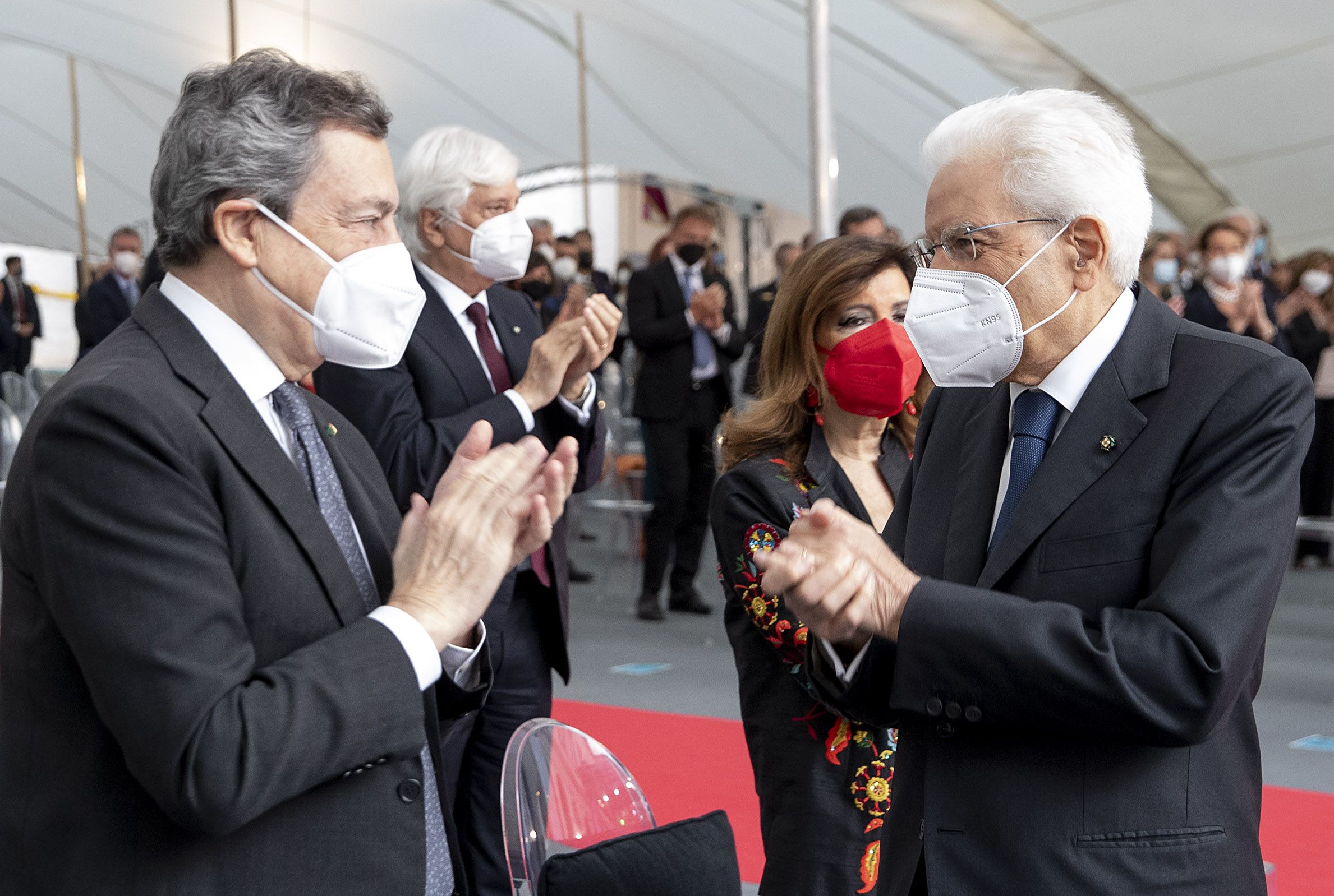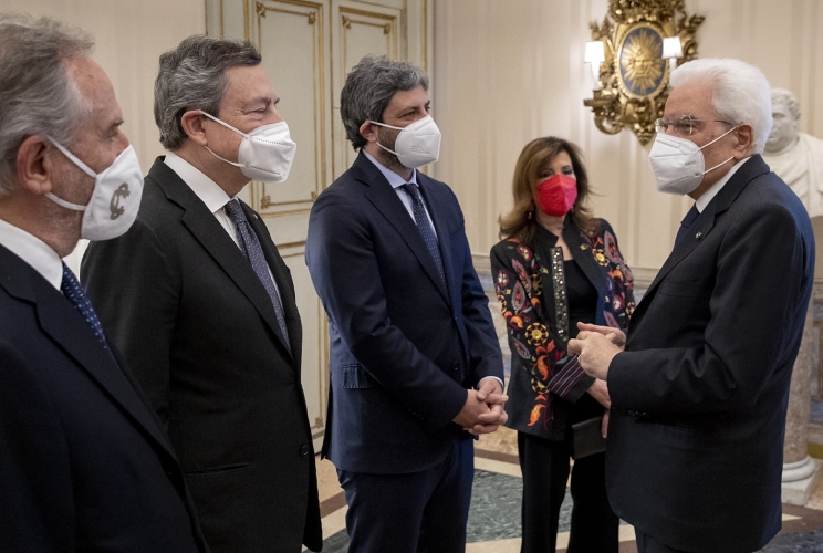 Il Presidente Sergio Mattarella al termine dell'intervento in occasione della Festa Nazionale della Repubblica saluta il Presidente del Consiglio Mario Draghi