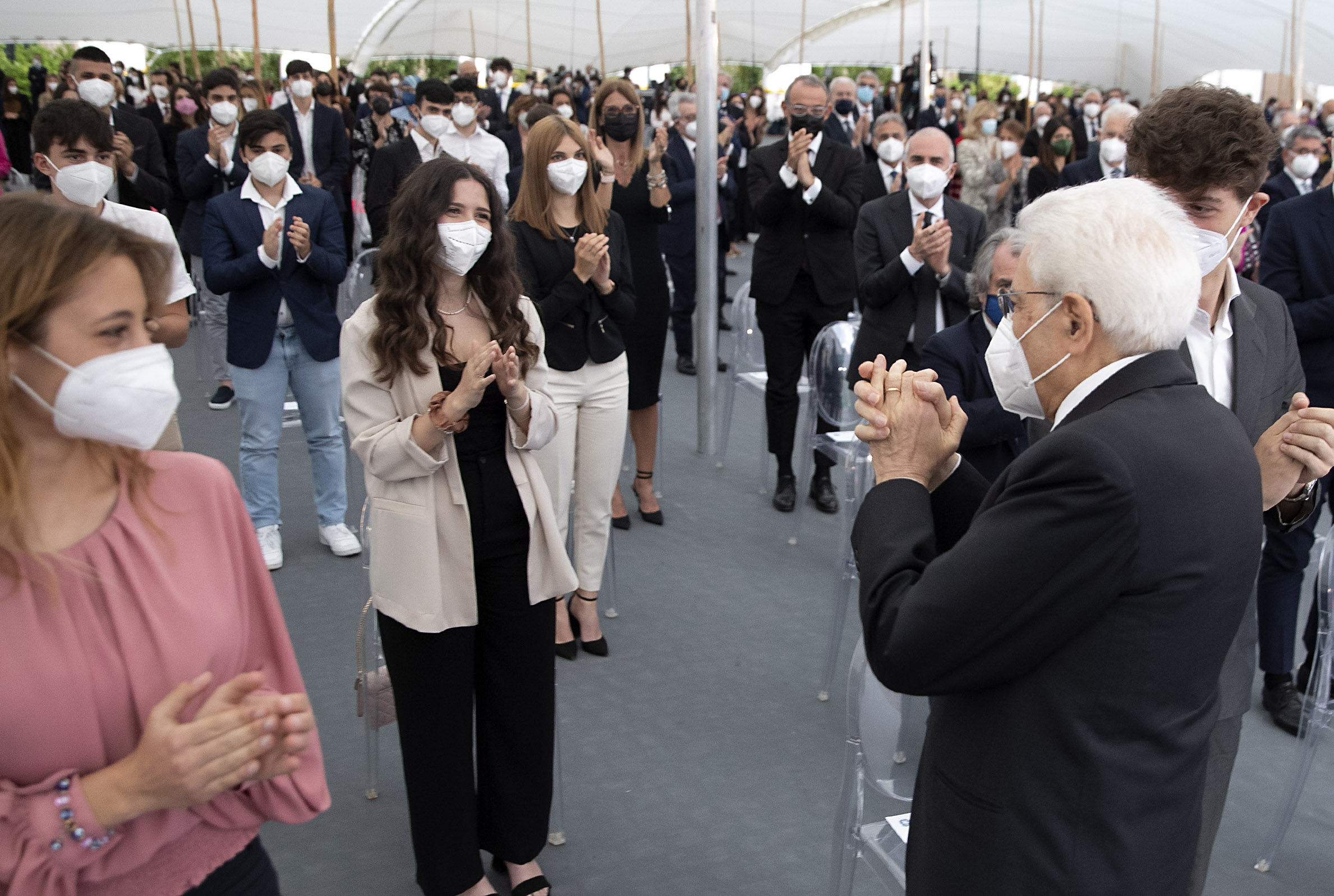 Il Presidente Sergio Mattarella al termine dell'intervento in occasione della Festa Nazionale della Repubblica saluta i ragazzi presenti