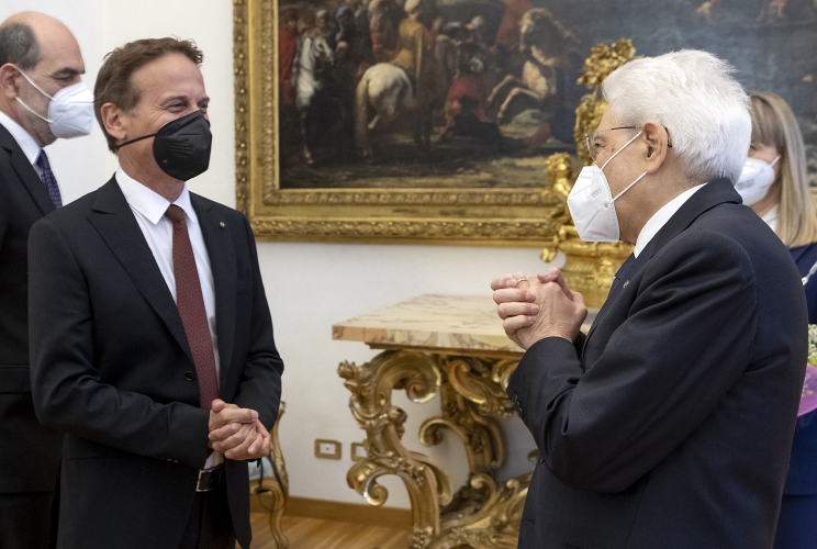 Il Presidente Sergio Mattarella al termine dell'intervento in occasione della Festa Nazionale della Repubblica saluta il Presidente del Parlamento europeo David Sassoli