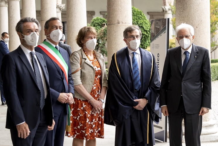 Il Presidente della Repubblica Sergio Mattarella alla cerimonia per l’anno accademico 2020- 2021 dell’Università degli Studi di Milano con il Prof. Elio Franzini, Rettore dell’Università degli Studi di Milano e Maria Cristina Messa, Ministro dell’Università e della Ricerca, Attilio Fontana, Presidente della Regione Lombardia e Giuseppe Sala, Sindaco di Milano