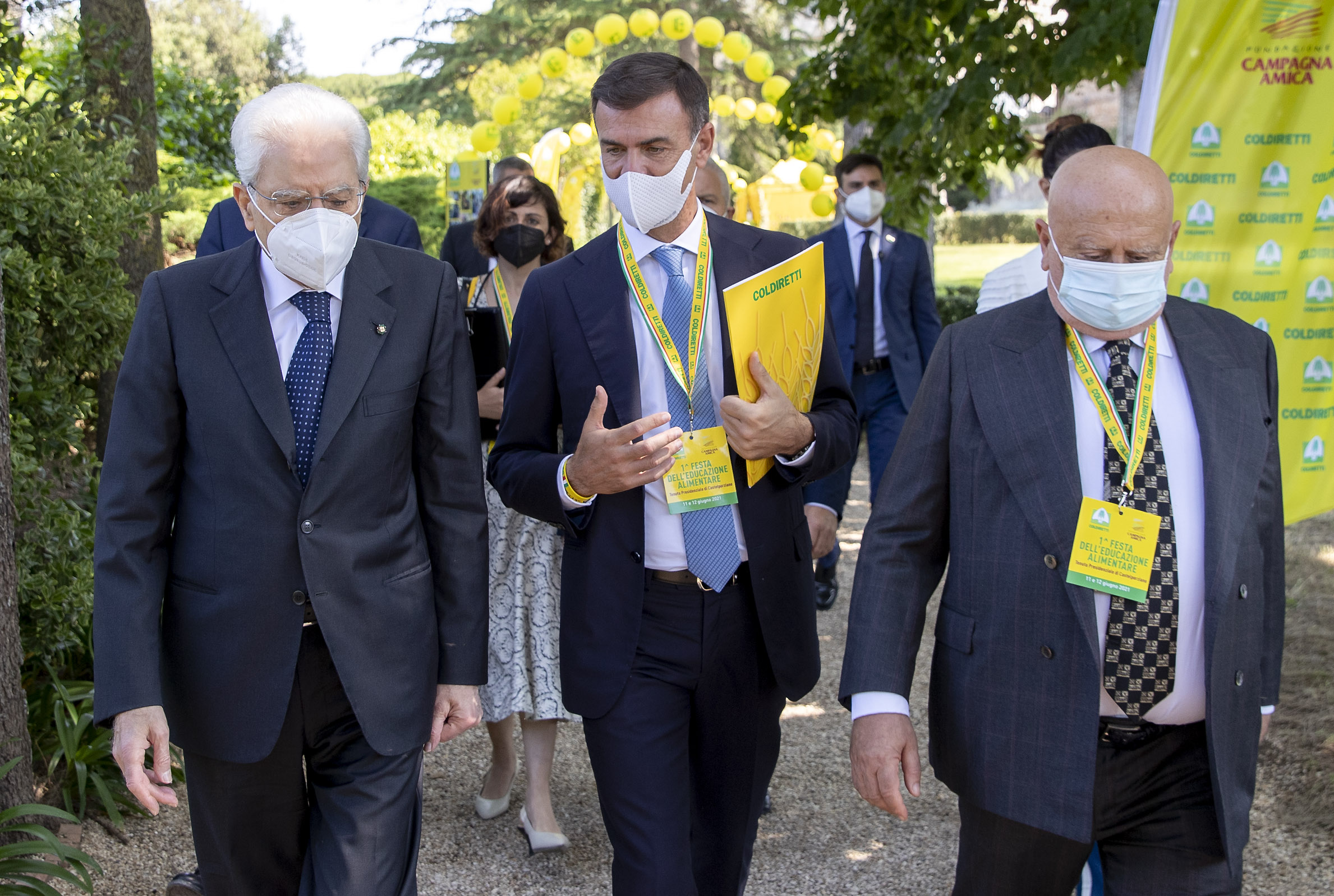 Il Presidente Sergio Mattarella con Ettore Prandini, Presidente della Confederazione nazionale Coldiretti e Vincenzo Gesmundo, Segretario generale della Confederazione nazionale Coldiretti, in occasione della celebrazione della 1^ Festa dell’educazione alimentare nelle scuole, a cura di Coldiretti