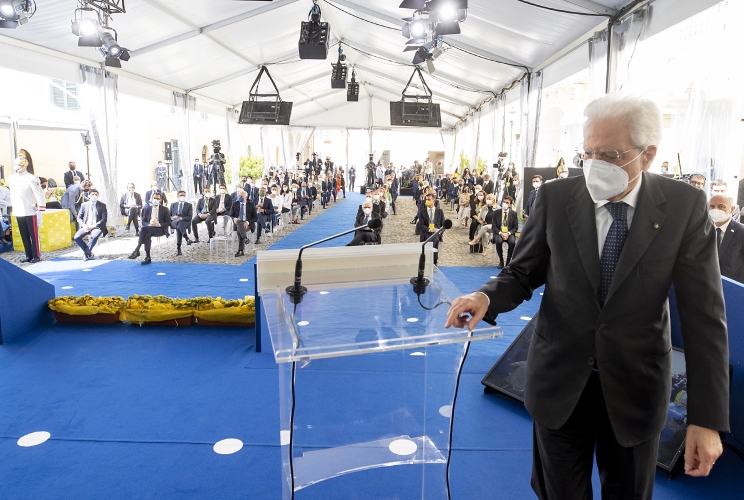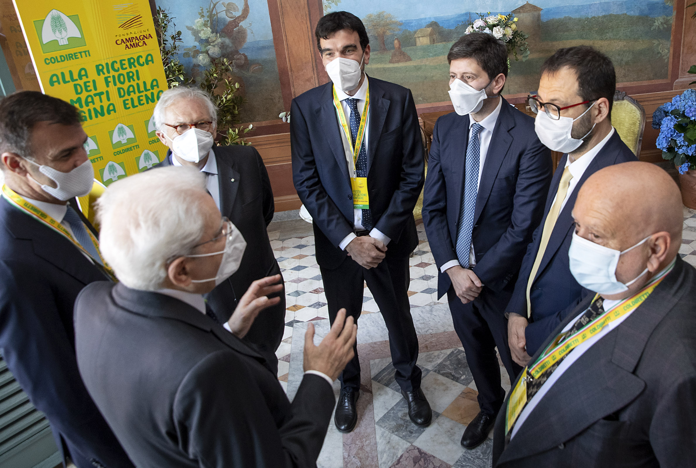 Il Presidente Sergio Mattarella con Vincenzo Gesmundo, Segretario generale della Confederazione nazionale Coldiretti, Stefano Patuanelli, Ministro delle politiche agricole, alimentari e forestali, Roberto Speranza, Ministro della salute, Maurizio Martina, Vice Direttore generale e Consigliere speciale del Direttore generale FAO, Patrizio Bianchi, Ministro dell’istruzione e Ettore Prandini, Presidente della Confederazione nazionale Coldiretti, in occasione della celebrazione della 1^ Festa dell’educazione alimentare nelle scuole, a cura di Coldiretti