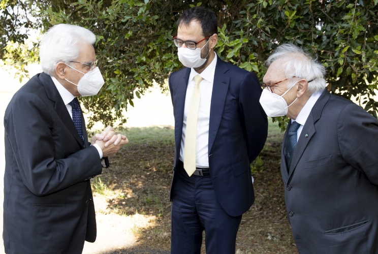 Il Presidente Sergio Mattarella accolto al suo arrivo a Castelporziano da Stefano Patuanelli, Ministro delle politiche agricole, alimentari e forestali e da Patrizio Bianchi, Ministro dell’istruzione, in occasione della celebrazione della 1^ Festa dell’educazione alimentare nelle scuole, a cura di Coldiretti