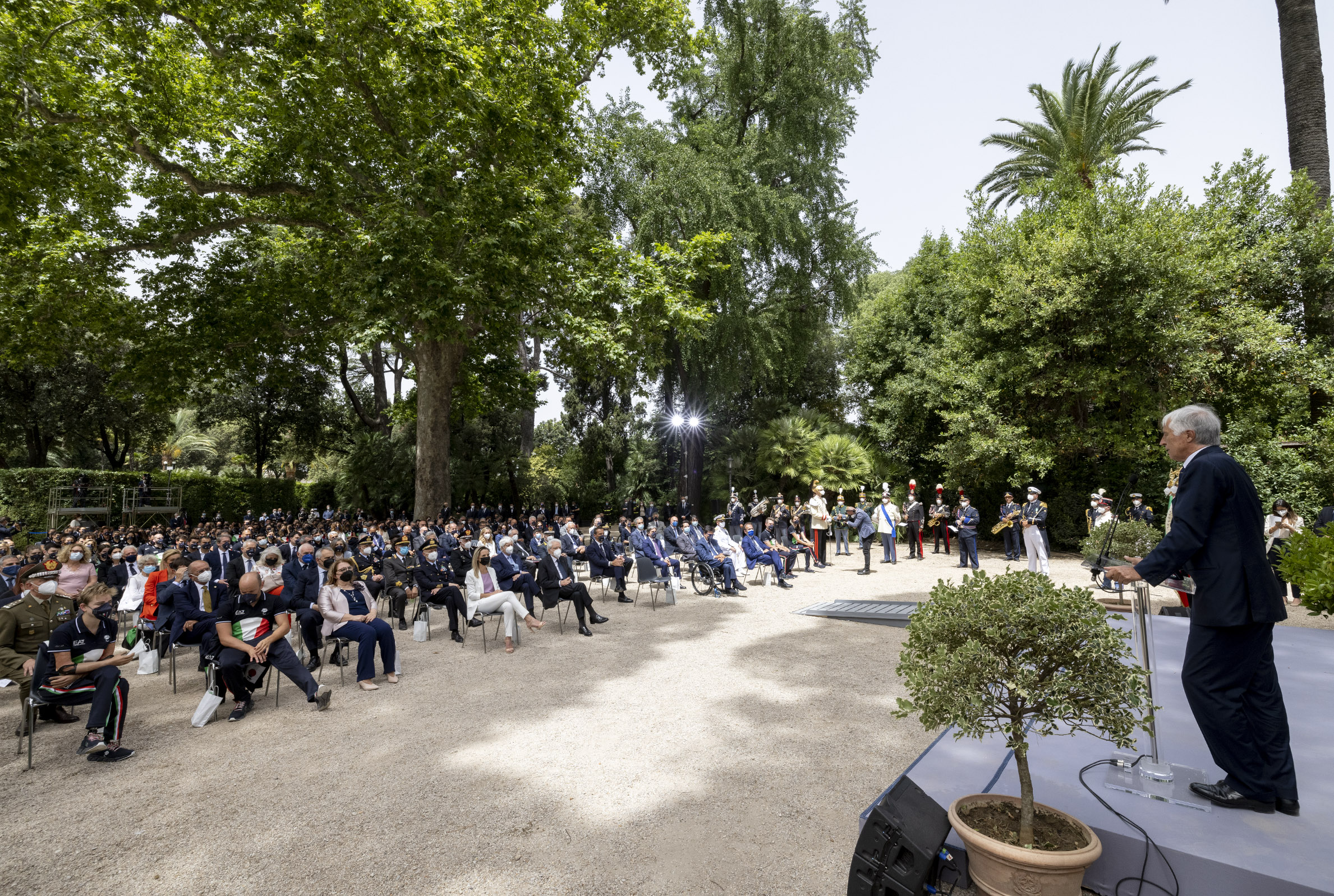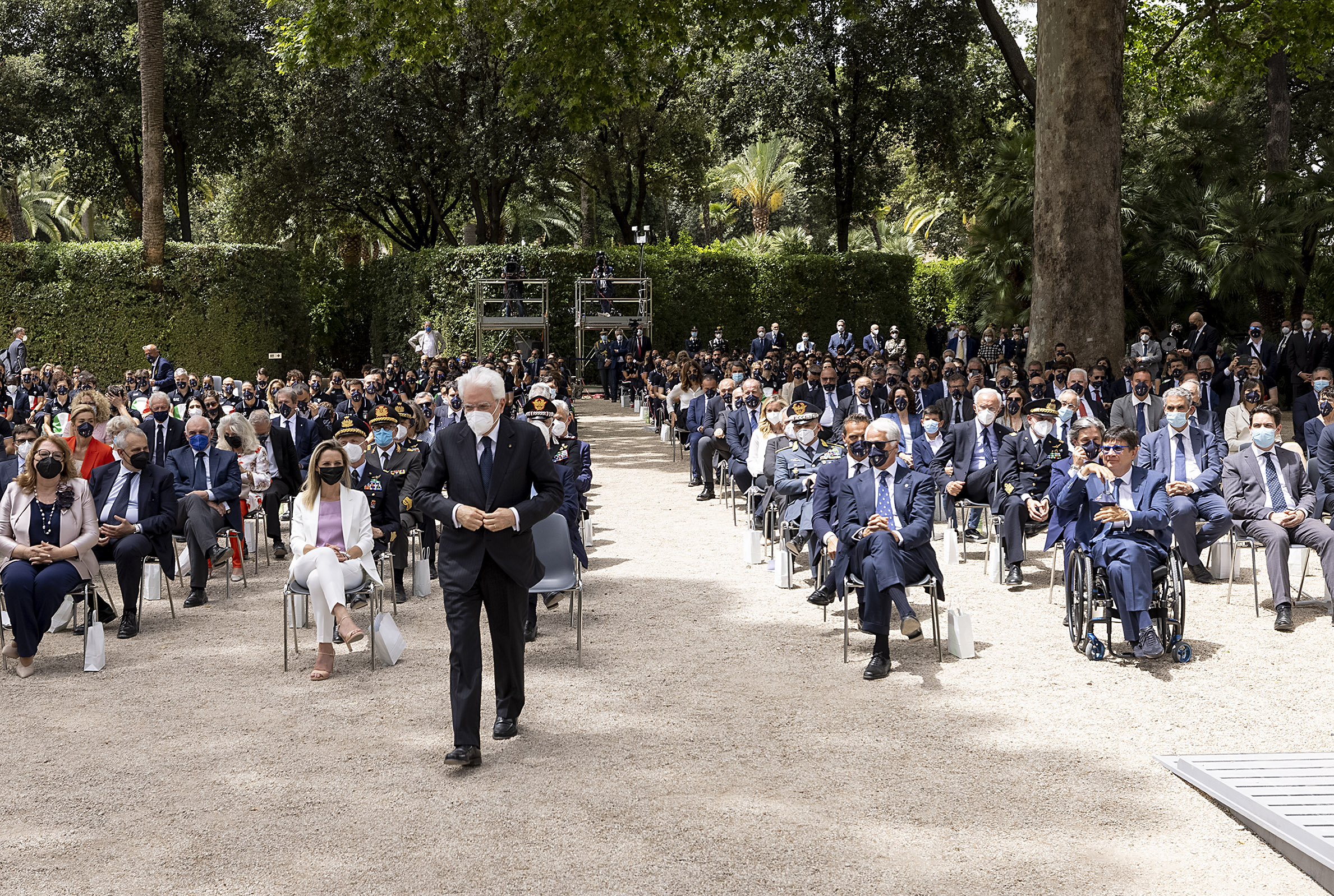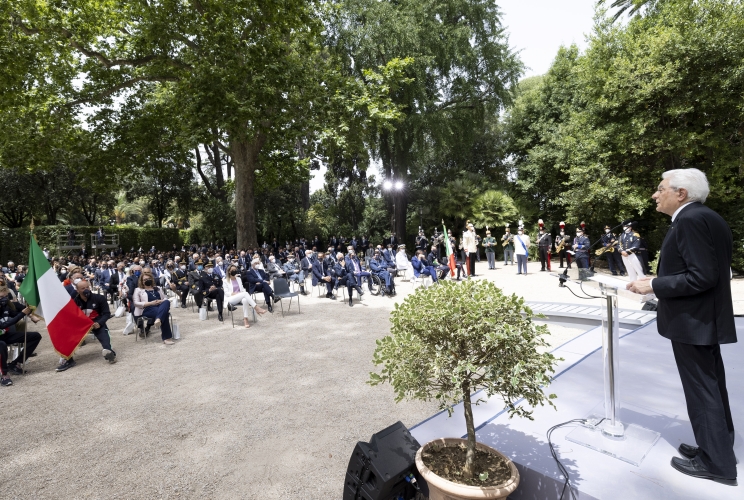 Il Presidente Sergio Mattarella nel corso della cerimonia di consegna della bandiera agli atleti italiani in partenza per i Giochi Olimpici e Paralimpici di Tokyo 2020