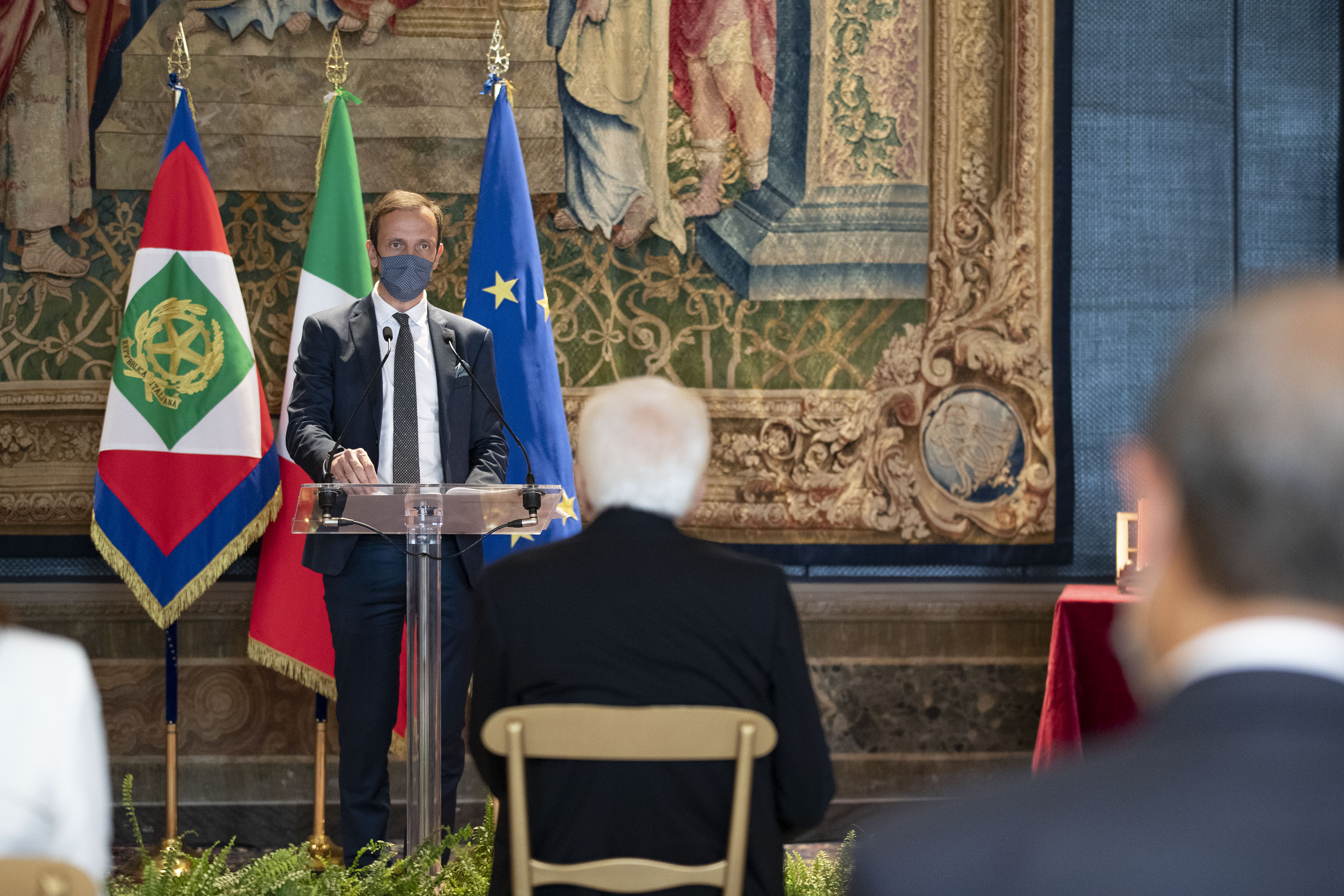 Il Presidente della Repubblica Sergio Mattarella durante l'intervento di Massimiliano Fedriga, Presidente della Conferenza delle Regioni e delle Province Autonome
