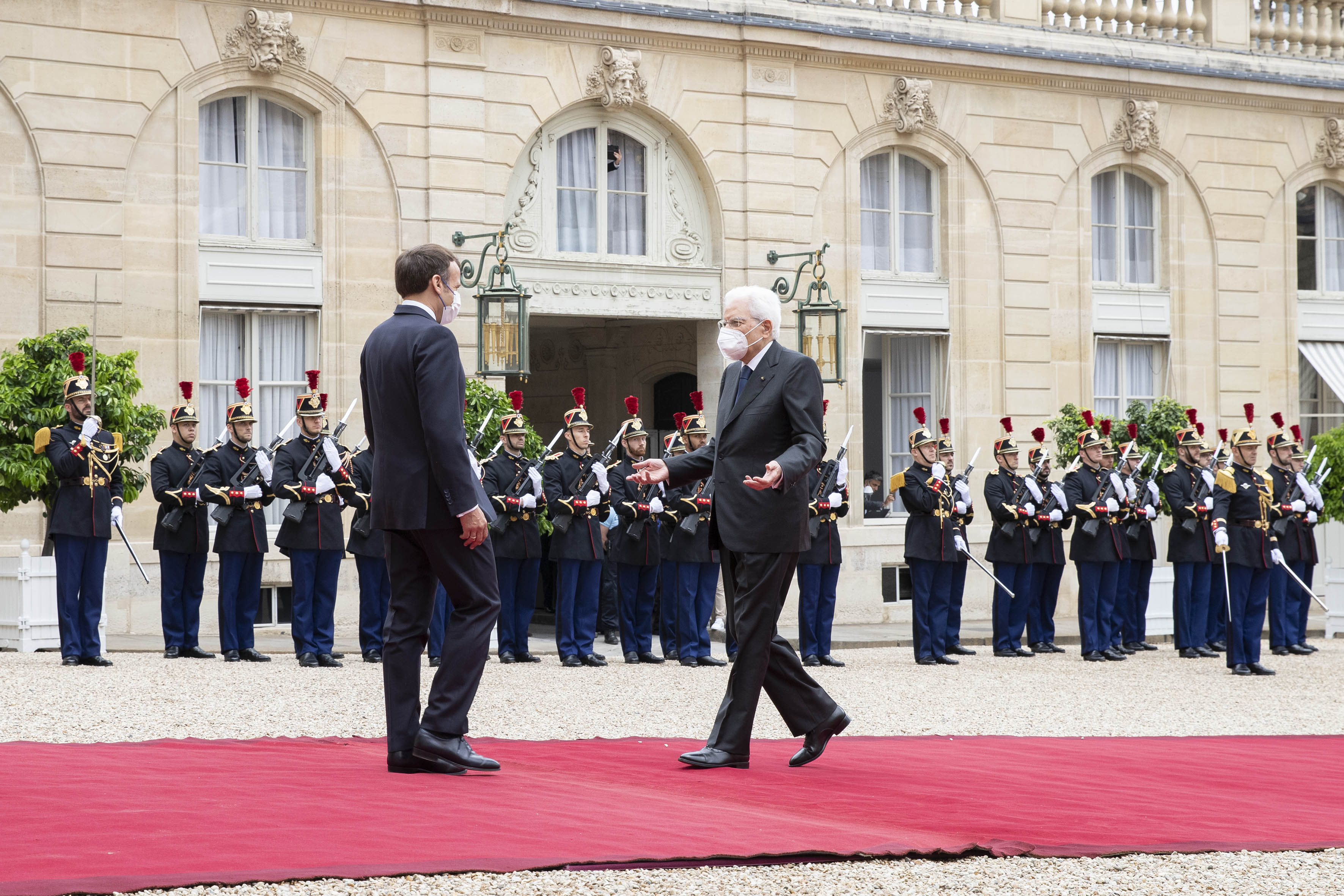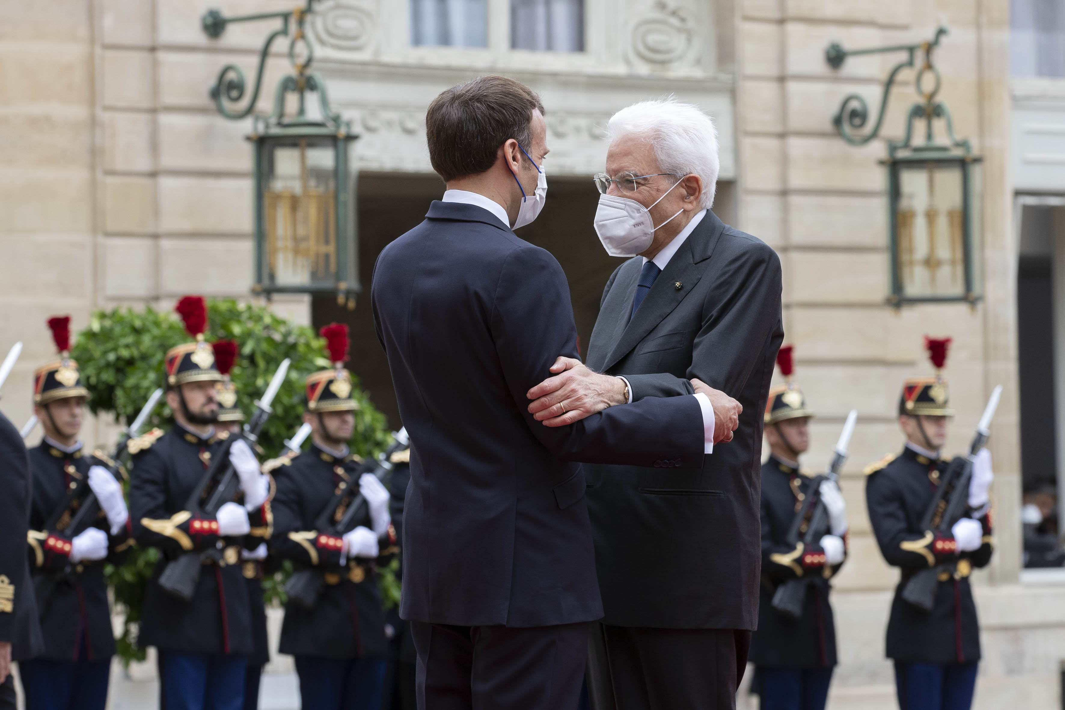 Il Presidente della Repubblica Sergio Mattarella arriva al Palais de l’Elysée, accolto da Emmanuel Macron, Presidente della Repubblica Francese