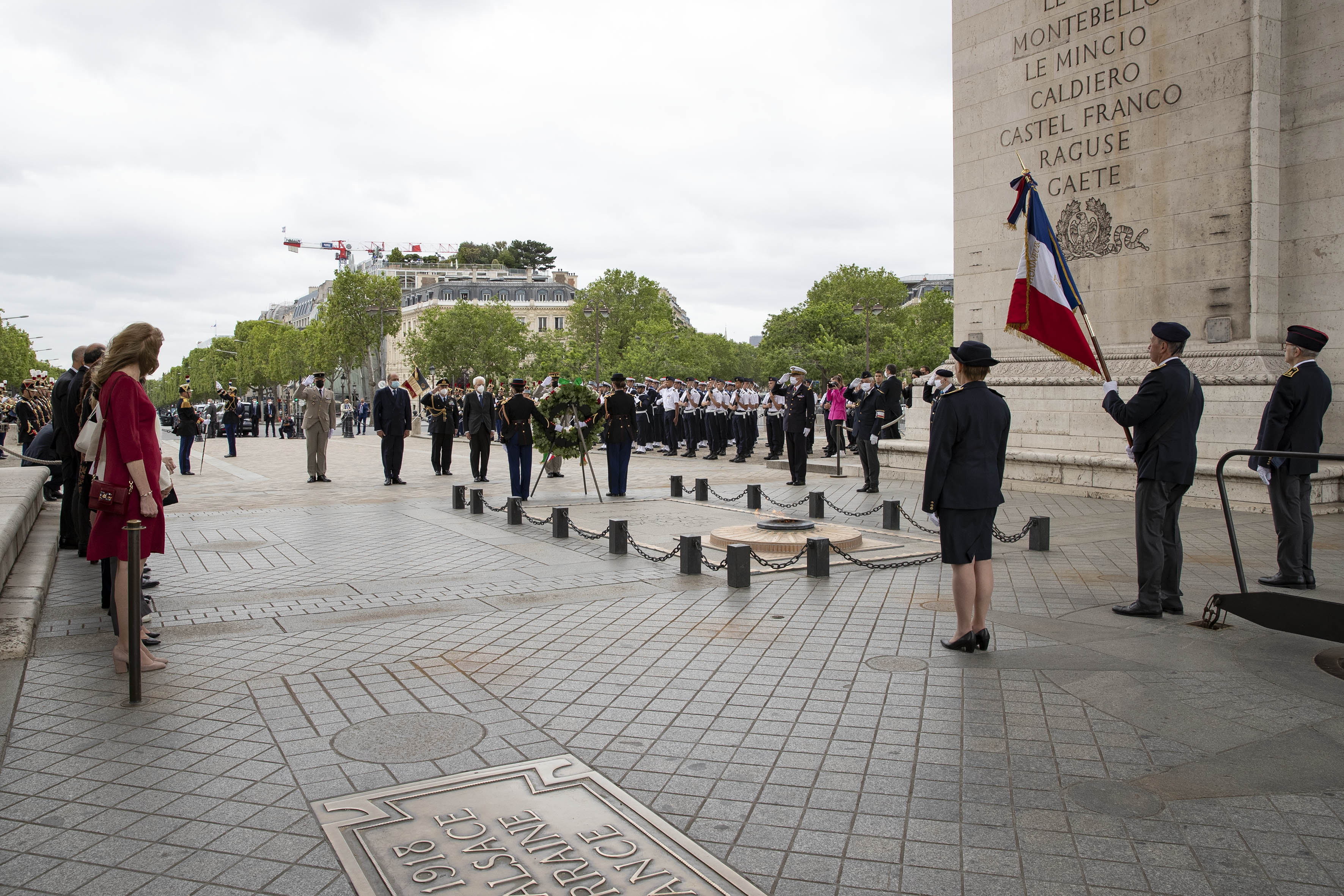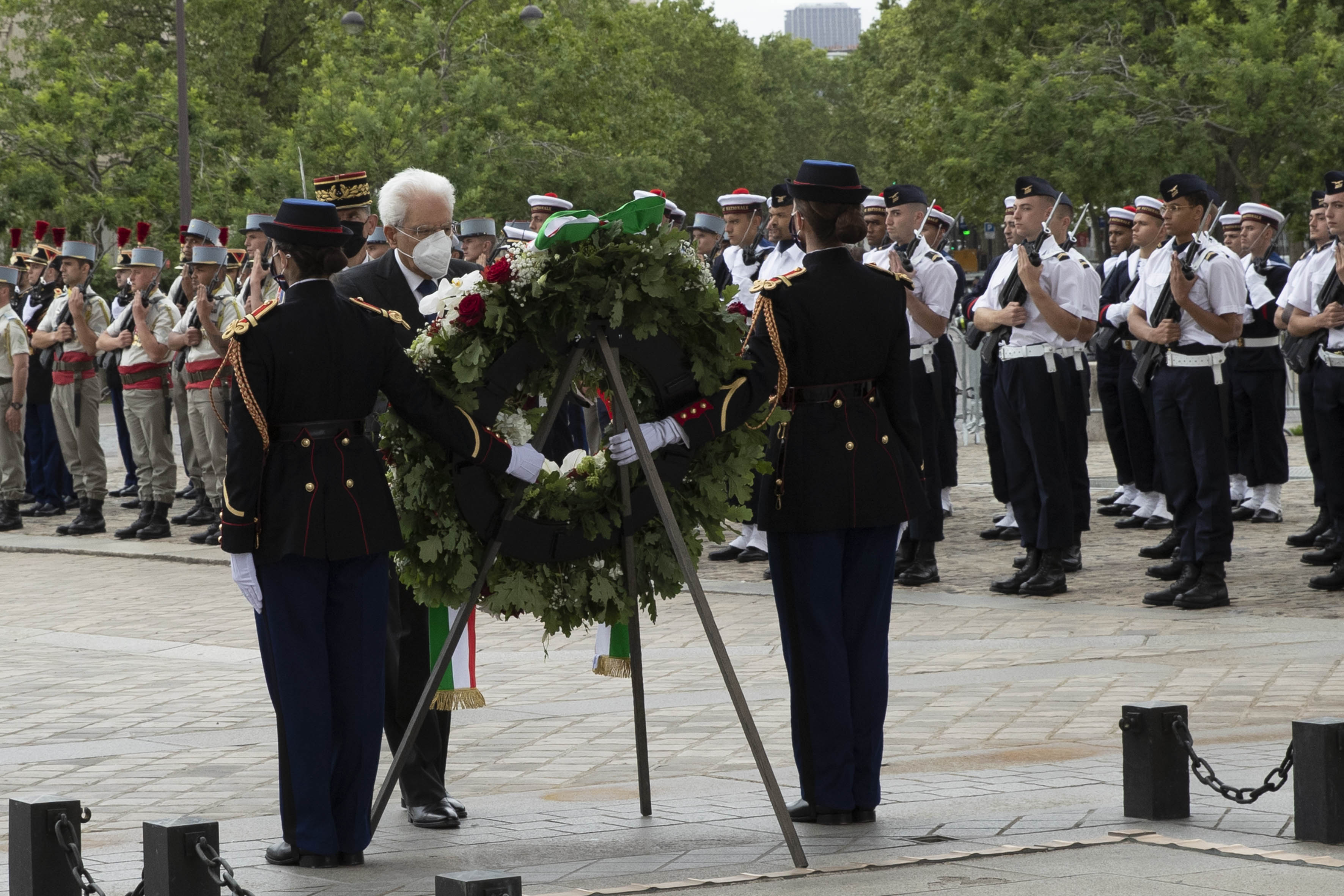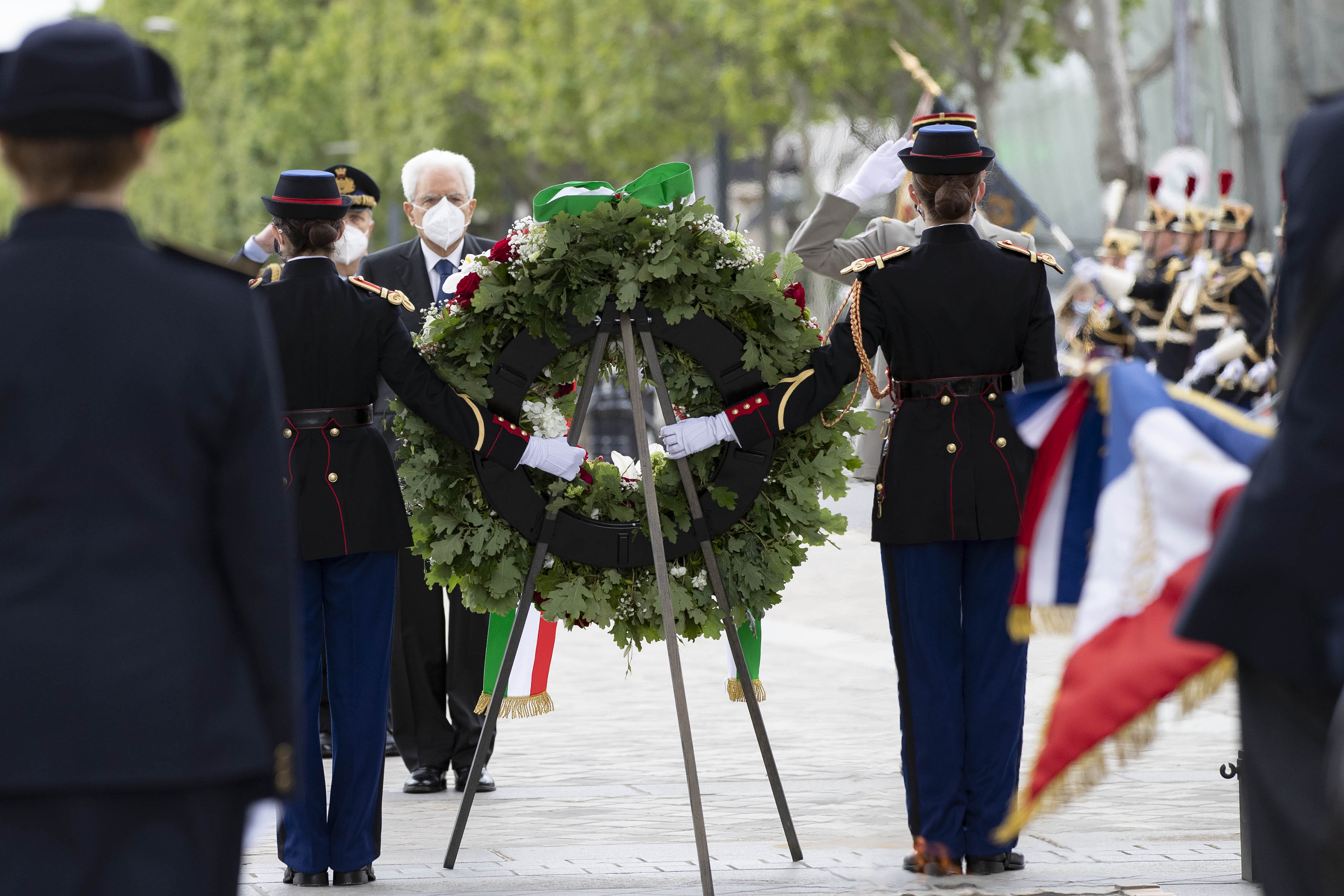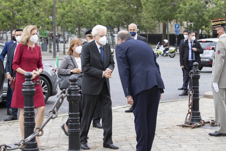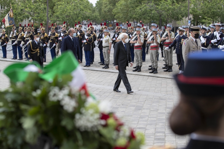 Il Presidente della Repubblica Sergio Mattarella all’Arc de Triomphe, durante la cerimonia di deposizione di una corona di fiori al Monumento del Milite Ignoto