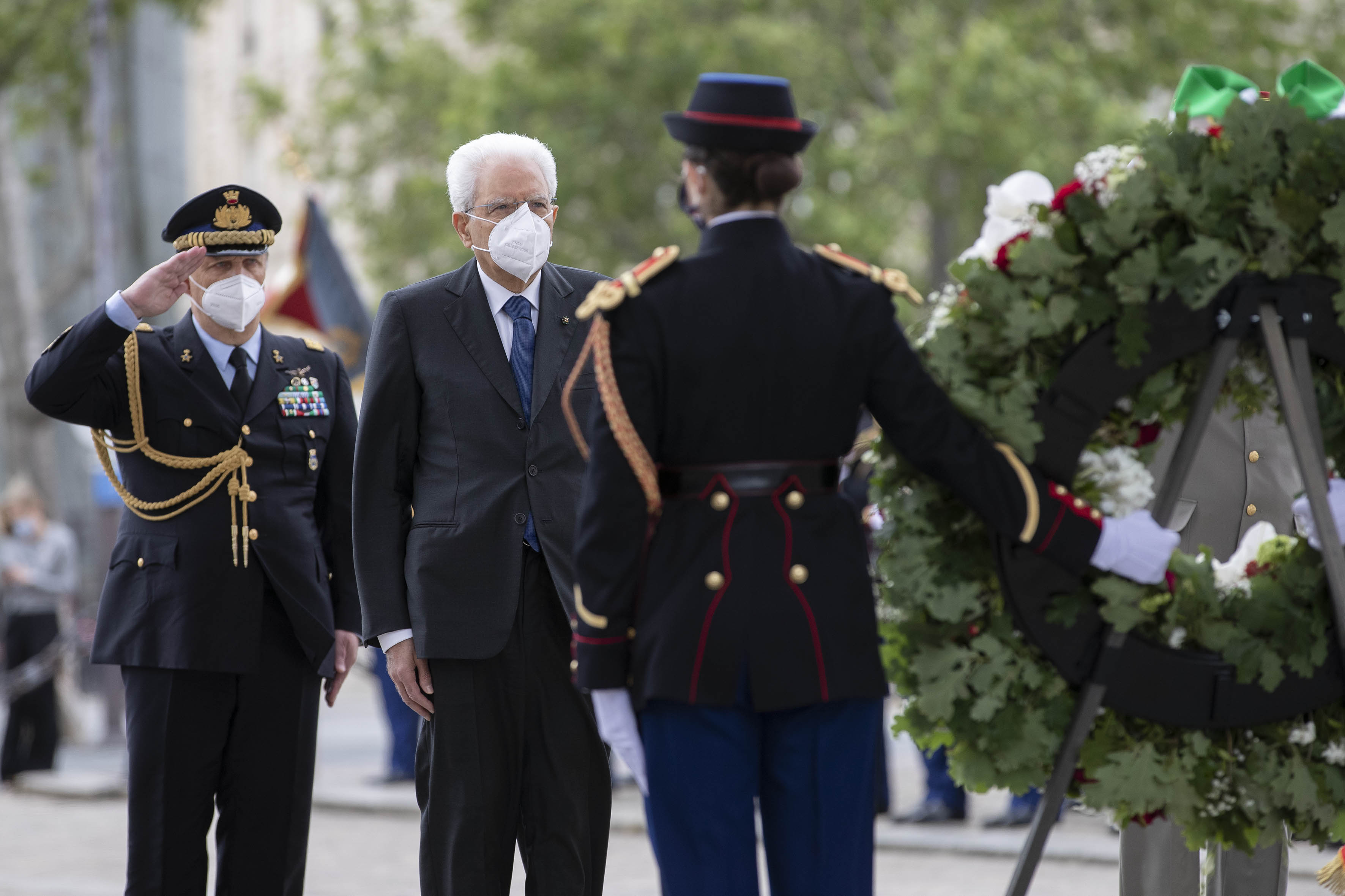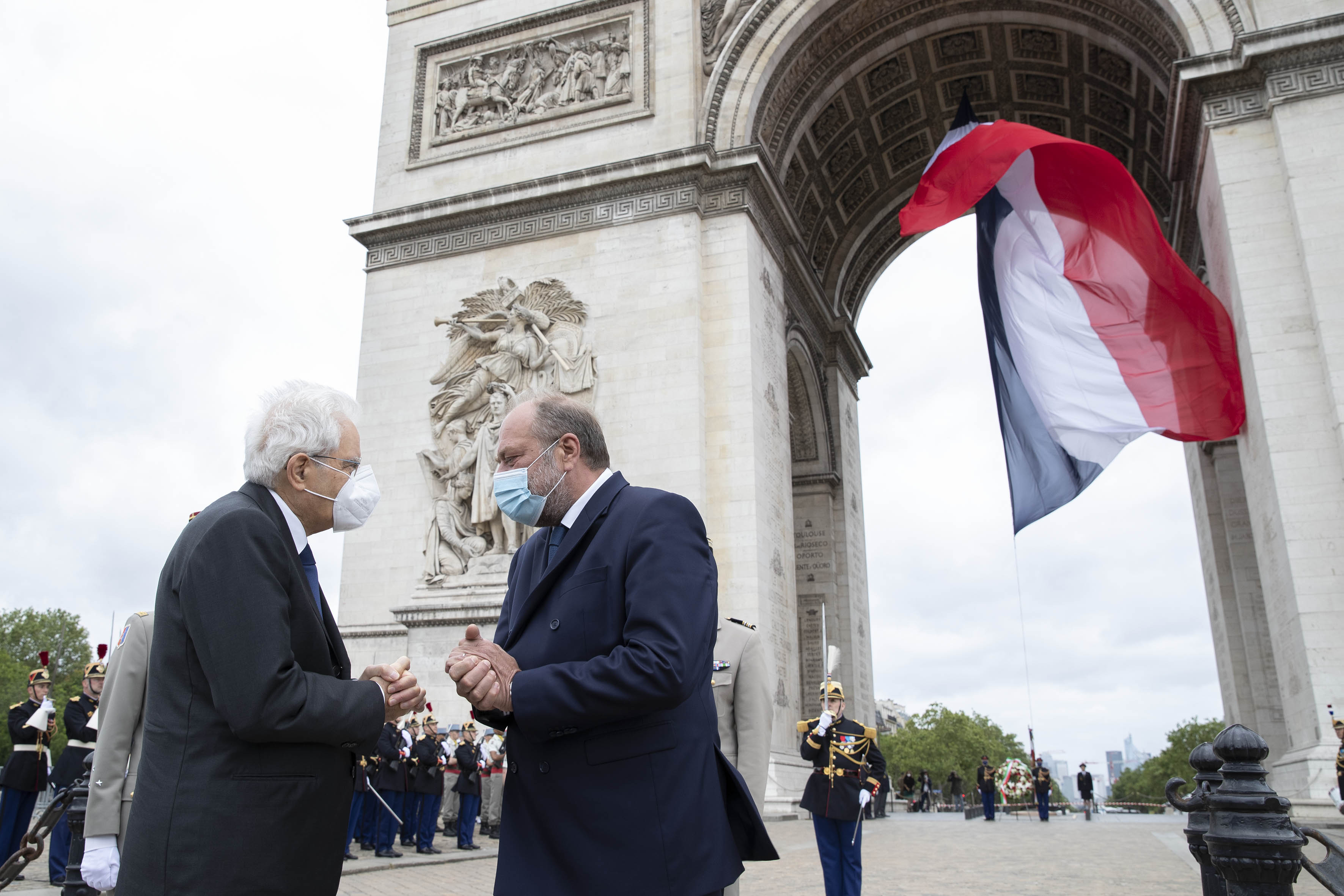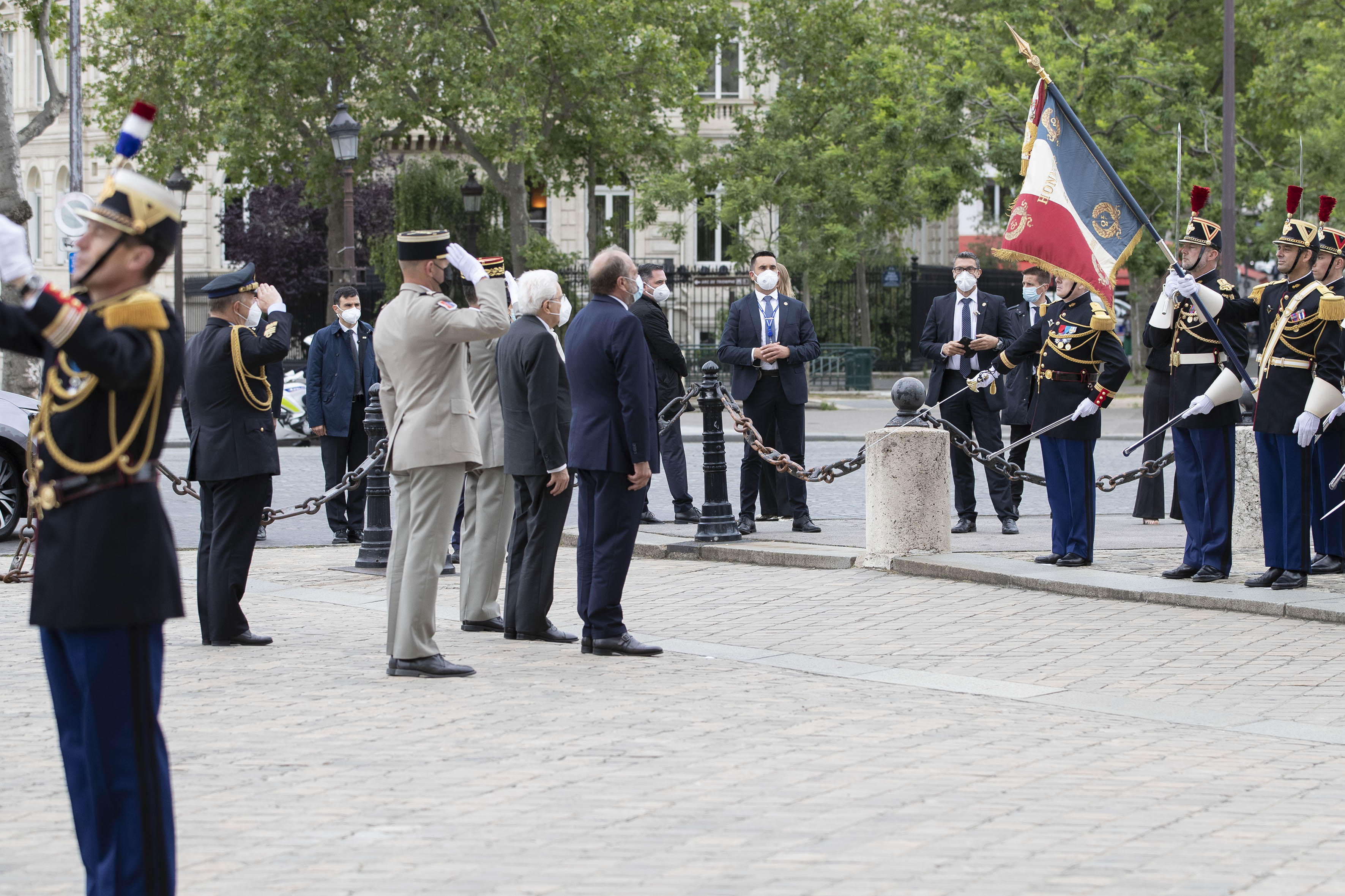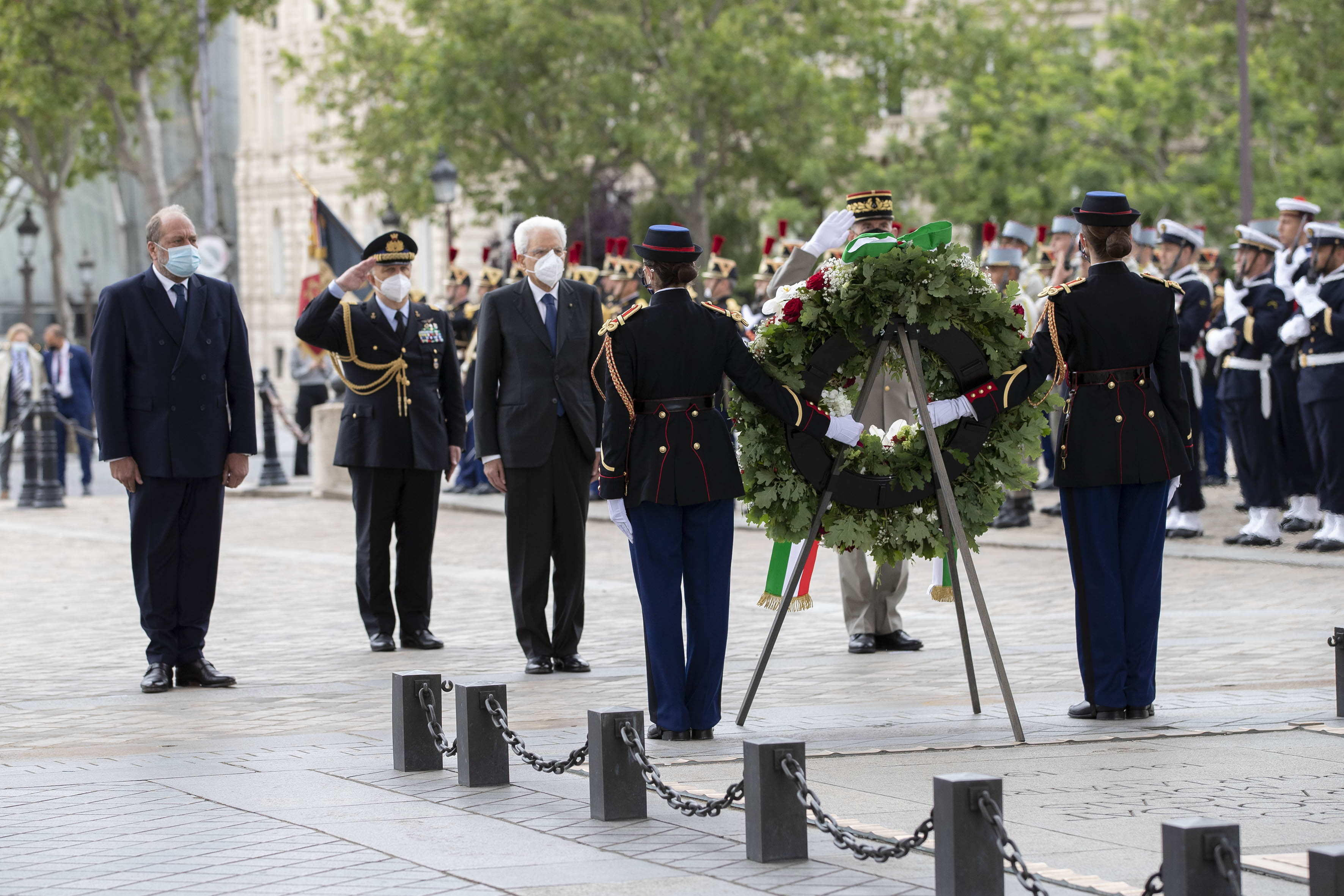 Il Presidente della Repubblica Sergio Mattarella all’Arc de Triomphe, durante la cerimonia di deposizione di una corona di fiori al Monumento del Milite Ignoto