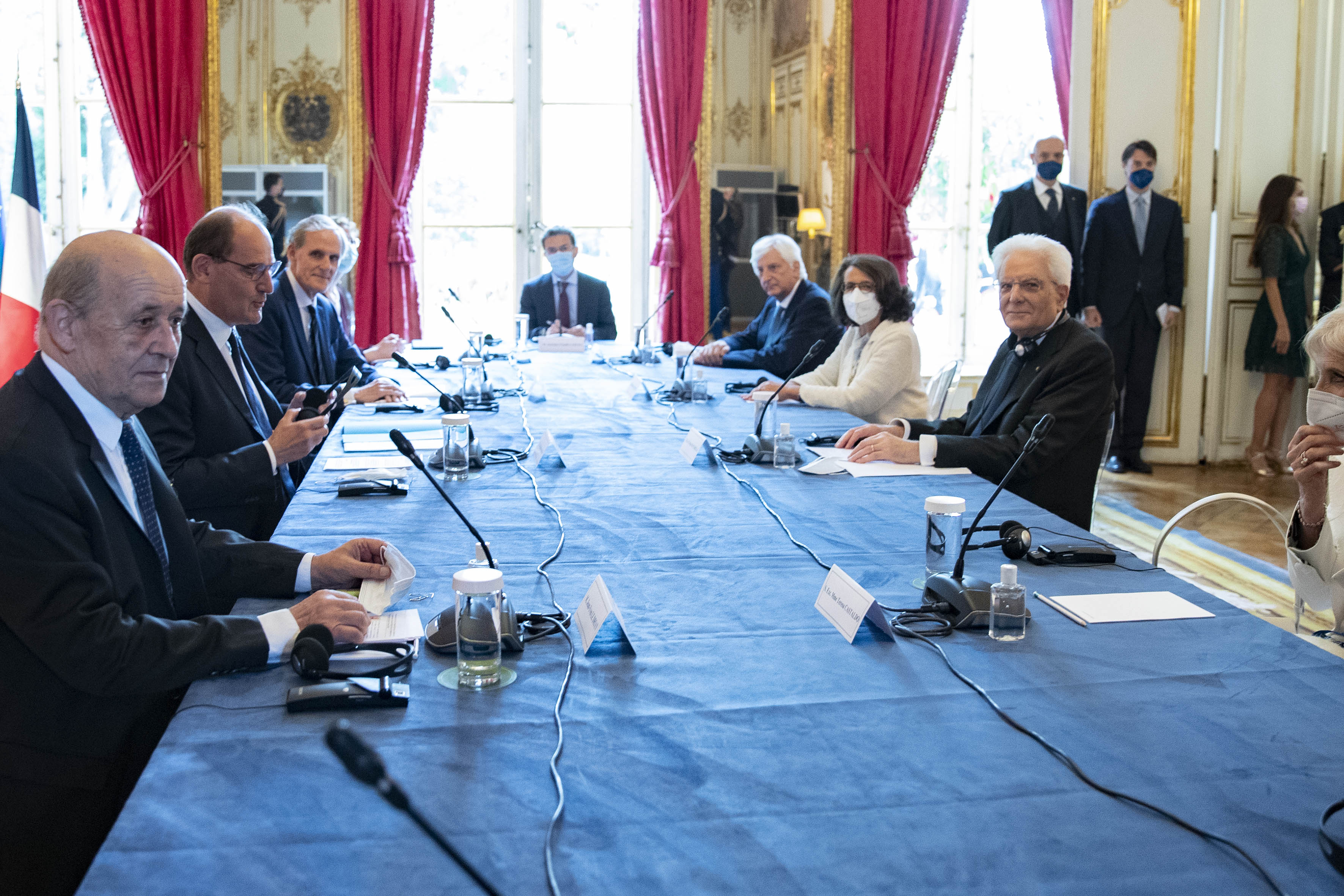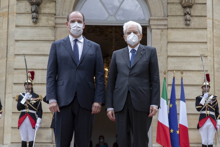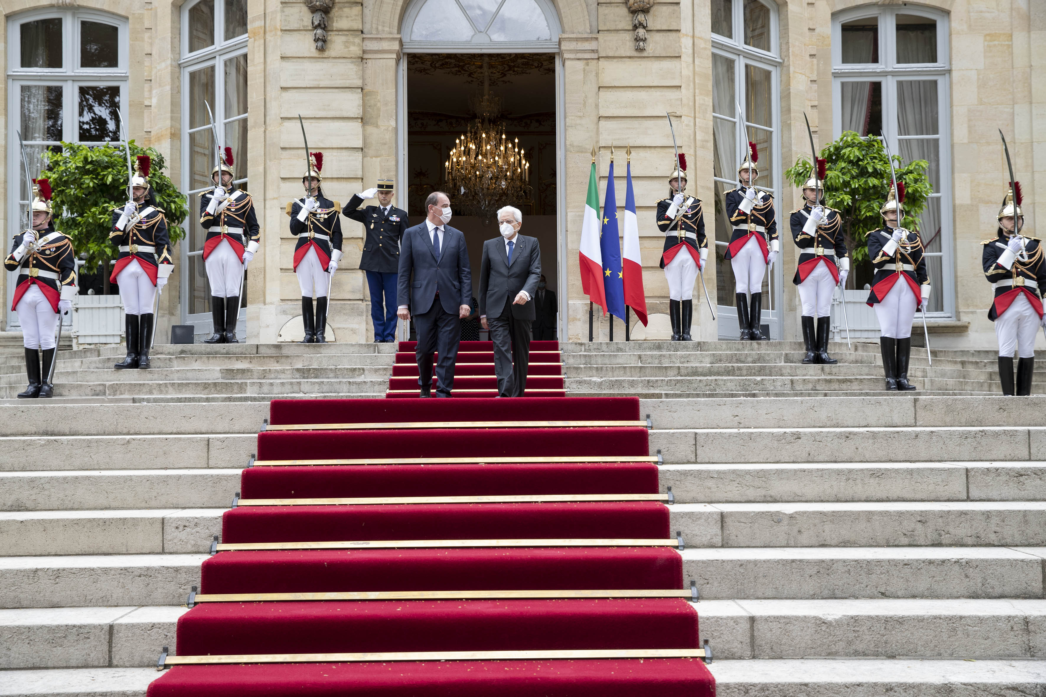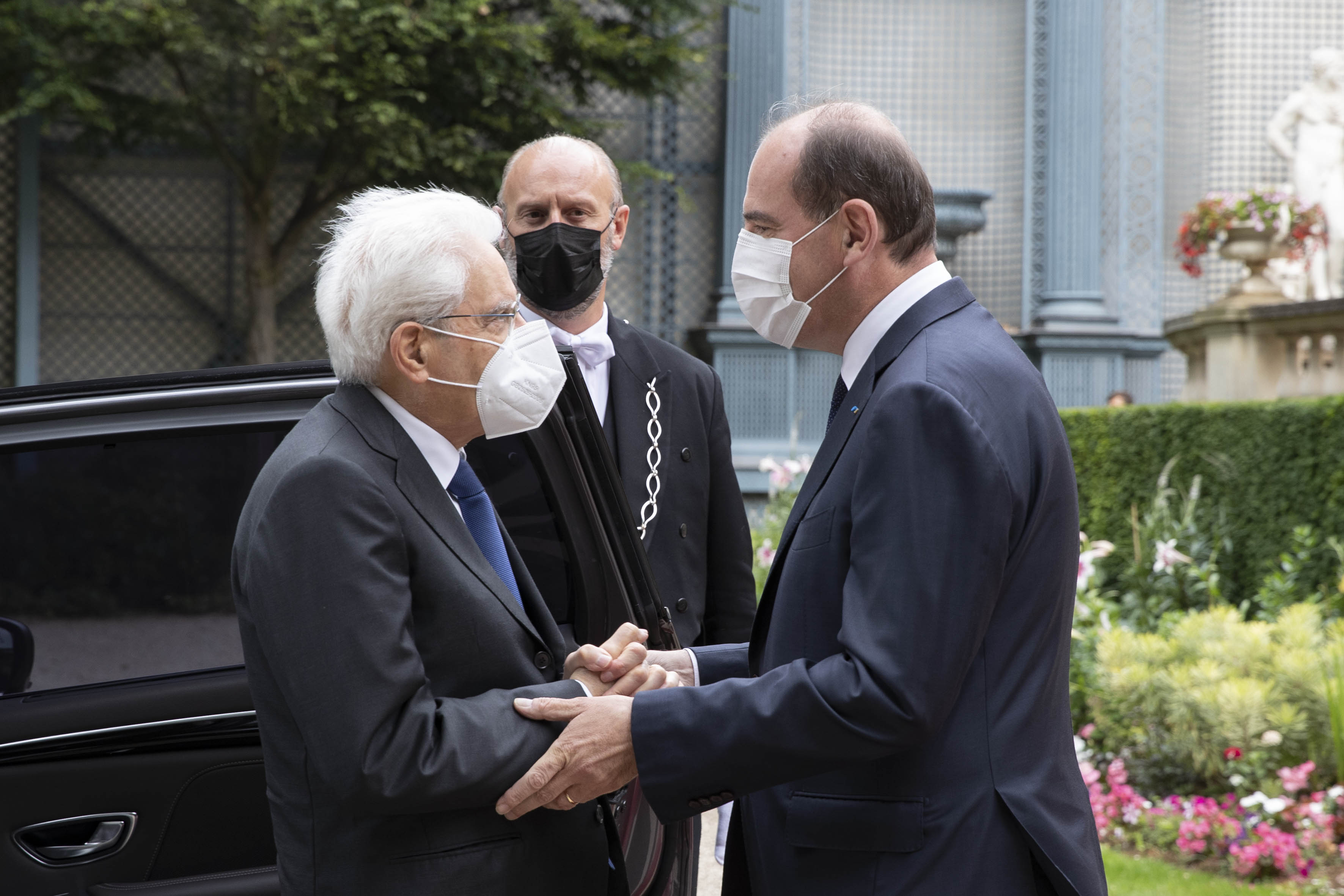 Il Presidente della Repubblica Sergio Mattarella all’Hôtel de Matignon con il Primo Ministro, Jean Castex