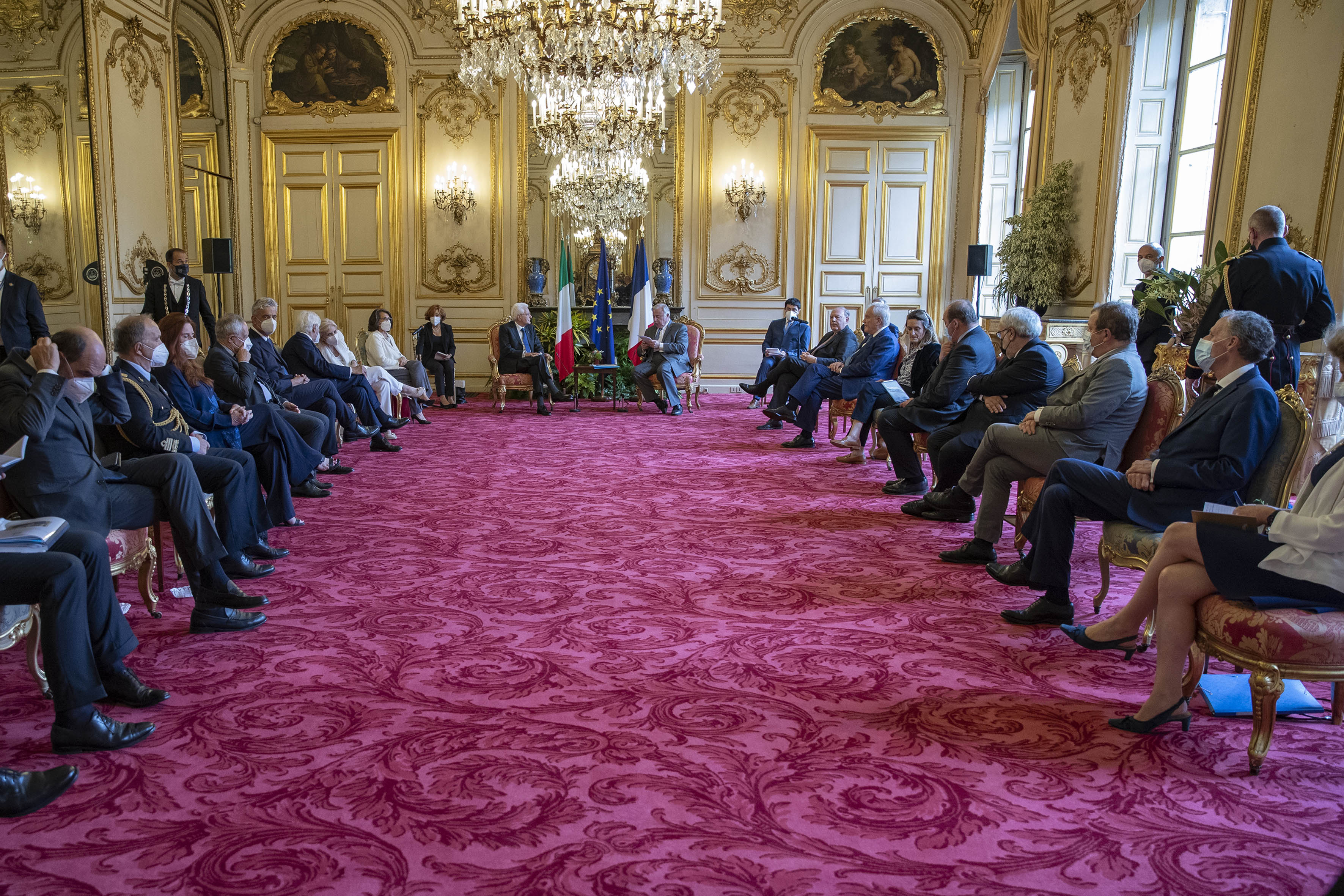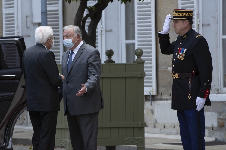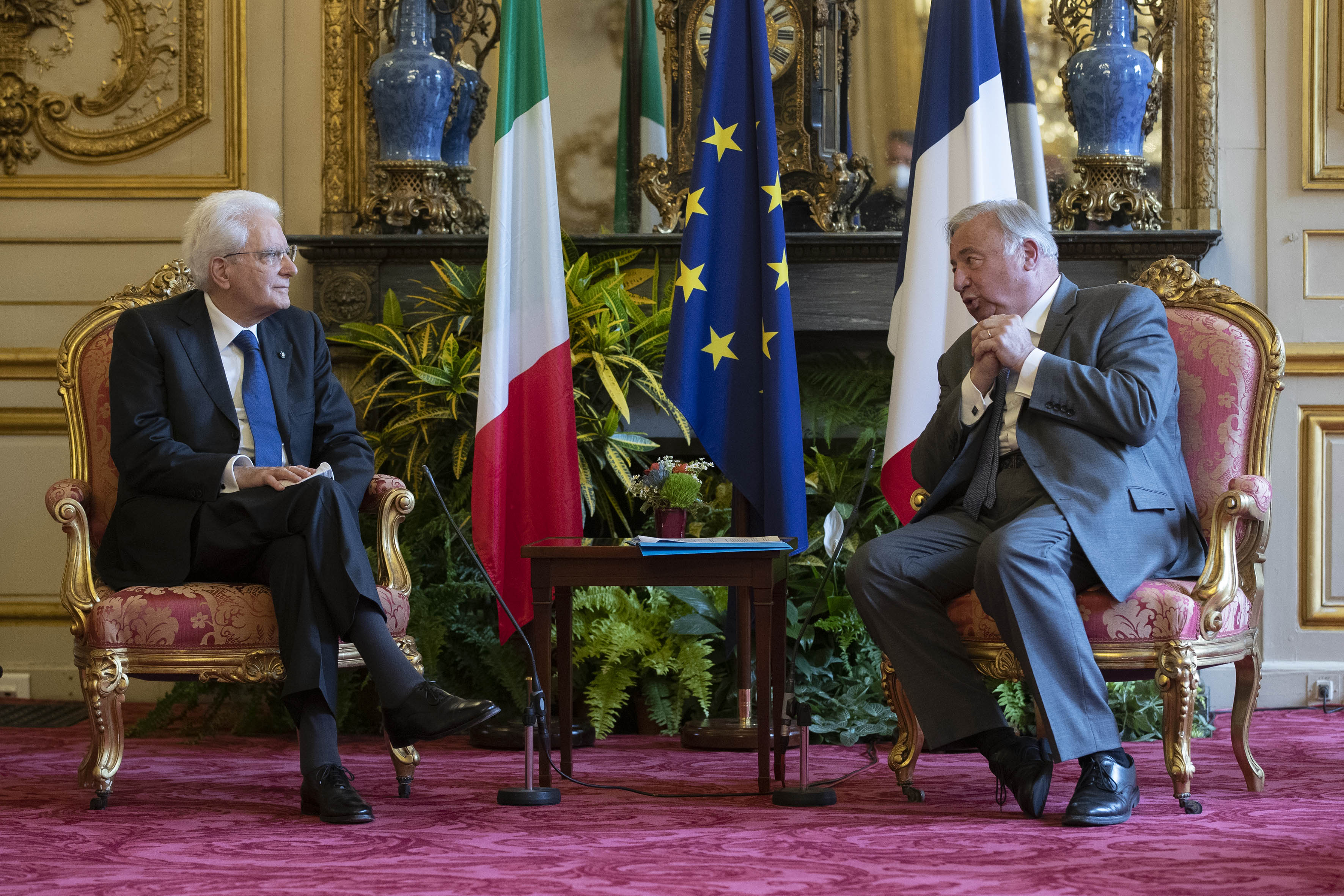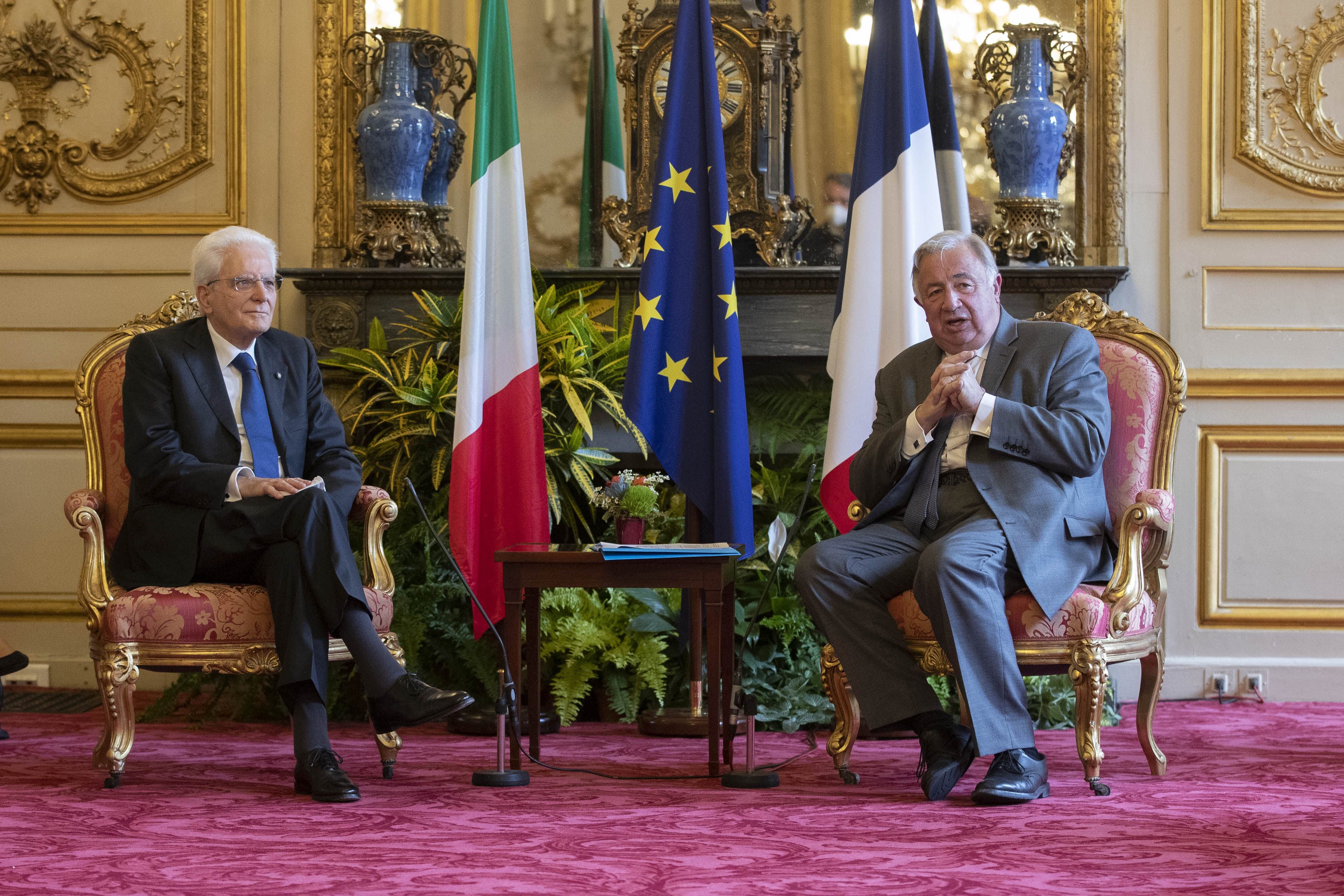 Il Presidente della Repubblica Sergio Mattarella nei corso dei colloqui con il Presidente del Sénat, Gérard Larcher, in occasione della visita di Stato nella Repubblica Francese .