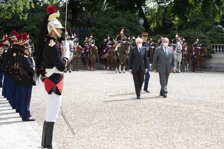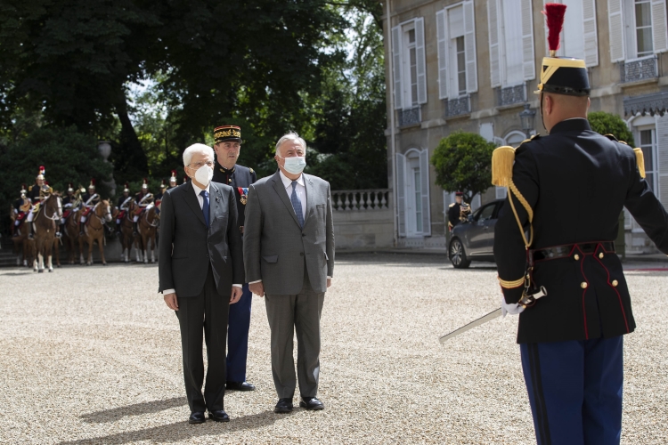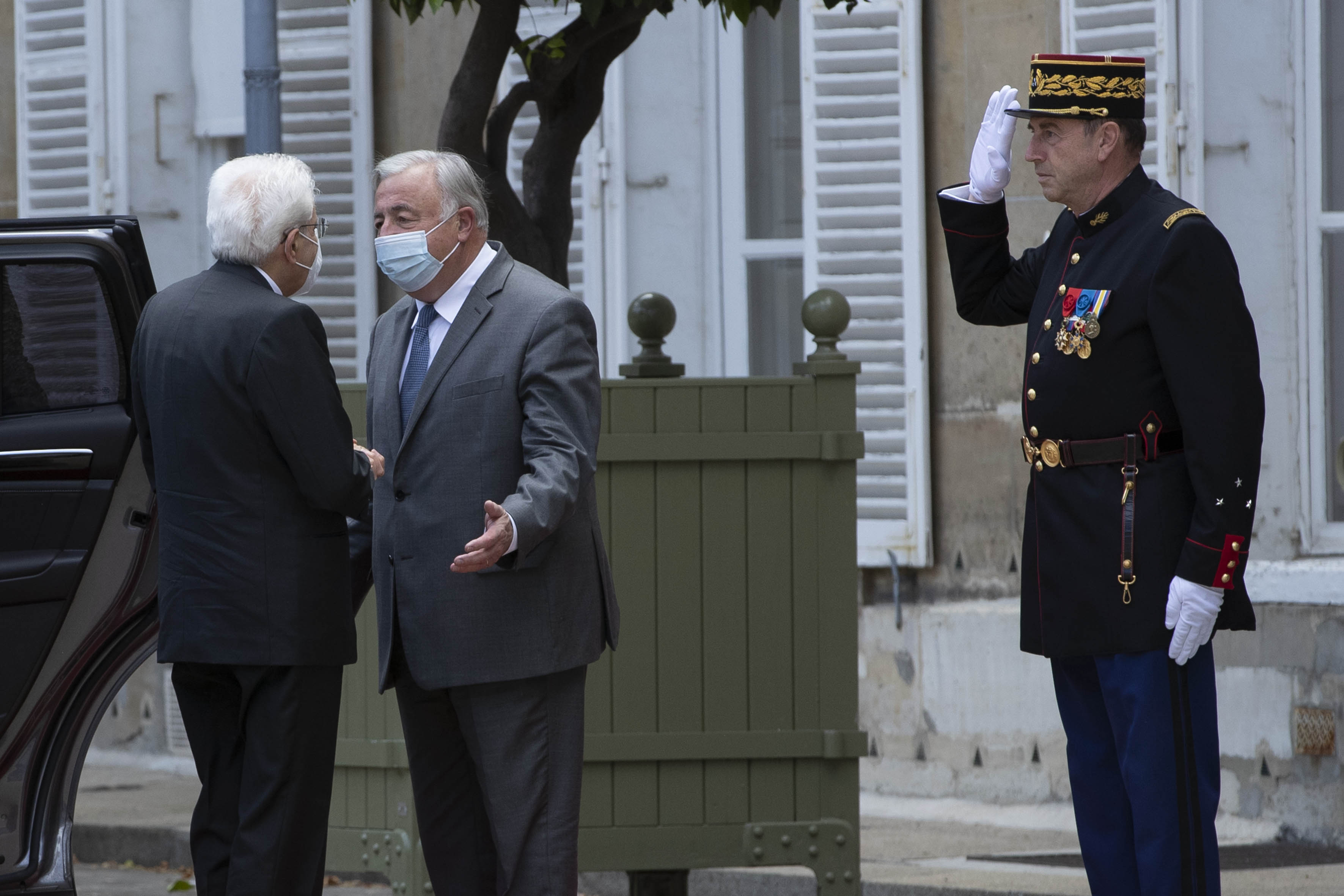 Il Presidente della Repubblica Sergio Mattarella accolto dal Presidente del Sénat, Gérard Larcher, in occasione della visita di Stato nella Repubblica Francese .