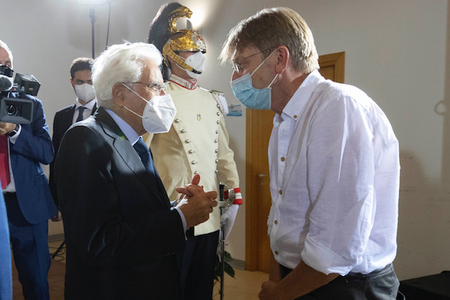 Il Presidente Sergio Mattarella al centro polifunzionale “Umberto Elia Terracini”,saluta Guy Verhofstadt,Co presidente del comitato esecutivo della conferenza sul futuro dell’Europa,in occasione del 40° seminario per la formazione federalista europea,nell’80° anniversario del Manifesto di Ventotene