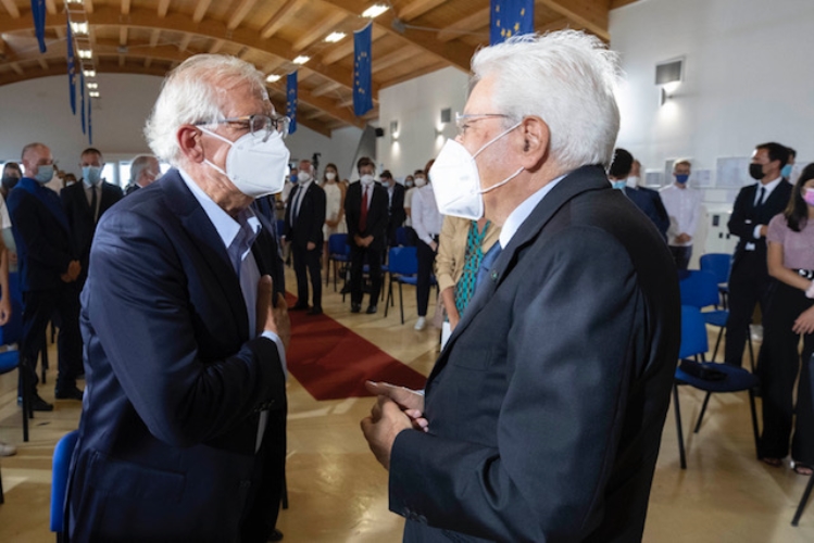 Il Presidente Sergio Mattarella al centro polifunzionale “Umberto Elia Terracini”,saluta Josep Borrell,Alto rappresentante dell'Unione per gli affari esteri e la politica di sicurezza,in occasione del 40° seminario per la formazione federalista europea,nell’80° anniversario del Manifesto di Ventotene