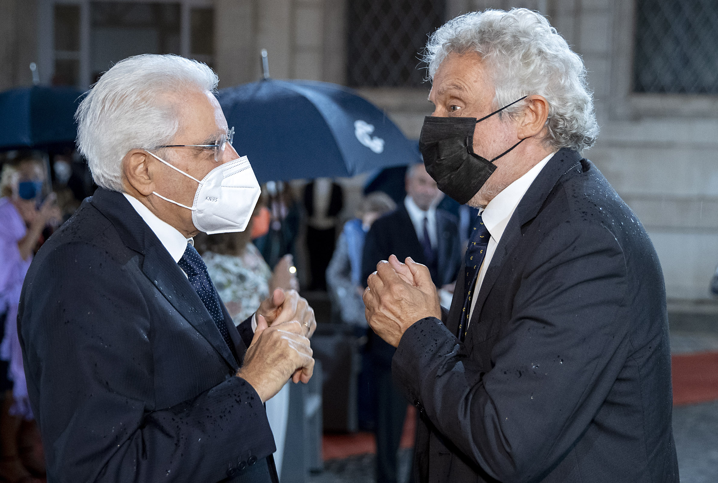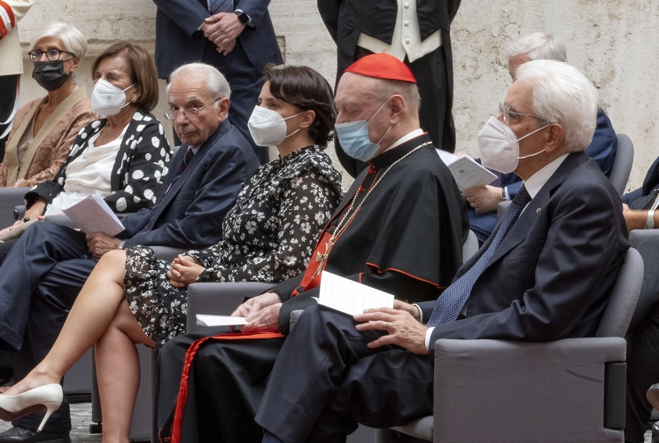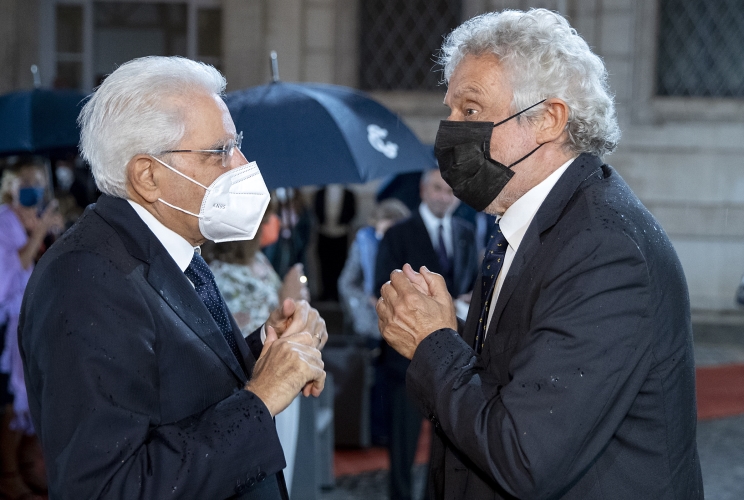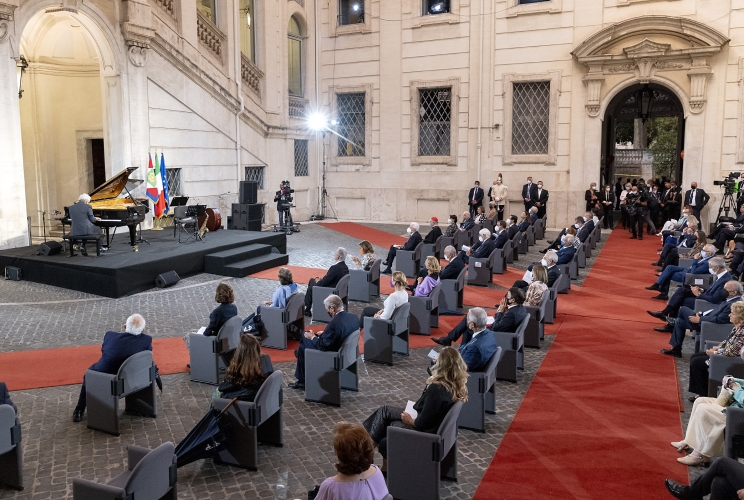 Il Presidente Sergio Mattarella saluta il M° Nicola Piovani, al termine del concerto promosso dalla Corte costituzionale nell’ambito della “Giornata mondiale dell’alfabetizzazione e della cultura” a conclusione del ciclo di Podcast “incontri”