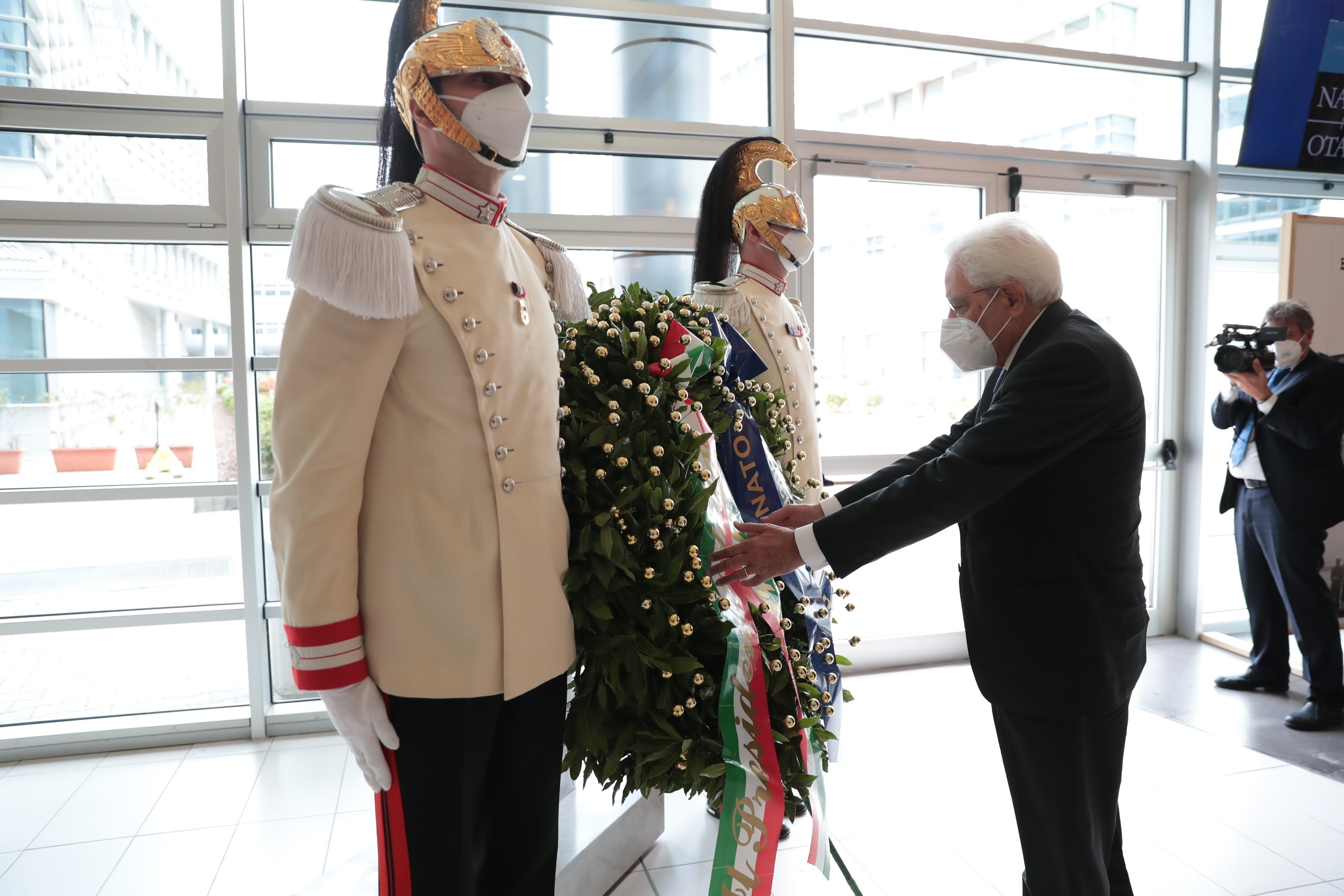 Il Presidente della Repubblica Sergio Mattarella depone una corona d'alloro sul monumento ai Caduti della NATO, in occasione della celebrazione del 70° anniversario della NATO in Italia