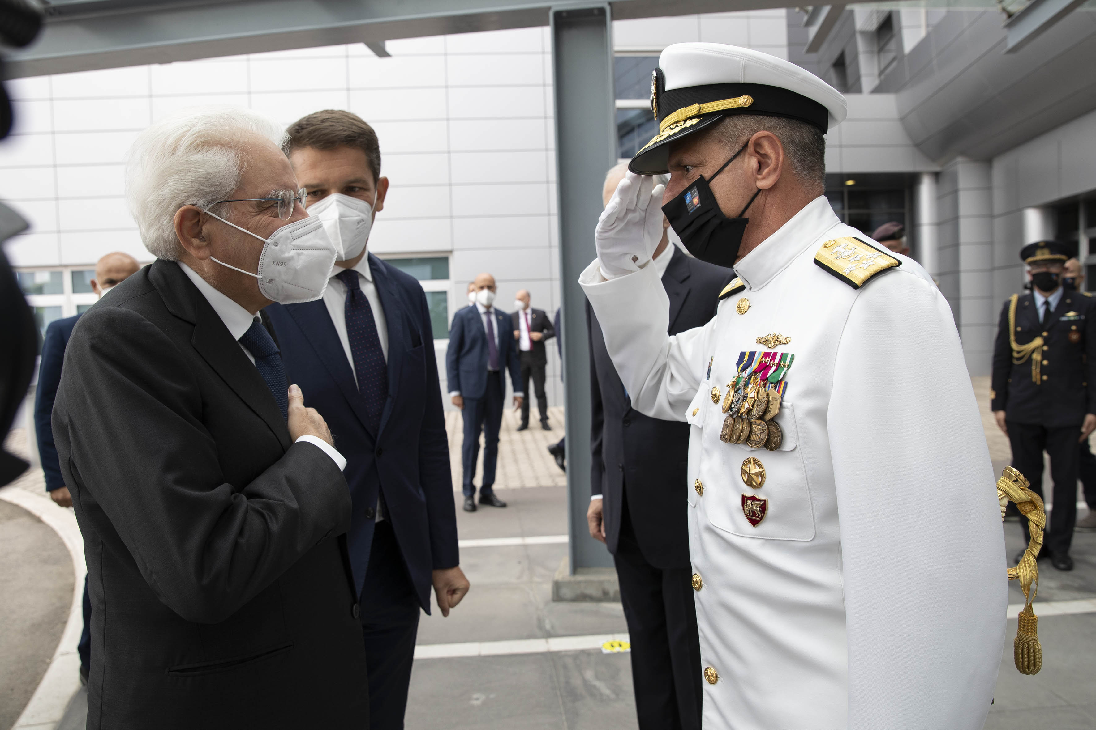 Il Presidente della Repubblica Sergio Mattarella accolto dall'Amm. Bob Burke, Comandante del Comando Interforze Alleato di Napoli, in occasione della cerimonia di celebrazione del 70° anniversario della NATO in Italia