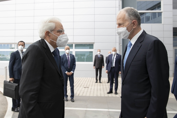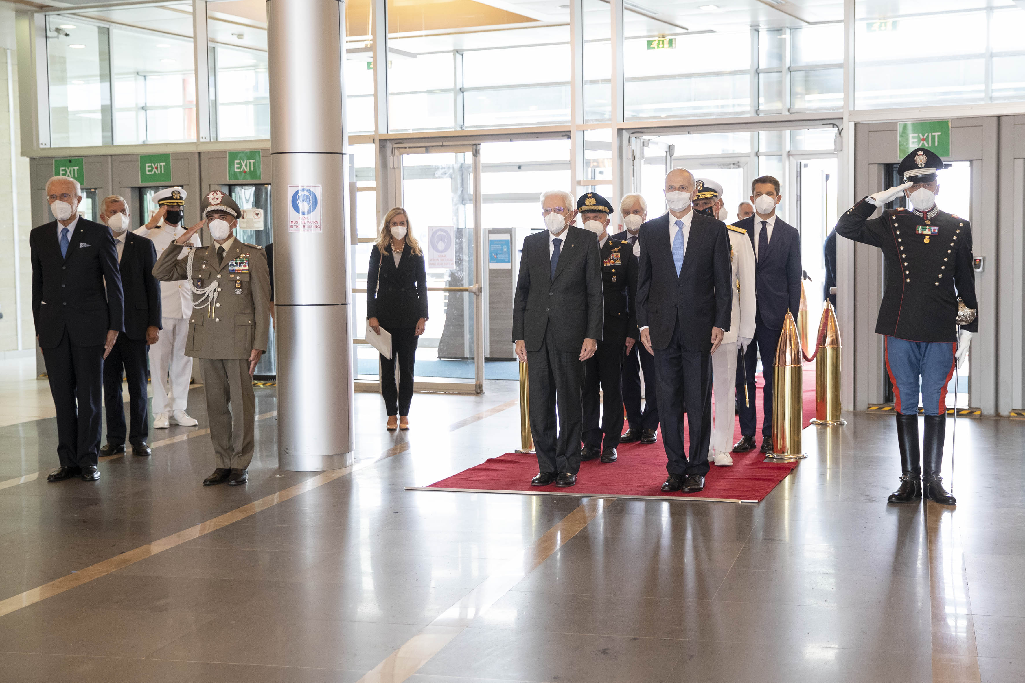 Il Presidente della Repubblica Sergio Mattarella saluta Lorenzo Guerini, Ministro della difesa,in occasione della cerimonia di celebrazione del 70° anniversario della NATO in Italia