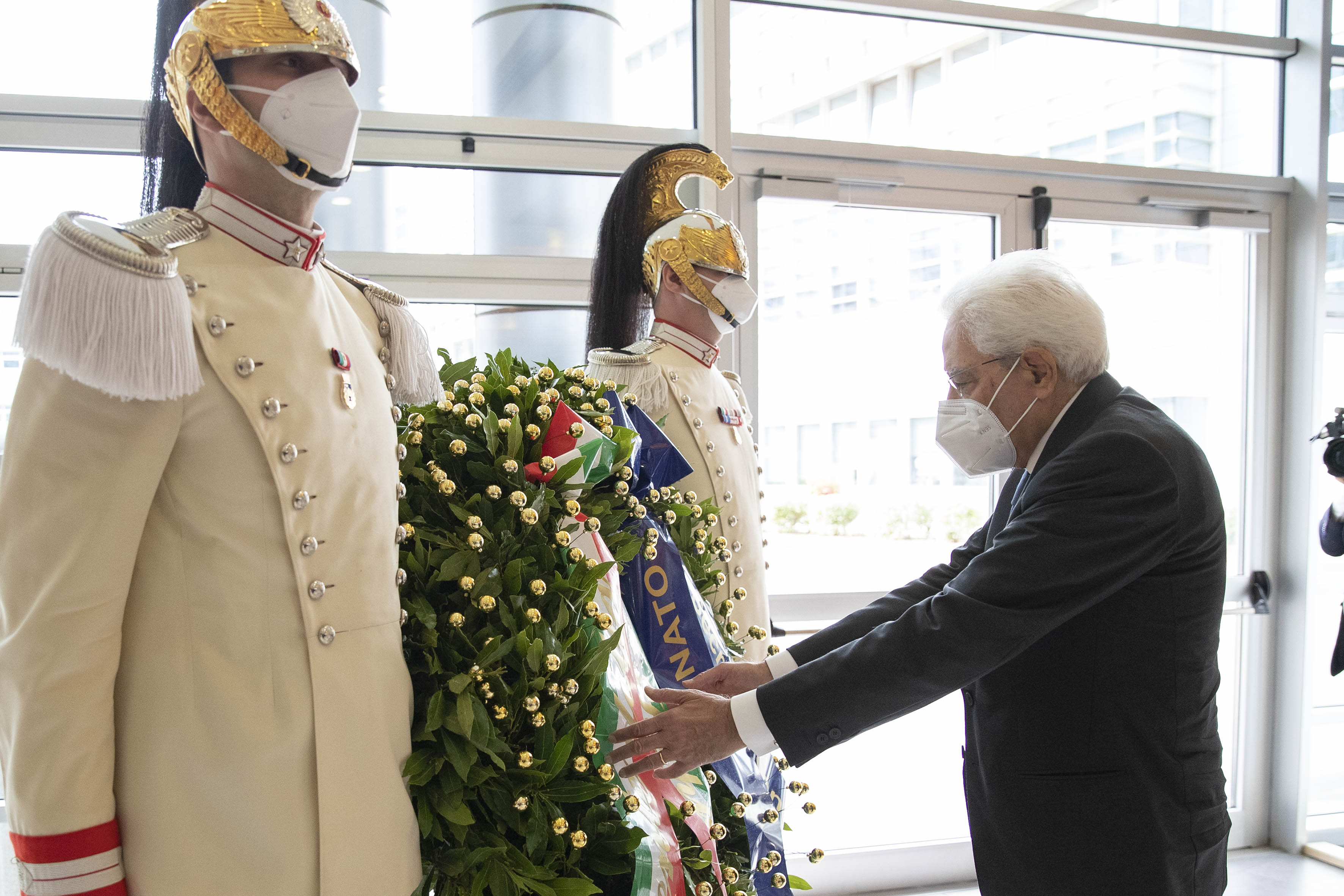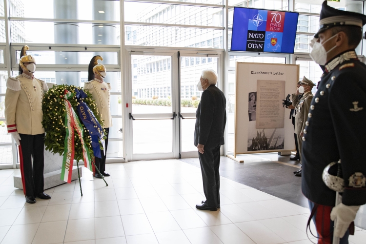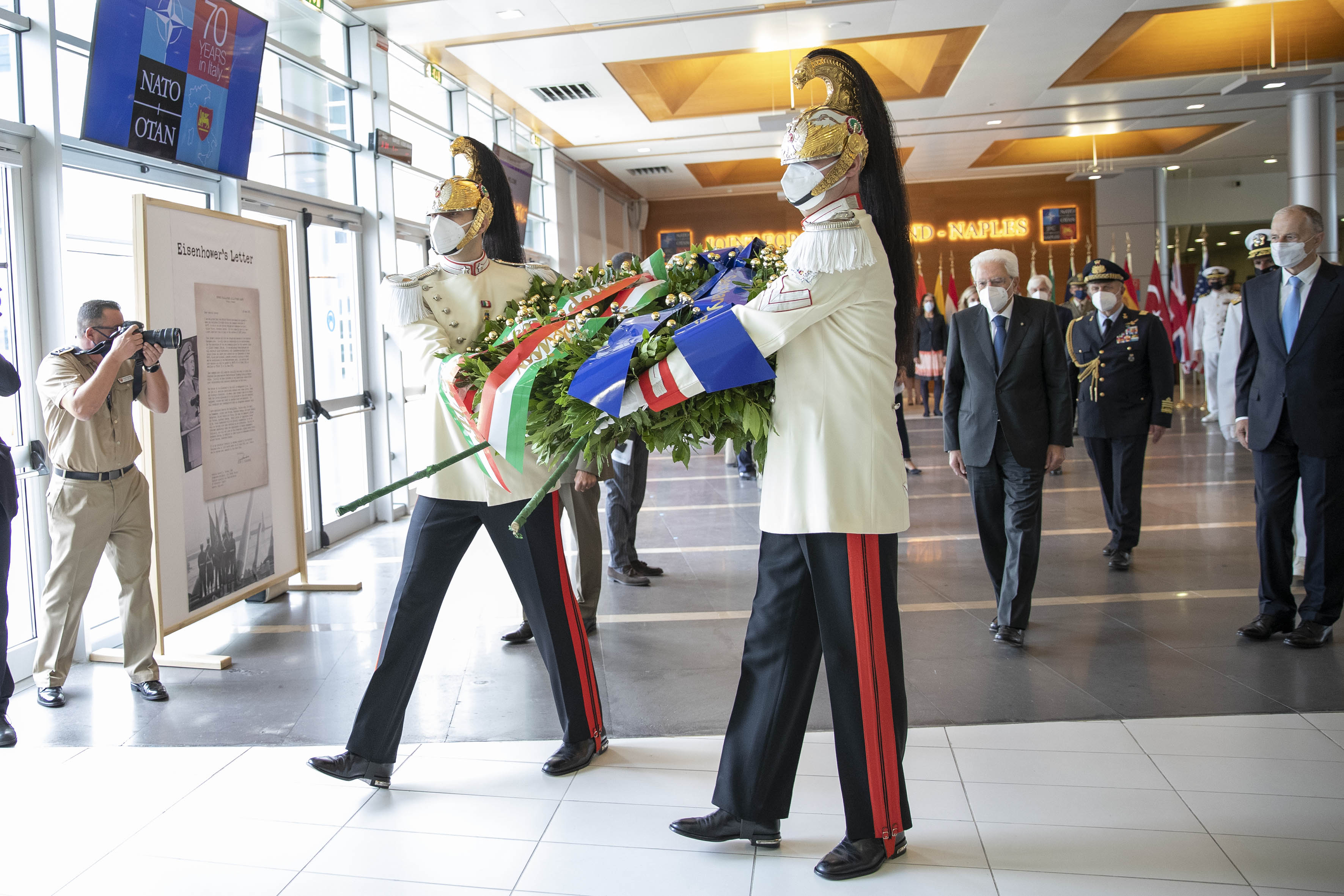 Il Presidente della Repubblica Sergio Mattarella depone, una corona d’alloro sul monumento ai Caduti della NATO,in occasione del 70° anniversario della NATO in Italia