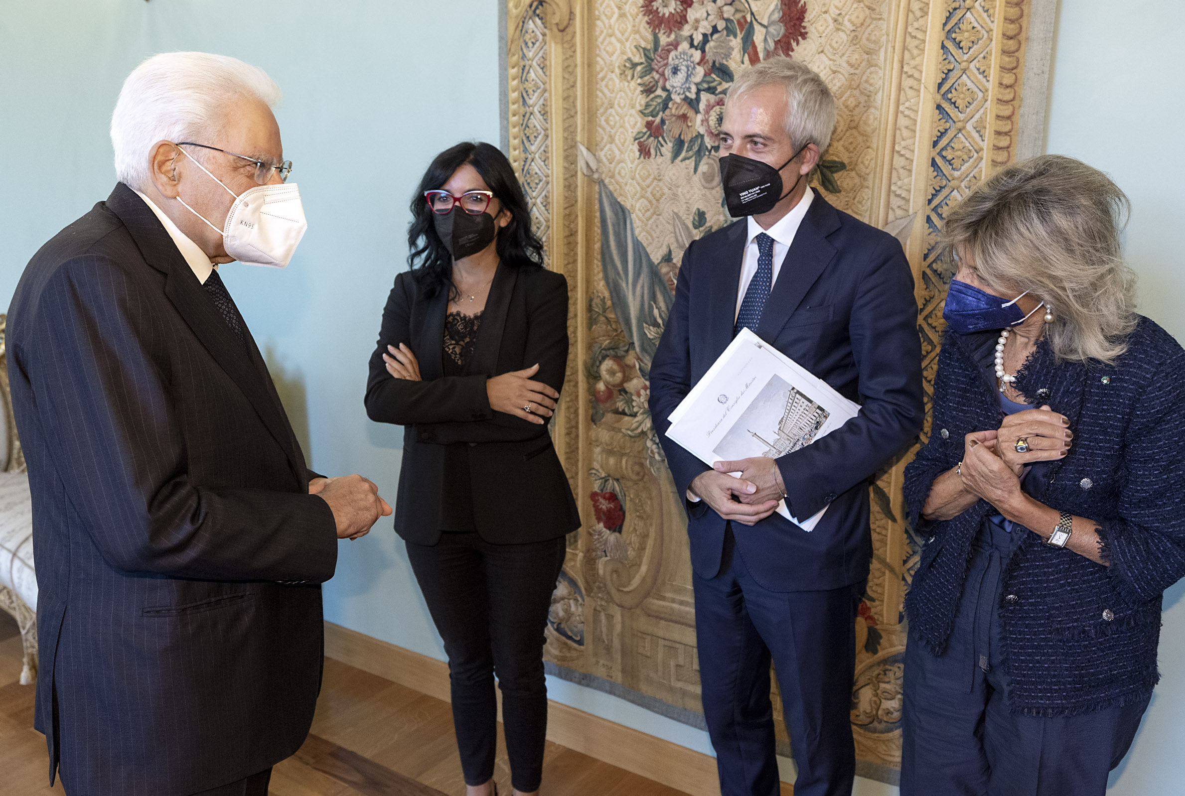 Il Presidente Sergio Mattarella con l'On. Fabiana Dadone, Ministro per le Politiche Giovanili, Giovanni Panebianco, Capo di Gabinetto del Ministro e Giuseppina Mengano Amarelli, Presidente del Comitato per gli Anniversari di Interesse Nazionale