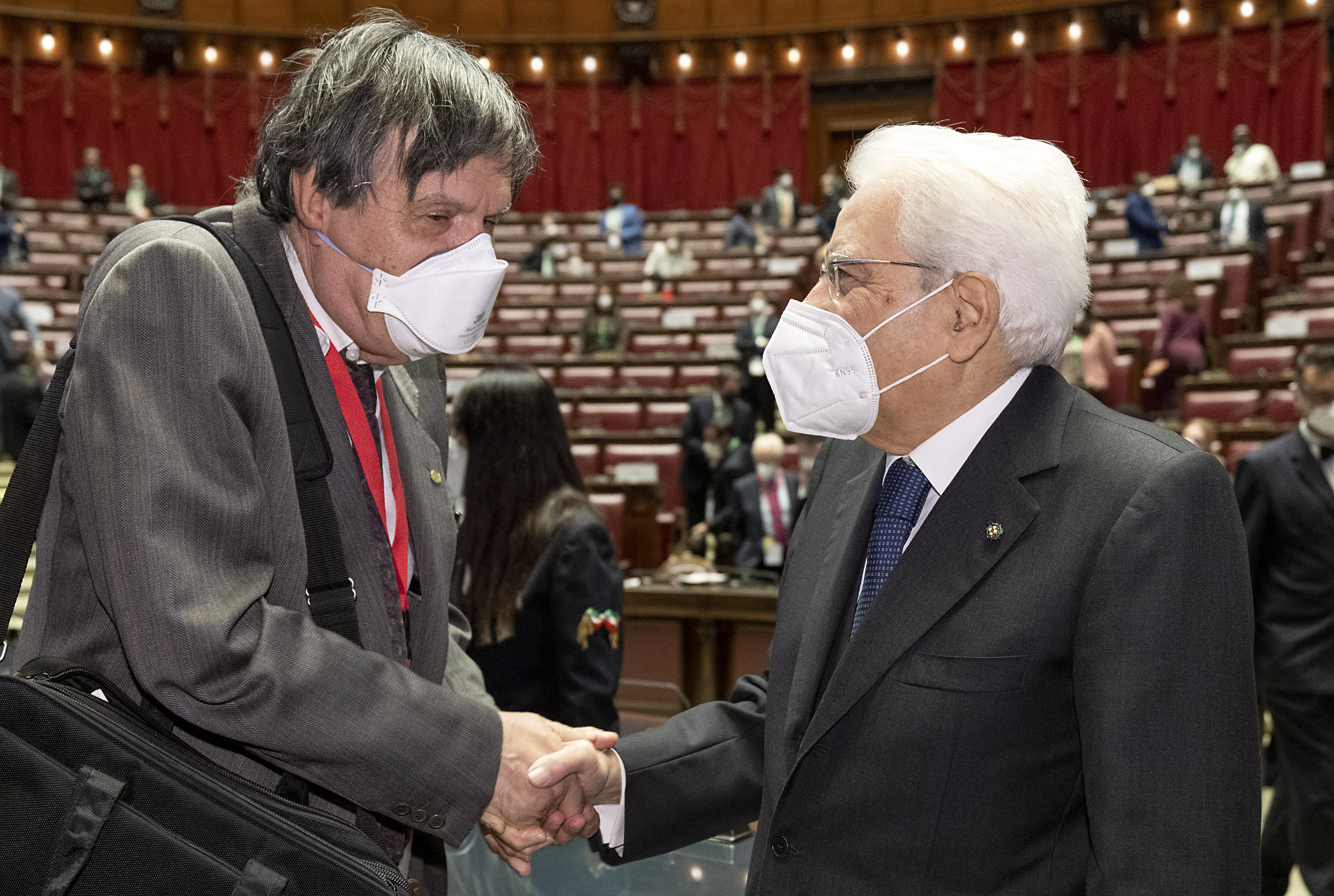 Il Presidente Sergio Mattarella con Giorgio Parisi, Premio Nobel per la Fisica 2021, al termine della cerimonia di apertura della riunione Parlamentare Pre-COP26