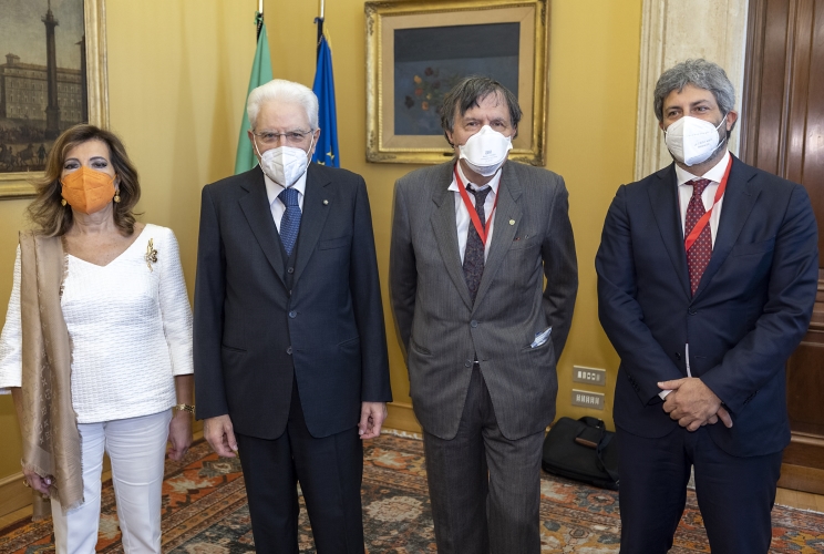 Il Presidente Sergio Mattarella con Giorgio Parisi, Premio Nobel per la Fisica 2021, la Presidente del Senato Maria Elisabetta Alberti Casellati e il Presidente della Camera Roberto Fico, in occasione della cerimonia di apertura della riunione Parlamentare Pre-COP26