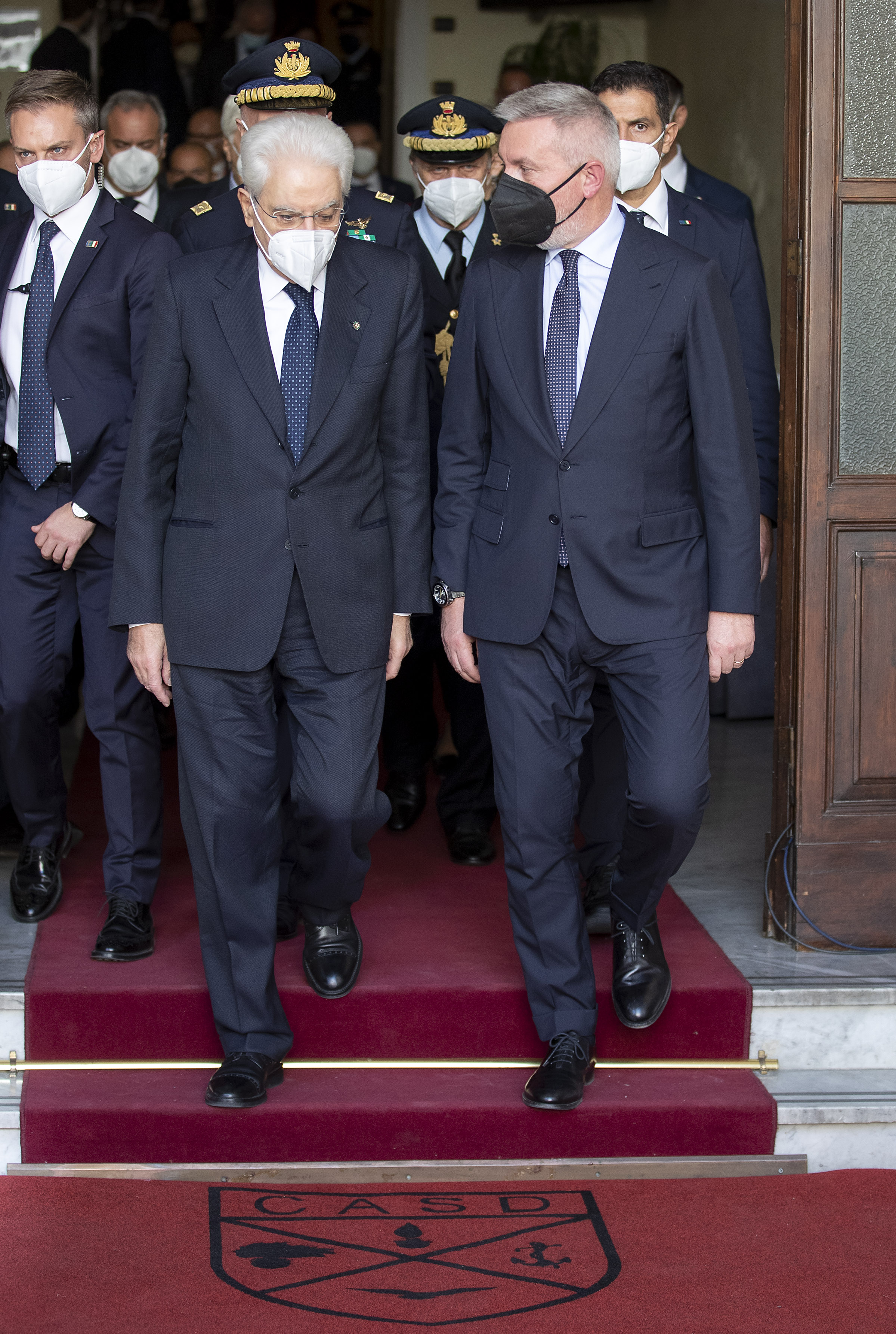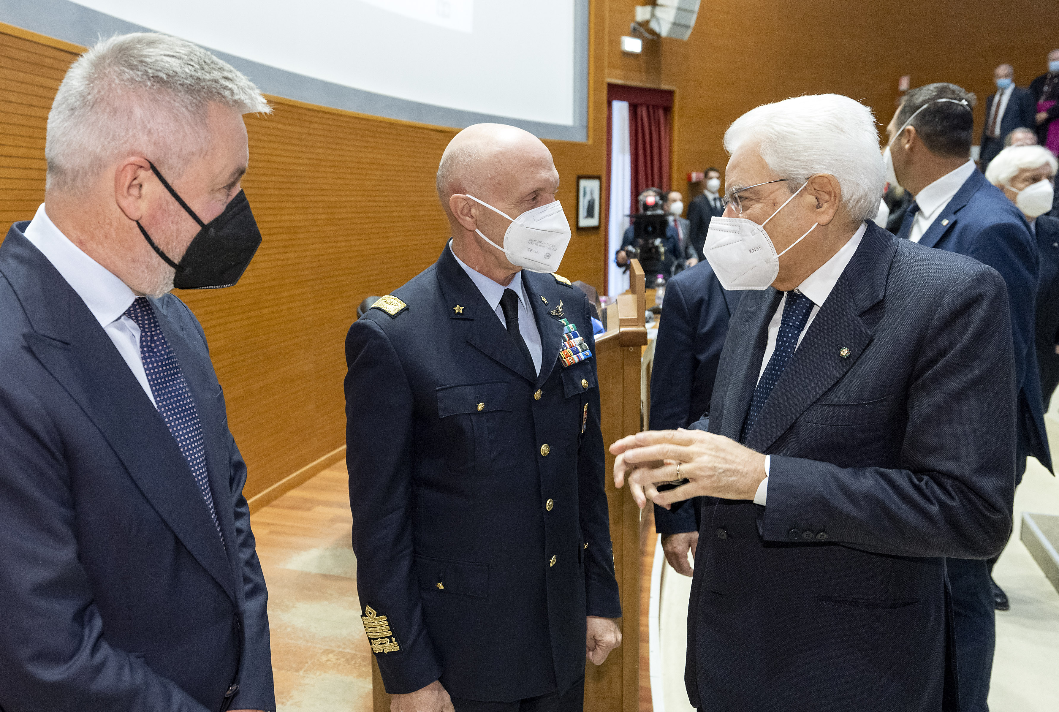Il Presidente Sergio Mattarella con Lorenzo Guerini, Ministro della Difesa il Gen. Enzo Vecciarelli, Capo di Stato Maggiore della Difesa, al termine della cerimonia di apertura dell’anno accademico delle scuole e degli istituti di formazione della Difesa 2021/2022