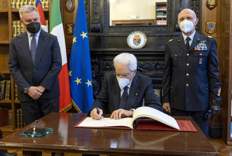 Il Presidente Sergio Mattarella con Lorenzo Guerini, Ministro della Difesa il Gen. Enzo Vecciarelli, Capo di Stato Maggiore della Difesa, durante la firma dell’Albo d’Onore, in occasione della cerimonia di apertura dell’anno accademico delle scuole e degli istituti di formazione della Difesa 2021/2022