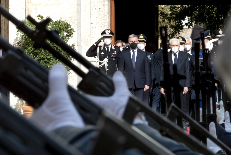 Il Presidente Sergio Mattarella con Lorenzo Guerini, Ministro della Difesa in occasione della cerimonia di apertura dell’anno accademico delle scuole e degli istituti di formazione della Difesa 2021/2022