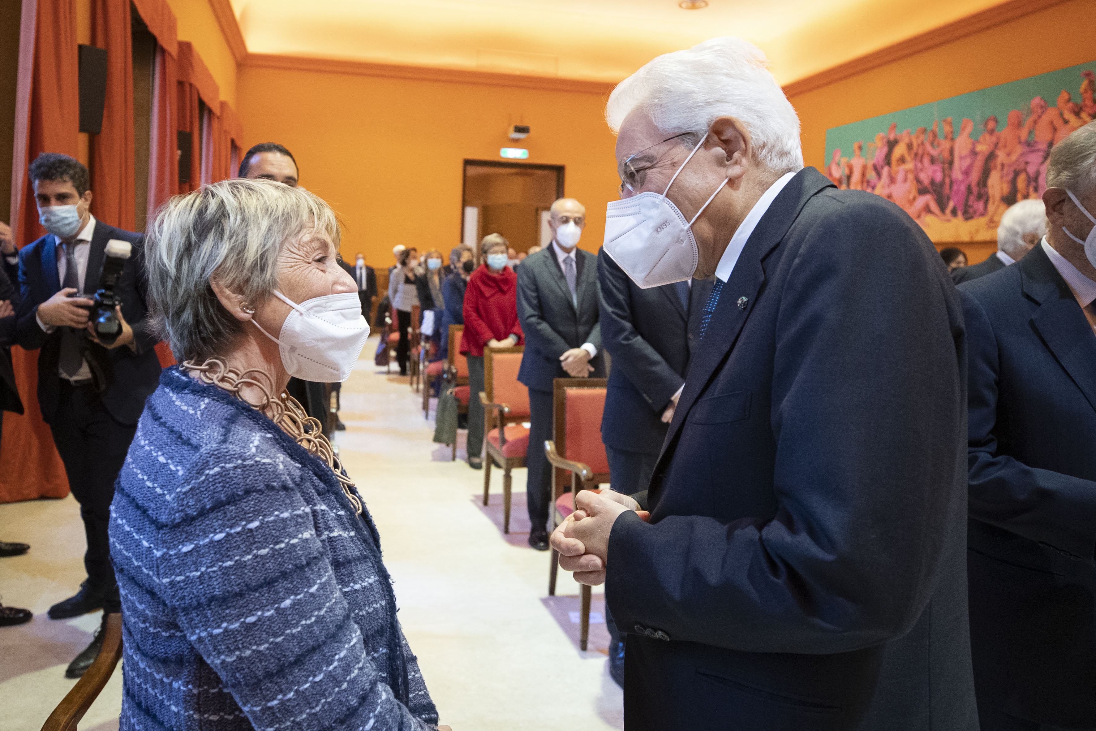 Il Presidente della Repubblica Sergio Mattarella saluta Gabriella Ciampi,in occasione della cerimonia di presentazione degli Studi in onore di Carlo Azeglio Ciampi elaborati in occasione dei cento anni dalla nascita (1920-2020)