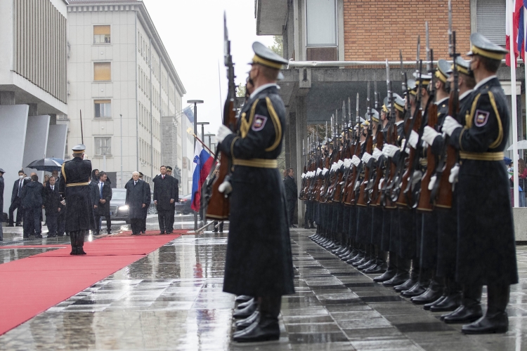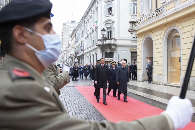 Il Presidente della Repubblica, Sergio Mattarella a Nova Gorica, Piazza Bevk, con Borut Pahor Presidente della Repubblica di Slovenia, durante gli onori militari