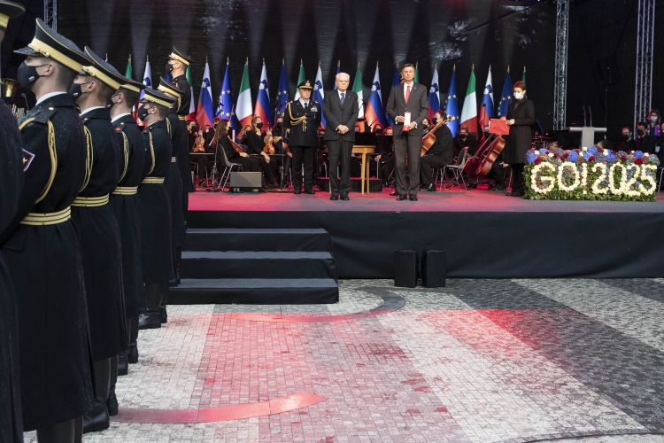 I Presidenti Mattarella e Pahor, a Piazzale della Transalpina, confine tra Italia e Slovenia, in occasione della Cerimonia di celebrazione della designazione congiunta di Nova Gorica e Gorizia quali Capitale Europea della Cultura 2025