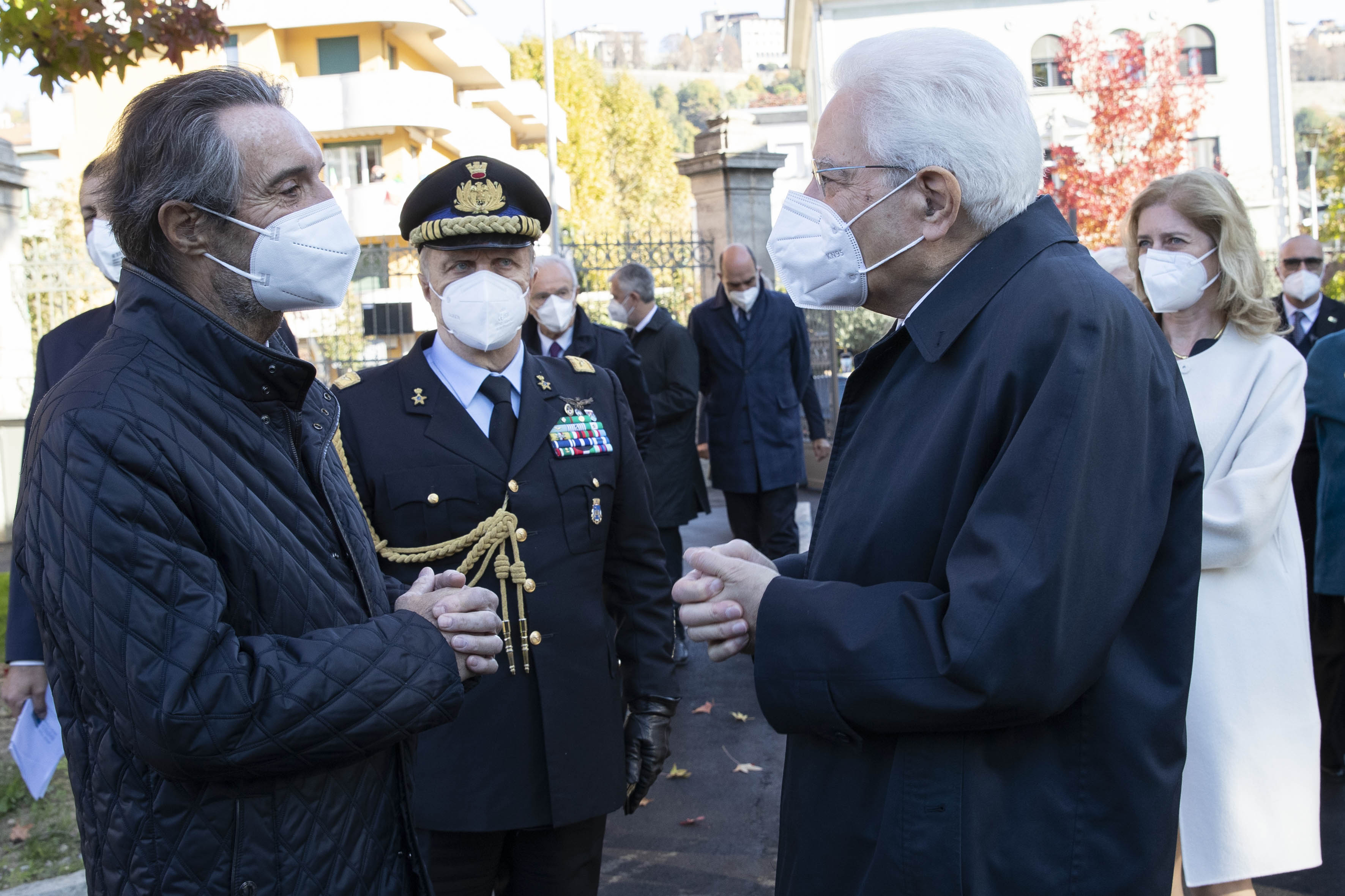 Il Presidente della Repubblica Sergio Mattarella accolto dal Presidente della Regione Lombardia Attilio Fontana,in occasione dell'inaugurazione della nuova sede dell’Accademia e all’apertura dell’anno di studi 2021/2022 della Guardia di Finanza