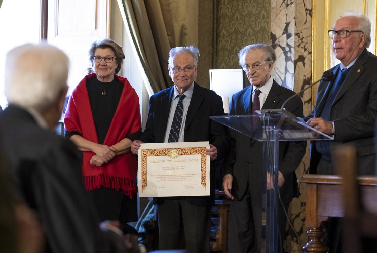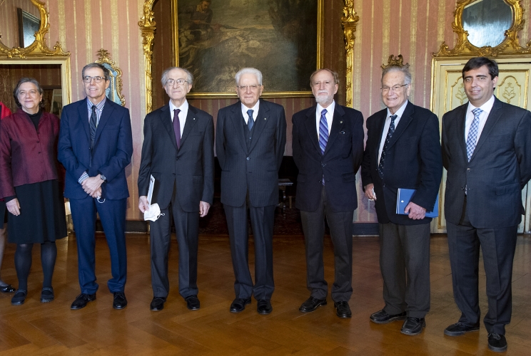 Il Presidente Sergio Mattarella con Alberto Quadrio Curzio, Presidente del Consiglio della Fondazione Internazionale Balzan “Premio”, Roberto Antonelli, Presidente dell’Accademia Nazionale dei Lincei e i vinicitori dei Premi Balzan 2020