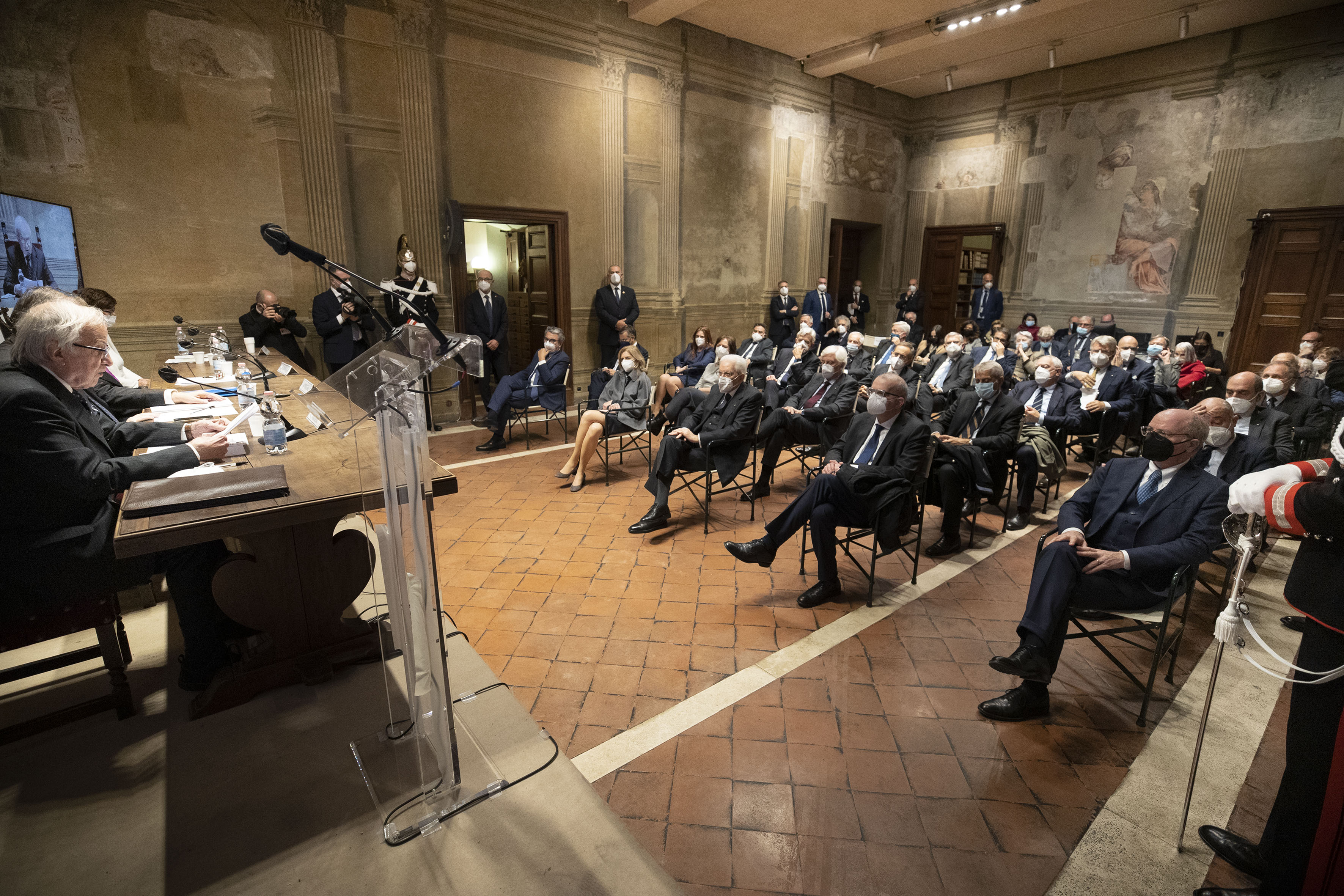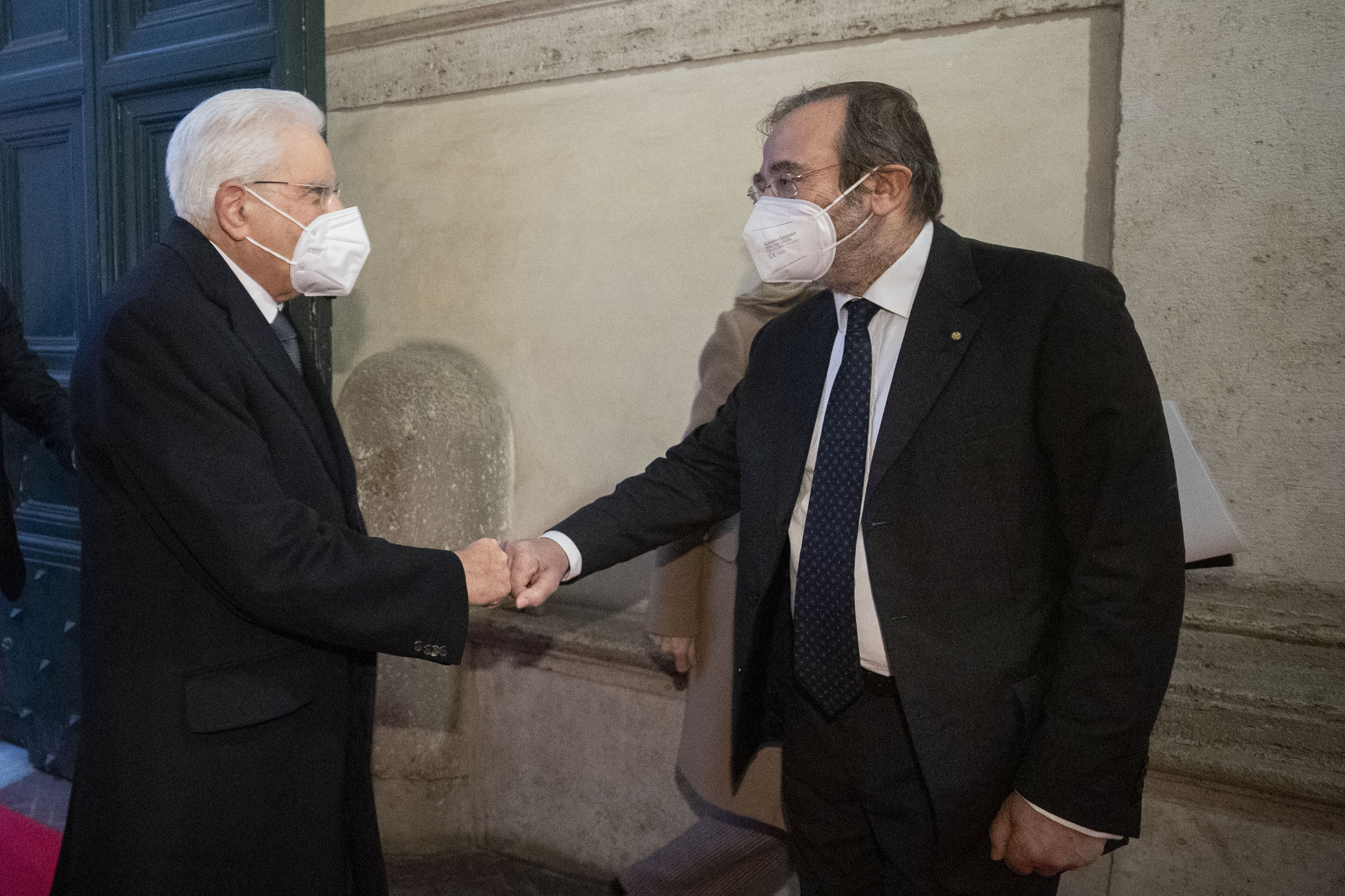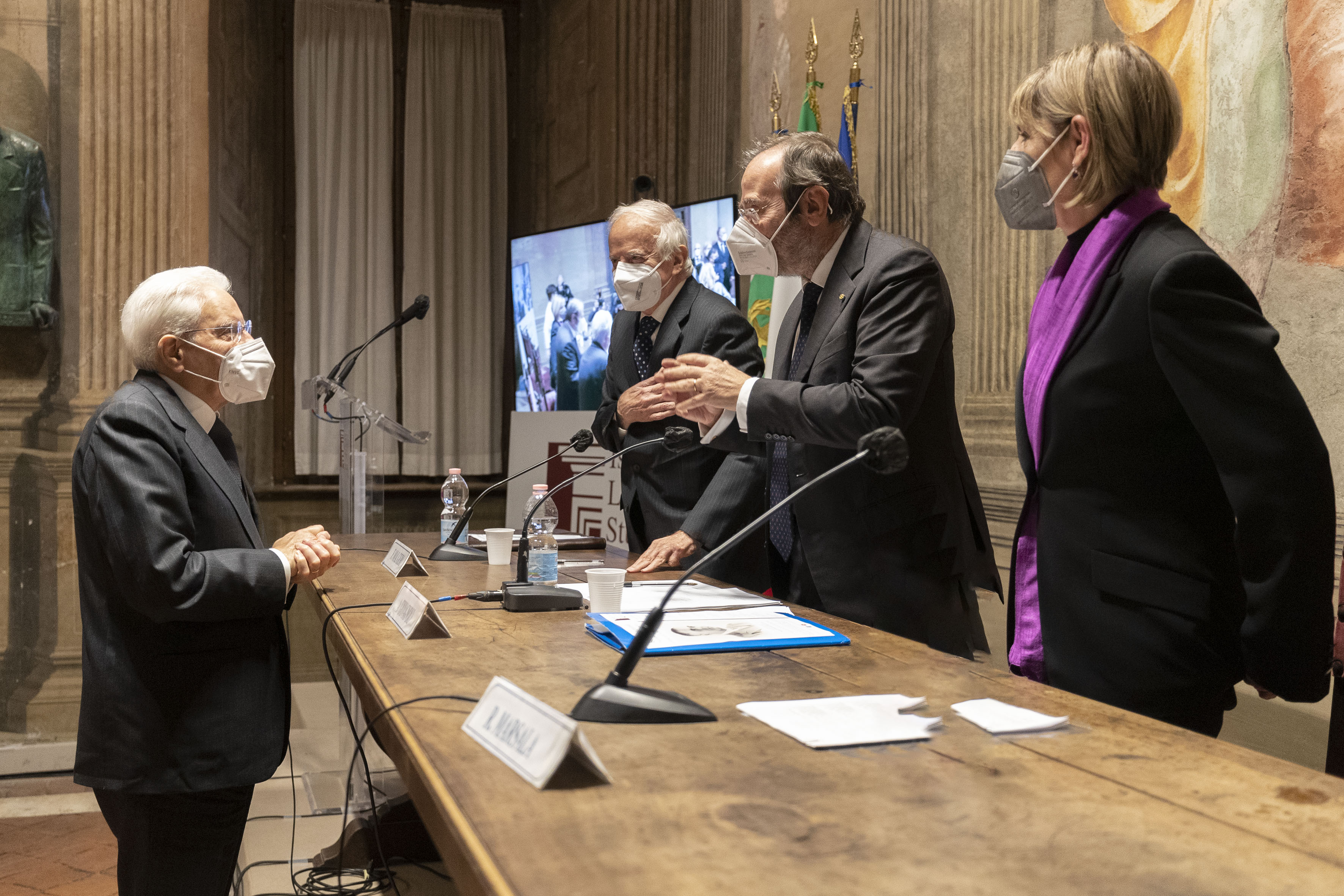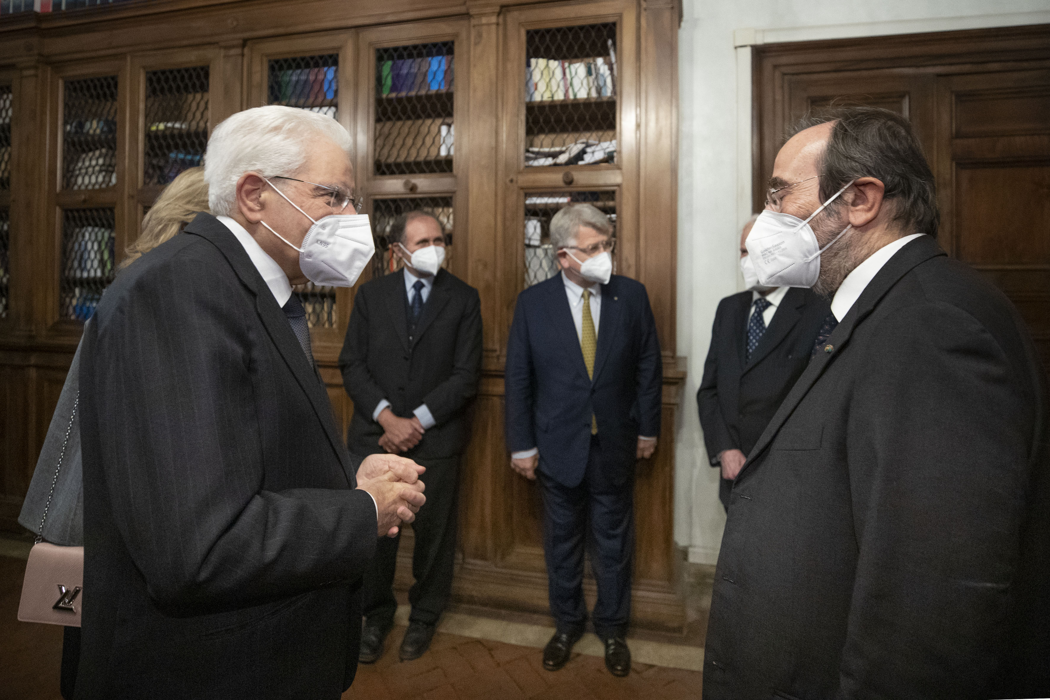 Il Presidente della Repubblica Sergio Mattarella accolto da Agostino Giovagnoli, Professore ordinario di Storia contemporanea presso l’Università Cattolica del Sacro Cuore di Milano, in occasione della commemorazione del cinquantesimo della scomparsa di Bernardo Mattarella - La Sicilia, la D.C., la Storia della Repubblica