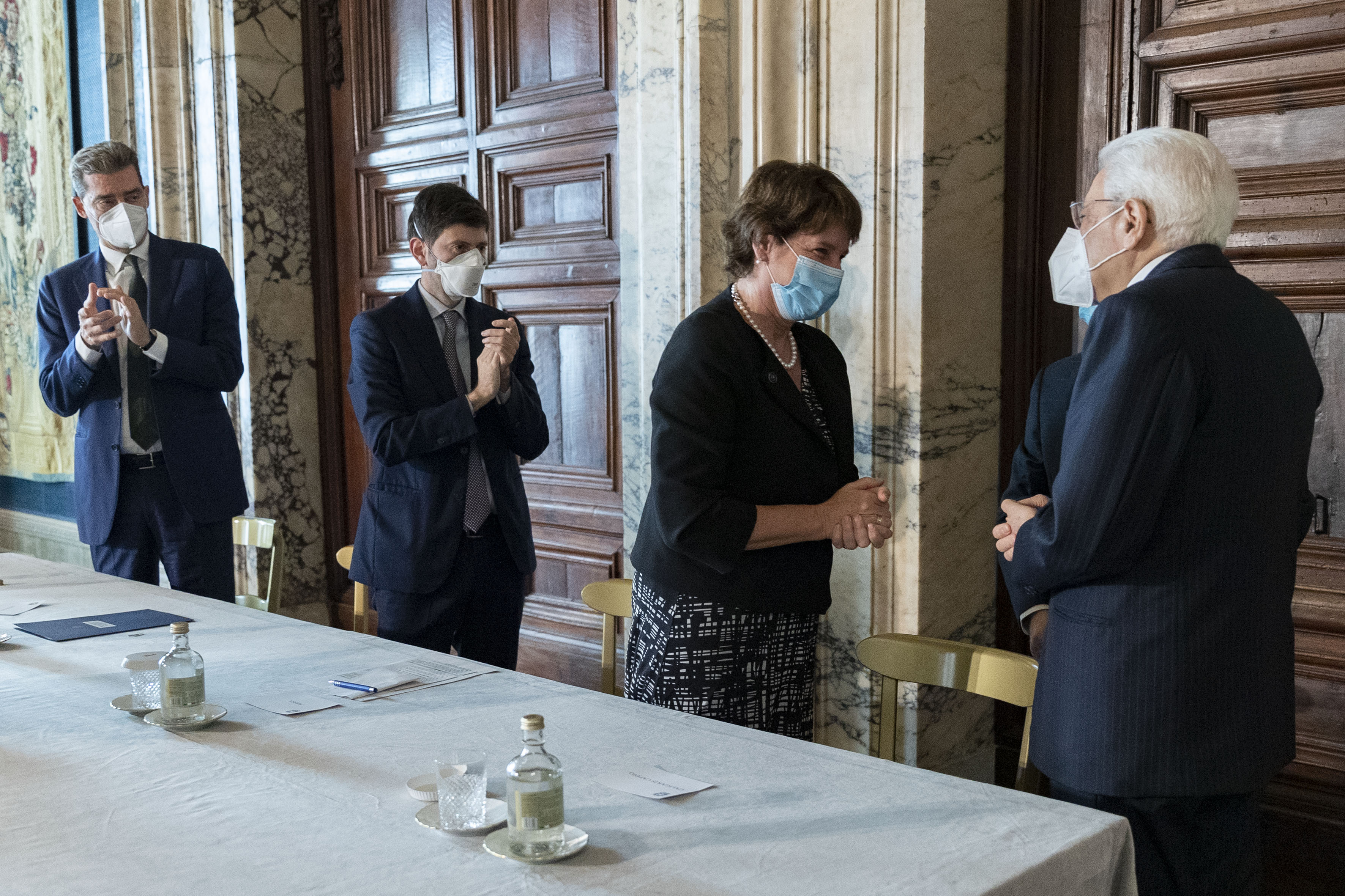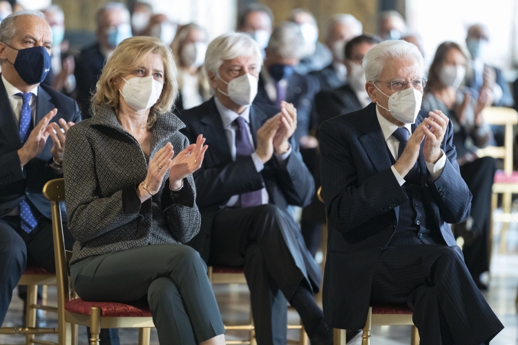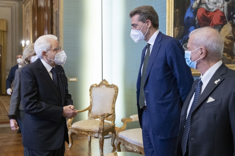 Il Presidente della Repubblica Sergio Mattarella con Andrea Sironi, Presidente della Fondazione AIRC, Federico Caligaris-Cappio, Direttore scientifico della Fondazione AIRC, e la Prof.ssa Silvia Piconese, Ricercatrice AIRC, in occasione della cerimonia di celebrazione de “I Giorni della Ricerca”