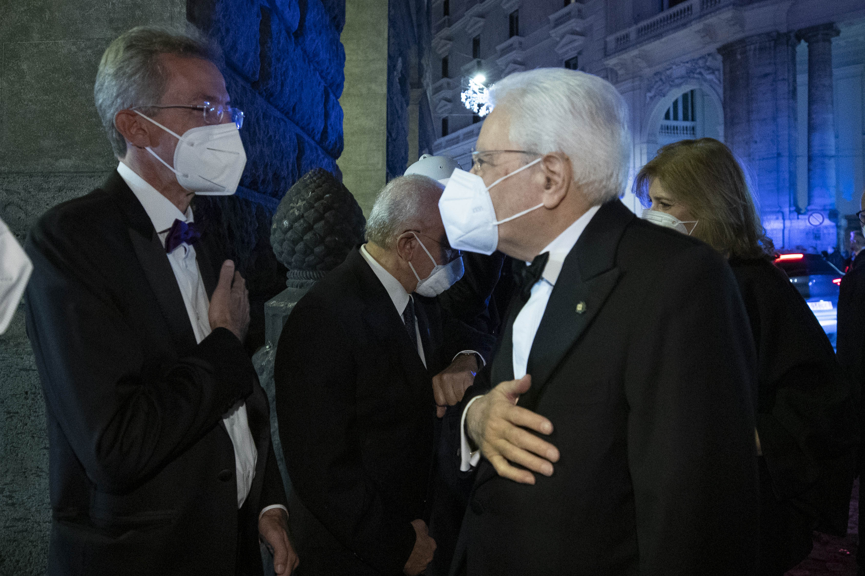 Il Presidente della Repubblica Sergio Mattarella al Teatro San Carlo di Napoli saluta Roberto Fico, Presidente della Camera dei Deputati,Vincenzo De Luca, Presidente della Regione Campania,e Gaetano Manfredi, Sindaco di Napoli.in occasione della rappresentazione dell'opera “Otello” di Giuseppe Verdi
