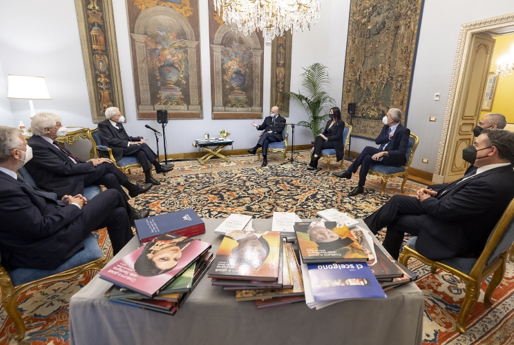 Il Presidente Sergio Mattarella con Sergio Zuncheddu, Editore e Presidente dell’Unione sarda SpA, unitamente a Emanuele Dessì, Lia Serrelli e a Lorenzo Paolini, rispettivamente Direttore responsabile, Direttore generale e Direttore editoriale e condirettore del quotidiano, in occasione del centocinquantesimo anniversario della nascita di Grazia Deledda