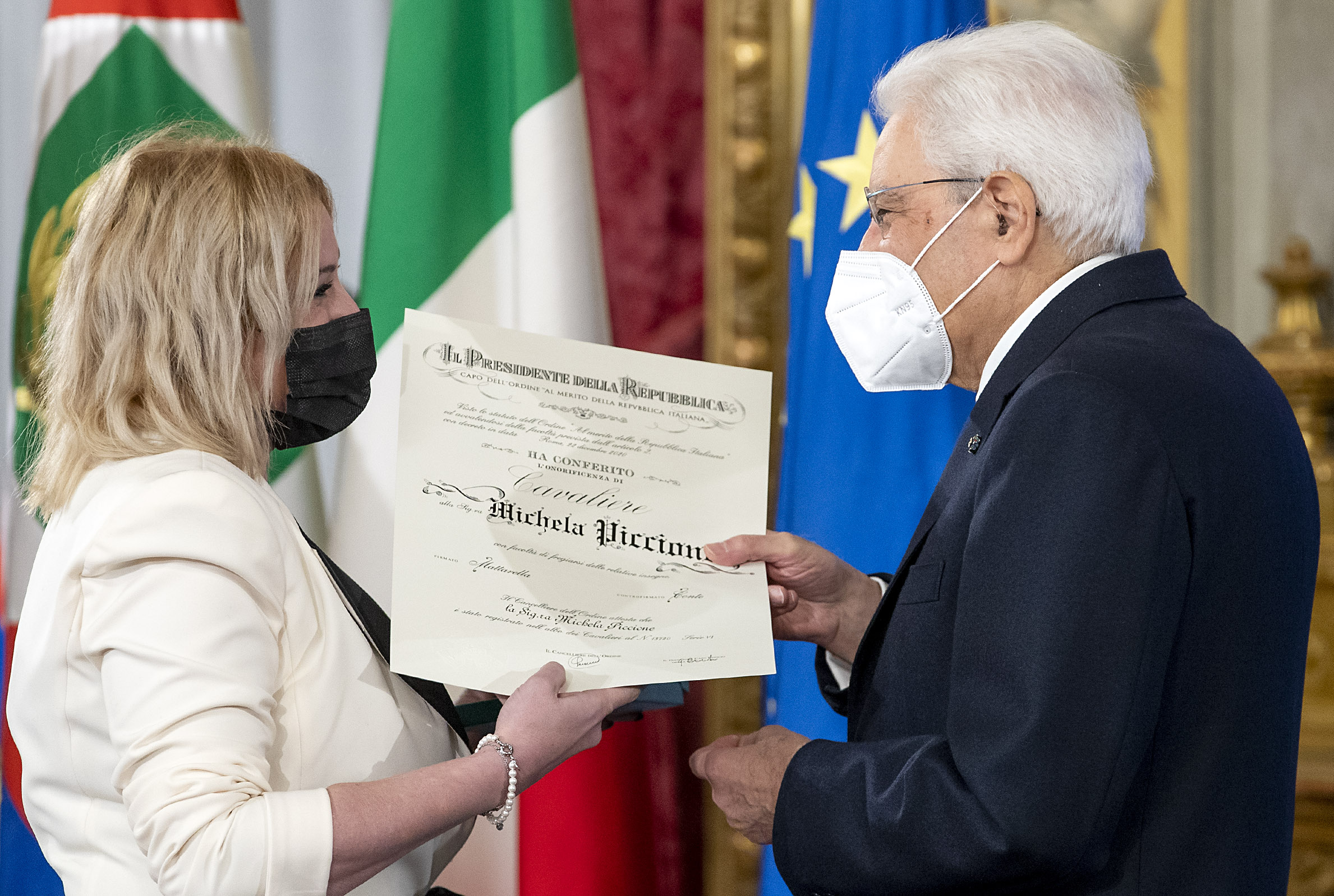 Il Presidente Sergio Mattarella consegna l'onorificenza OMRI “motu proprio” a Michela Piccione