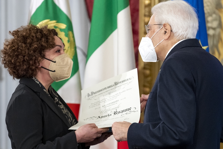 Il Presidente Sergio Mattarella consegna l'onorificenza OMRI “motu proprio” a Angela Buanne