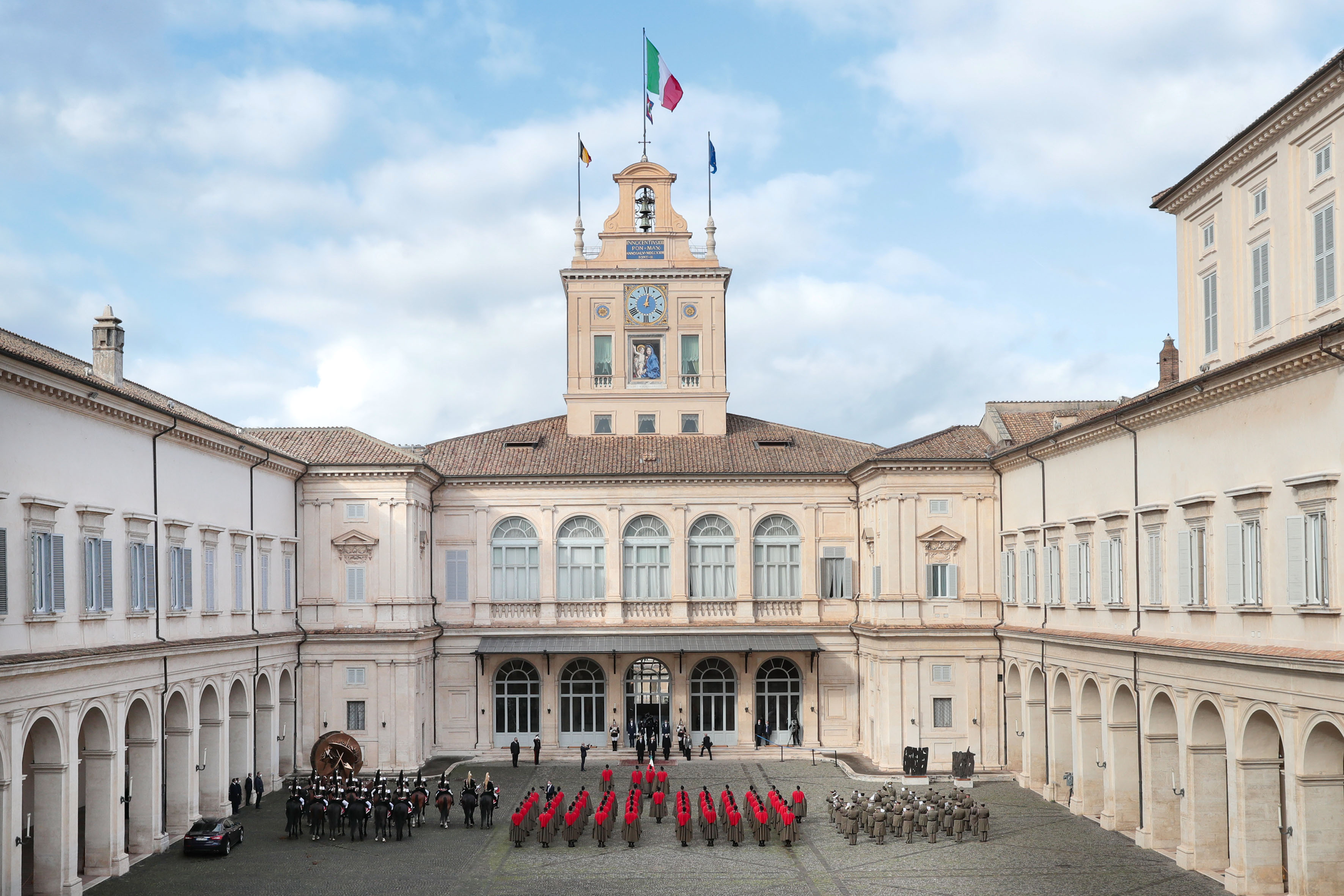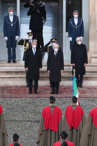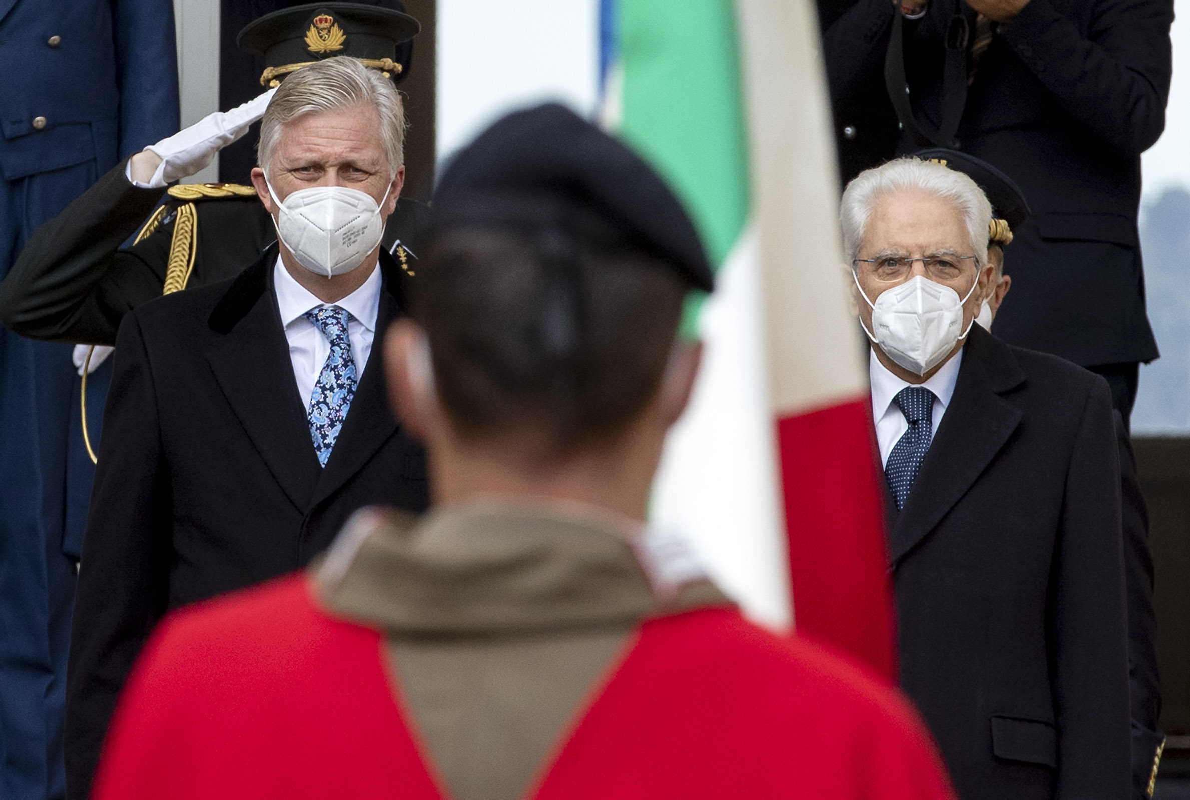 Il Presidente Sergio Mattarella e S.M. il Re Filippo dei Belgi ricevono gli onori militari da parte di un reparto schierato con bandiera e banda