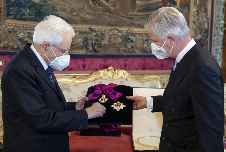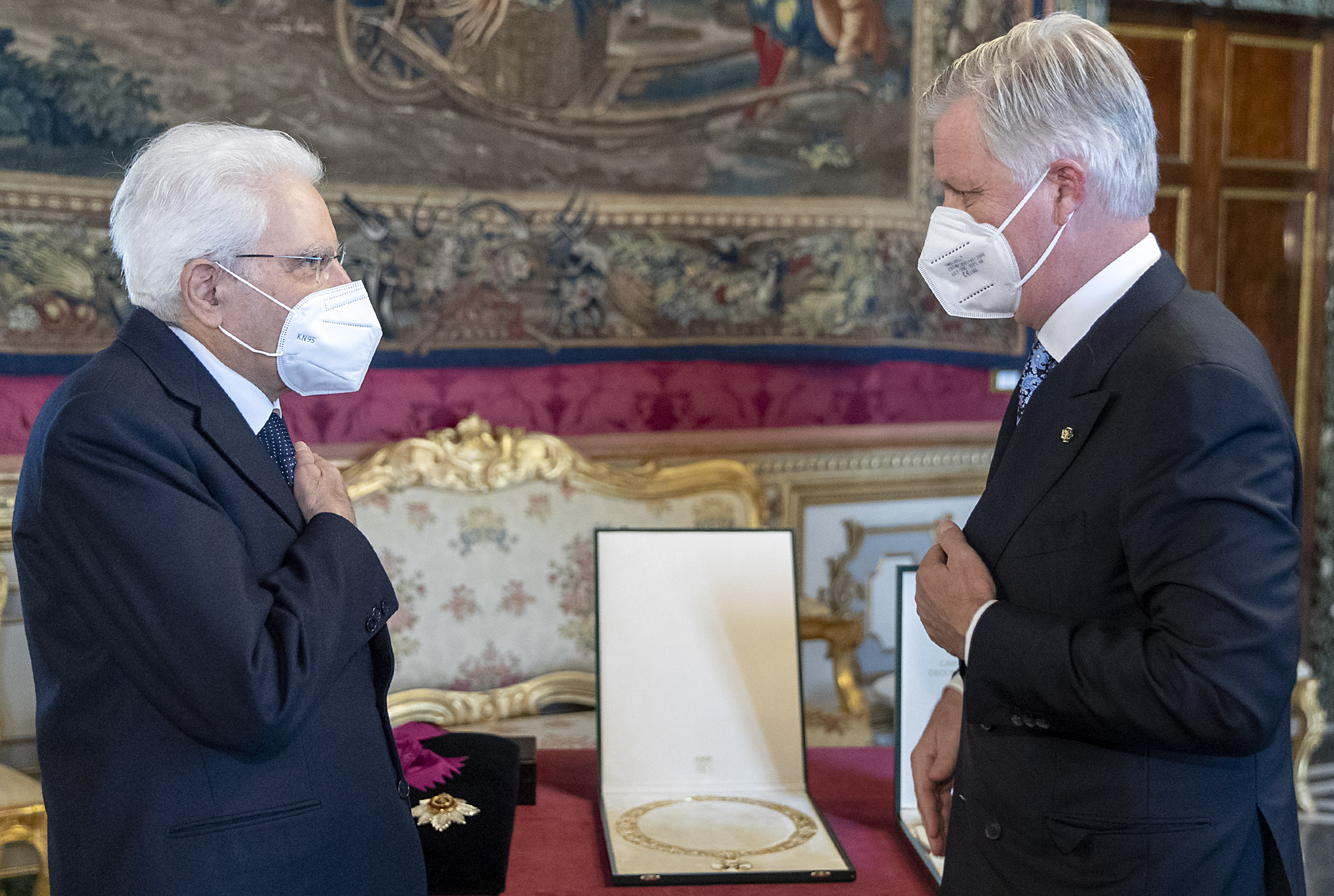 Il Presidente Sergio Mattarella e S.M. il Re Filippo dei Belgi durante lo scambio delle onorificenze