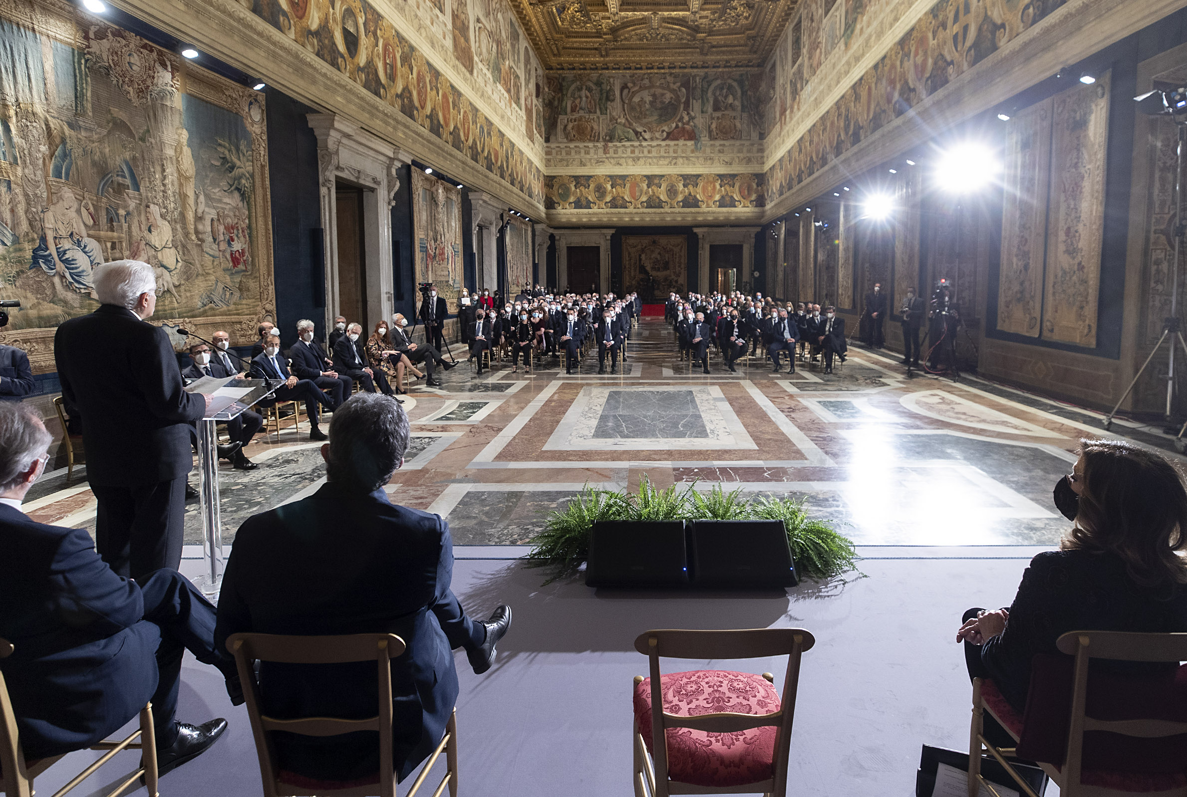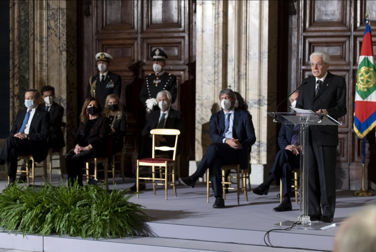 Il Presidente Sergio Mattarella con Maria Elisabetta Alberti Casellati, Presidente del Senato della Repubblica, Roberto Fico, Presidente della Camera dei deputati e Mario Draghi, Presidente del Consiglio dei Ministri, in occasione della cerimonia per lo scambio degli auguri di fine anno con i rappresentanti delle istituzioni, delle forze politiche e della società civile