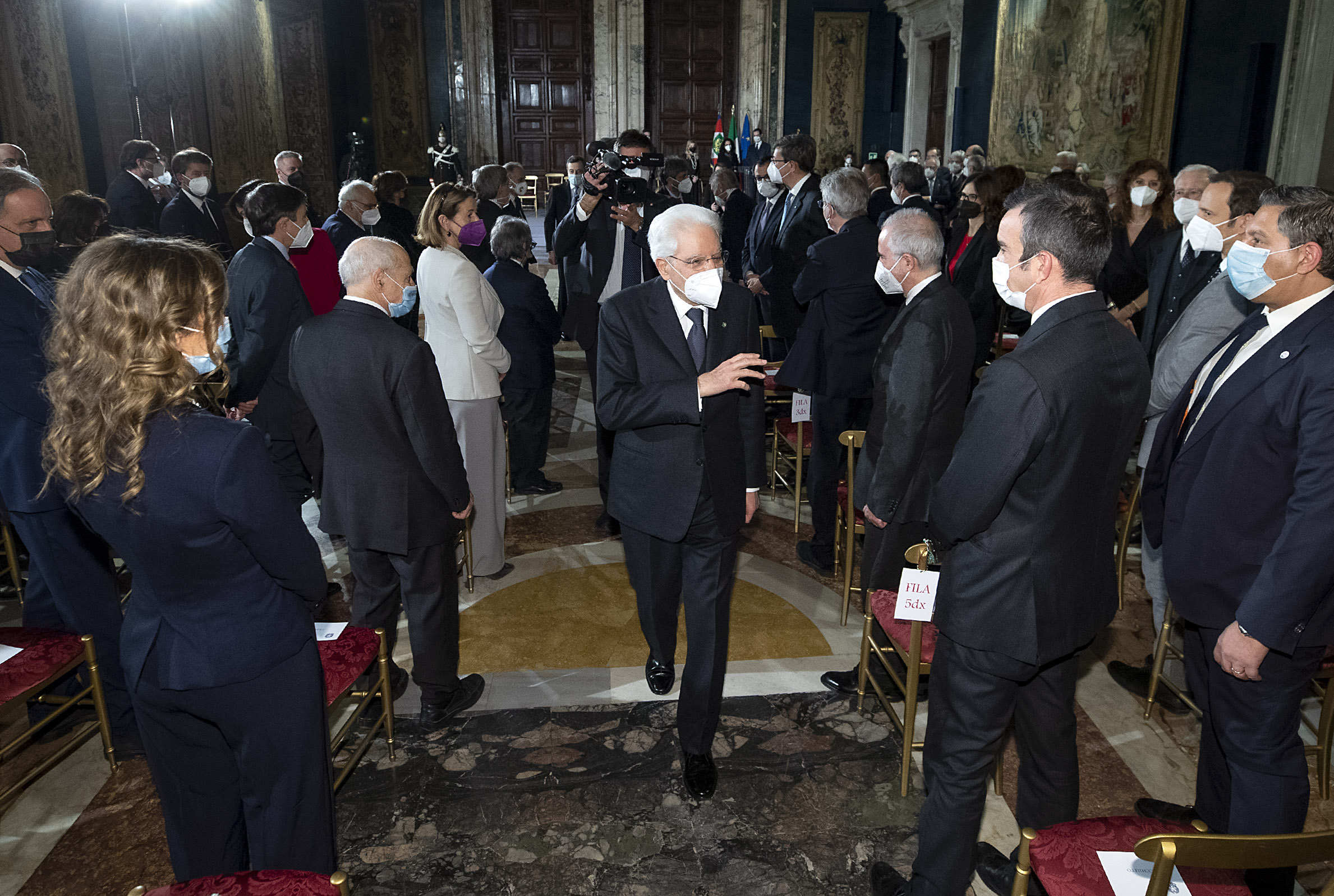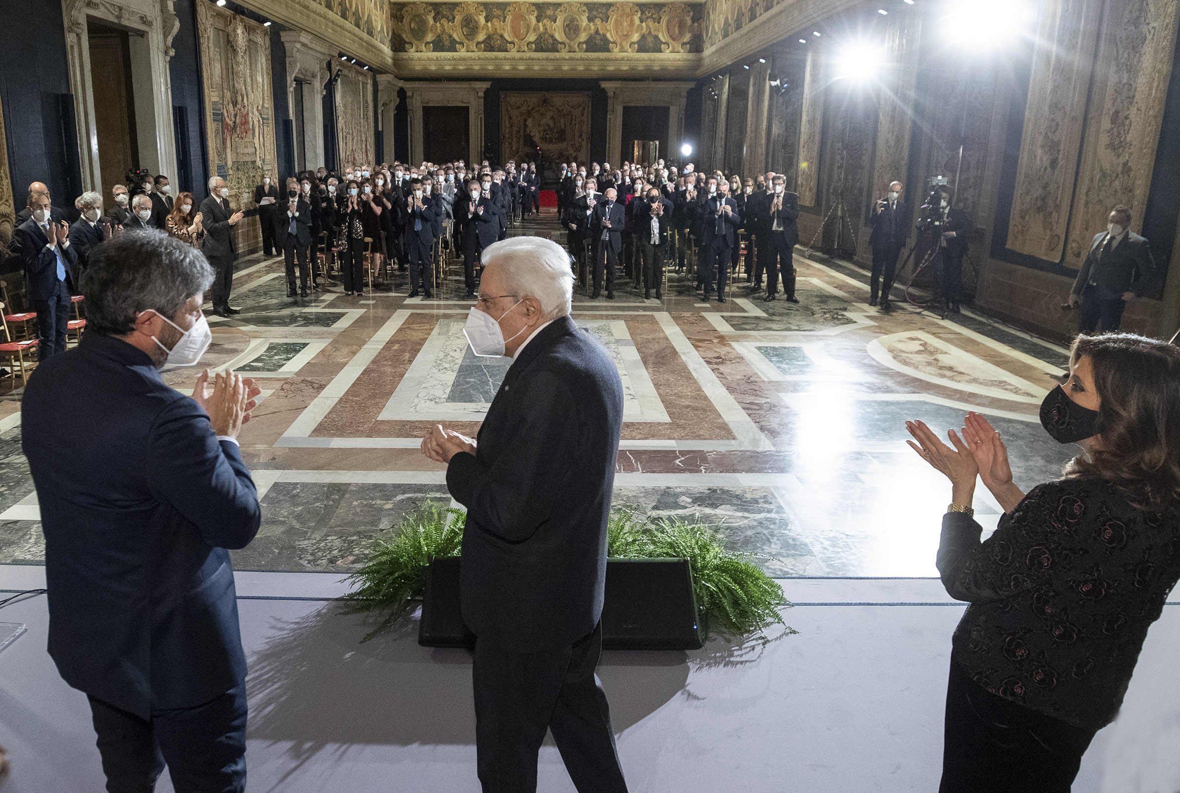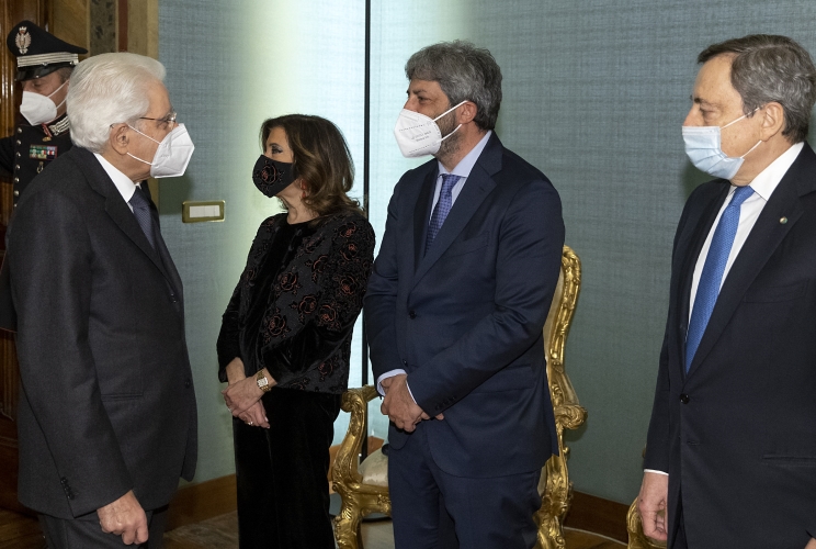 Il Presidente Sergio Mattarella saluta Maria Elisabetta Alberti Casellati, Presidente del Senato della Repubblica, Roberto Fico, Presidente della Camera dei deputati e Mario Draghi, Presidente del Consiglio dei Ministri, in occasione della cerimonia per lo scambio degli auguri di fine anno con i rappresentanti delle istituzioni, delle forze politiche e della società civile